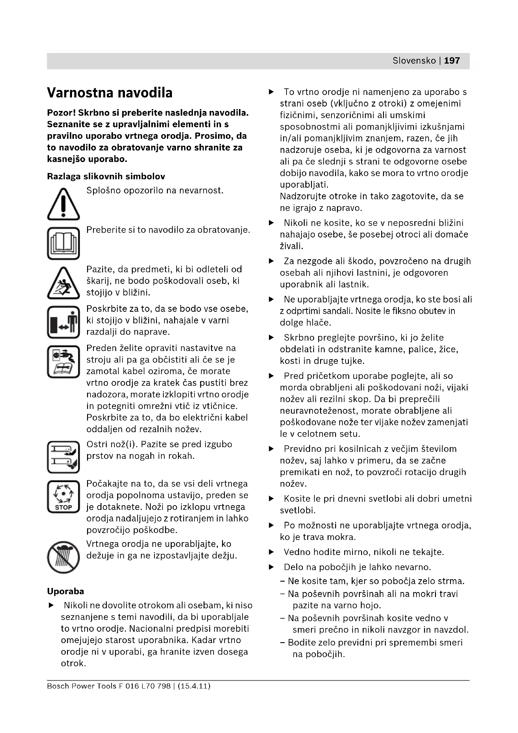 Varnostna navodila Pozor! Skrbno si preberite naslednja navodila. Seznanite se z upravljalnimi elementi in s pravilno uporabo vrtnega orodja. Prosimo, da to navodilo za obratovanje varno shranite za kasnejšo uporabo. Razlaga slikovnih simbolov Splošno opozorilo na nevarnost. Preberite si to navodilo za obratovanje. Pazite, da predmeti, ki bi odleteli od škarij, ne bodo poškodovali oseb, ki stojijo v bližini. Poskrbite za to, da se bodo vse osebe, ki stojijo v bližini, nahajale v varni razdalji do naprave. Preden želite opraviti nastavitve na stroju ali pa ga občistiti ali če se je zamotal kabel oziroma, če morate vrtno orodje za kratek čas pustiti brez nadozora, morate izklopiti vrtno orodje in potegniti omrežni vtič iz vtičnice. Poskrbite za to, da bo električni kabel oddaljen od rezalnih nožev. Ostri nož(i). Pazite se pred izgubo prstov na nogah in rokah. Počakajte na to, da se vsi deli vrtnega orodja popolnoma ustavijo, preden se je dotaknete. Noži po izklopu vrtnega orodja nadaljujejo z rotiranjem in lahko povzročijo poškodbe. Vrtnega orodja ne uporabljajte, ko dežuje in ga ne izpostavljajte dežju. Uporaba f Nikoli ne dovolite otrokom ali osebam, ki niso seznanjene s temi navodili, da bi uporabljale to vrtno orodje. Nacionalni predpisi morebiti omejujejo starost uporabnika. Kadar vrtno orodje ni v uporabi, ga hranite izven dosega otrok. f To vrtno orodje ni namenjeno za uporabo s strani oseb (vključno z otroki) z omejenimi fizičnimi, senzoričnimi ali umskimi sposobnostmi ali pomanjkljivimi izkušnjami in/ali pomanjkljivim znanjem, razen, če jih nadzoruje oseba, ki je odgovorna za varnost ali pa če slednji s strani te odgovorne osebe dobijo navodila, kako se mora to vrtno orodje uporabljati. Nadzorujte otroke in tako zagotovite, da se ne igrajo z napravo. f Nikoli ne kosite, ko se v neposredni bližini nahajajo osebe, še posebej otroci ali domače živali. f Za nezgode ali škodo, povzročeno na drugih osebah ali njihovi lastnini, je odgovoren uporabnik ali lastnik. f Ne uporabljajte vrtnega orodja, ko ste bosi ali z odprtimi sandali. Nosite le fiksno obutev in dolge hlače. f Skrbno preglejte površino, ki jo želite obdelati in odstranite kamne, palice, žice, kosti in druge tujke. f Pred pričetkom uporabe poglejte, ali so morda obrabljeni ali poškodovani noži, vijaki nožev ali rezilni skop. Da bi preprečili neuravnoteženost, morate obrabljene ali poškodovane nože ter vijake nožev zamenjati le v celotnem setu. f Previdno pri kosilnicah z večjim številom nožev, saj lahko v primeru, da se začne premikati en nož, to povzroči rotacijo drugih nožev. f Kosite le pri dnevni svetlobi ali dobri umetni svetlobi. f Po možnosti ne uporabljajte vrtnega orodja, ko je trava mokra. f Vedno hodite mirno, nikoli ne tekajte. f Delo na pobočjih je lahko nevarno. – Ne kosite tam, kjer so pobočja zelo strma. – Na poševnih površinah ali na mokri travi pazite na varno hojo. – Na poševnih površinah kosite vedno v smeri prečno in nikoli navzgor in navzdol. – Bodite zelo previdni pri spremembi smeri na pobočjih. STOP OBJ_BUCH-1393-001.book Page 197 Friday, April 15, 2011 10:36 AM198 | Slovensko F 016 L70 798 | (15.4.11) Bosch Power Tools – Bodite zelo previdni pri ritenski hoji ali vleki vrtnega orodja. – Med košnjo potiskajte vrtno orodje vedno v smeri naprej in ga nikoli ne vlecite v proti telesu. f Noži morajo stati, ko nagnete vrtno orodje za transport ali če prečkate netravnate površine in med transportom vrtnega orodja k površinam, ki jih želite pokositi. f Ne nagibajte vrtnega orodja pri startu ali vklopu motorja, razen če je to potrebno za start v visoki travi. V tem primeru s pritiskom na ročaj ne dvignite več kot je potrebno tiste strani, ki je obrnjena vstran od uporabnika. Pazite na to, da se med spuščanjem vrtnega orodja vaši roki nahajata na ročaju. f Vklopite vrtno orodje, kot je opisano v navodilu za obratovanje in pazite na to, da se bodo vaše noge nahajale dovolj daleč stran od rotirajočih se delov. f Poskrbite za to, da se roki in nogi ne nahajata v bližini ali pod rotirajočimi deli. f Pri delu z vrtnim orodjem se ne približujte se področju izmeta. f Nikoli ne vzdigujte oz. ne nosite vrtnega orodja z vklopljenim motorjem. f Nikoli ne uporabljajte vrtnega orodja s poškodovanimi zaščitnimi pripravami, pokrovi ali brez varnostnih naprav, kot npr. odbojnika in/ali posode za prestrezanje trave. f Pri nastavljanju kosilnice bodite vedno zelo previdni, da bi tako preprečili vpetje rok in nog med premikajočimi se noži in fiksnimi deli naprave kosilnice. f Poskrbite za to, da se električni in podaljševalni kabli ne približajo nožem. Lahko bi poškodovali kable in tako povzročili, da se dotaknite delov, ki so pod napetostjo. Previdno, obstaja nevarnost električnega udara. Potegnite omrežni vtič iz vtičnice v naslednjih primerih: – vedno, ko se oddaljite od vrtnega orodja, – pred odstranitvijo blokad, – med kontrolo ali čiščenjem vrtnega orodja oz. ko neposredno delate na stroju, – po koliziji s tujkom. Preverite vrtno orodje glede na poškodbe in če je potrebno, morate poskrbeti za popravilo v primeru, – če vrtno orodje prične nenavadno vibrirati (takojšnja kontrola). Električni priključek f Napetost električnega vira mora ustrezati podatkom, ki so navedeni na tipski ploščici vrtnega orodja. f Priporočamo, da električno orodje priključite le na vtičnico, ki je zavarovana s tokovno zaščitnim stikalom 30 mA (FI-stikalo). f Za to vrtno ordje oporabite ali nadomestite samo omrežne priključke, ki se skladajo z navedbami proizvajalca; naročniška številka in tip glejte na navodilu za obratovanje. f Omrežnega vtiča se nikoli ne dotaknite z mokrimi rokami. f Ne smete peljati preko omrežnega priključka, ne smete ga stiskati ali vlačiti za njega, saj bi ga lahko poškodovali. Zaščitite kabel pred vročino, oljem in ostrimi robovi. f Prerez podaljševalnega kabla mora ustr