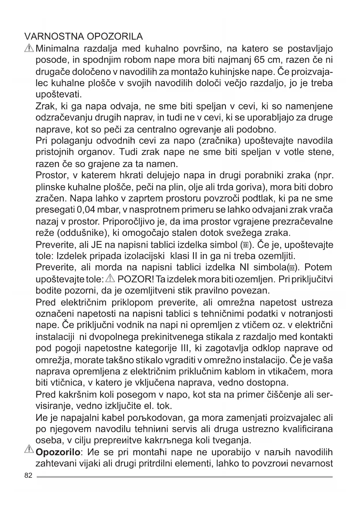 Reciklirajte materijale sa simbolom . Ambalažu za recikliranje odložite u prikladne spremnike. Pomozite u zaštiti okoliša i ljudskog zdravlja, kao i u recikliranju otpada od električnih i elektro- ničkih uređaja. Uređaje označene simbolom ne bacajte zajedno s kućnim otpadom. Proizvod odnesite na lokalno reciklažno mjesto ili kontaktiraje nadležnu službu.81 NAREDBI 1 : prva brzina motora. 0 : motor isključen. > + 2 : druga brzina motora. > + 3 : treća brzina motora. Otvaranje/zatvaranje klizne tipke za podešavanje svjetala Uključi/Isključi. RASVJETA Potrebno je iskopčati napu iz električnog napajanja. Upozorenje! Prije dodirivanja žarulja, uvjerite se da su hladne. Istrošene žarulje zamijenite žaruljama istog tipa (CANDLE LED 4W, 220-240V, E14, ø37mm). ILCOS D code: DRBB/F-4-220-240-E14-37/10082 VARNOSTNA OPOZORILA Minimalna razdalja med kuhalno površino, na katero se postavljajo posode, in spodnjim robom nape mora biti najmanj 65 cm, razen če ni drugače določeno v navodilih za montažo kuhinjske nape. Če proizvaja- lec kuhalne plošče v svojih navodilih določi večjo razdaljo, jo je treba upoštevati. Zrak, ki ga napa odvaja, ne sme biti speljan v cevi, ki so namenjene odzračevanju drugih naprav, in tudi ne v cevi, ki se uporabljajo za druge naprave, kot so peči za centralno ogrevanje ali podobno. Pri polaganju odvodnih cevi za napo (zračnika) upoštevajte navodila pristojnih organov. Tudi zrak nape ne sme biti speljan v votle stene, razen če so grajene za ta namen. Prostor, v katerem hkrati delujejo napa in drugi porabniki zraka (npr. plinske kuhalne plošče, peči na plin, olje ali trda goriva), mora biti dobro zračen. Napa lahko v zaprtem prostoru povzroči podtlak, ki pa ne sme presegati 0,04 mbar, v nasprotnem primeru se lahko odvajani zrak vrača nazaj v prostor. Priporočljivo je, da ima prostor vgrajene prezračevalne reže (oddušnike), ki omogočajo stalen dotok svežega zraka. Preverite, ali JE na napisni tablici izdelka simbol ( ). Če je, upoštevajte tole: Izdelek pripada izolacijski klasi II in ga ni treba ozemljiti. Preverite, ali morda na napisni tablici izdelka NI simbola( ). Potem upoštevajte tole: POZOR! Ta izdelek mora biti ozemljen. Pri priključitvi bodite pozorni, da je ozemljitveni stik pravilno povezan. Pred električnim priklopom preverite, ali omrežna napetost ustreza označeni napetosti na napisni tablici s tehničnimi podatki v notranjosti nape. Če priključni vodnik na napi ni opremljen z vtičem oz. v električni instalaciji ni dvopolnega prekinitvenega stikala z razdaljo med kontakti pod pogoji napetostne kategorije III, ki zagotavlja odklop naprave od omrežja, morate takšno stikalo vgraditi v omrežno instalacijo. Če je vaša naprava opremljena z električnim priklučnim kablom in vtikačem, mora biti vtičnica, v katero je vključena naprava, vedno dostopna. Pred kakršnim koli posegom v napo, kot sta na primer čiščenje ali ser- visiranje, vedno izključite el. tok. Иe je napajalni kabel poљkodovan, ga mora zamenjati proizvajalec ali po njegovem navodilu tehniиni servis ali druga ustrezno kvalifi cirana oseba, v cilju prepreиitve kakrљnega koli tveganja. Opozorilo: Иe se pri montaћi nape ne uporabijo v naљih navodilih zahtevani vijaki ali drugi pritrdilni elementi, lahko to povzroиi nevarnost83 elektriиnih stikov. Montaћa mora biti opravljena v skladu s temi navodili, opraviti jo sme le ustrezno usposobljeno osebje. V bližini nape ne uporabljajte snovi, ki bi lahko povzročile izbruh plamena. Ne uporabljajte naprav z odprtim plamenom pod napo (na alkohol, petrolej in podobno). Pri cvrtju na olju bodite pozorni na pregrevanje olja, da ga ne bi zajel plamen. Odpadno olje je še posebno nevarno. Ne uporabljajte odprte, nepokrite električne rešetke. Da bi se izognili požaru, upoštevajte navodila pri čiščenju maščobnega fi ltra in odstranjevanju maščob iz drugih delov naprave. To napravo smejo uporabljati otroci, starejši od 8 let, kot tudi osebe z zmanjšanimi fi zičnimi, senzoričnimi ter umskimi zmogljivostmi ali po- manjkljivimi izkušnjami in znanjem, vendar samo, če napravo uporabljajo pod ustreznim nadzorom, če so prejeli ustrezna navodila o varni uporabi naprave in če so poučeni o nevarnostih neustrezne uporabe. Poskrbite, da se otroci ne bodo igrali z napravo. Otroci naj ne čistijo naprave ali izvajajo vzdrževalna opravila na le-tej brez ustreznega nadzora. OPOZORILO: Med delovanjem kuhalne plošče lahko postanejo dostopni deli naprave vroči. Ta kuhinjska napa se uporablja v gospodinjstvu, vgrajena je nad kuhalne naprave, ki jih prav tako uporabljamo v gospodinjstvu. UPORABA FILTRIRNE ALI ODVODNE? Napo je moћno namestiti v fi ltrirni ali odvodni razliиici. Ћe na samem zaиetku je treba doloиiti vr- sto namestitve. V kolikor je to moћno, priporoиamo doloиitev in izvedbo odvodne razliиice namestitve nape, ki omogoиa veиjo uиinkovitost. Odvodna razliиica Napa vsesava zrak, ki vsebuje izparine in vonjave, in ga odvaja navzven skozi izhodno cev. Filtrirna razliиica Napa vsesava zrak, ki vsebuje izparine in vonjave, иisti zrak s pomoиjo fi ltra in ga oиiљиenega vraиa nazaj v prostor.