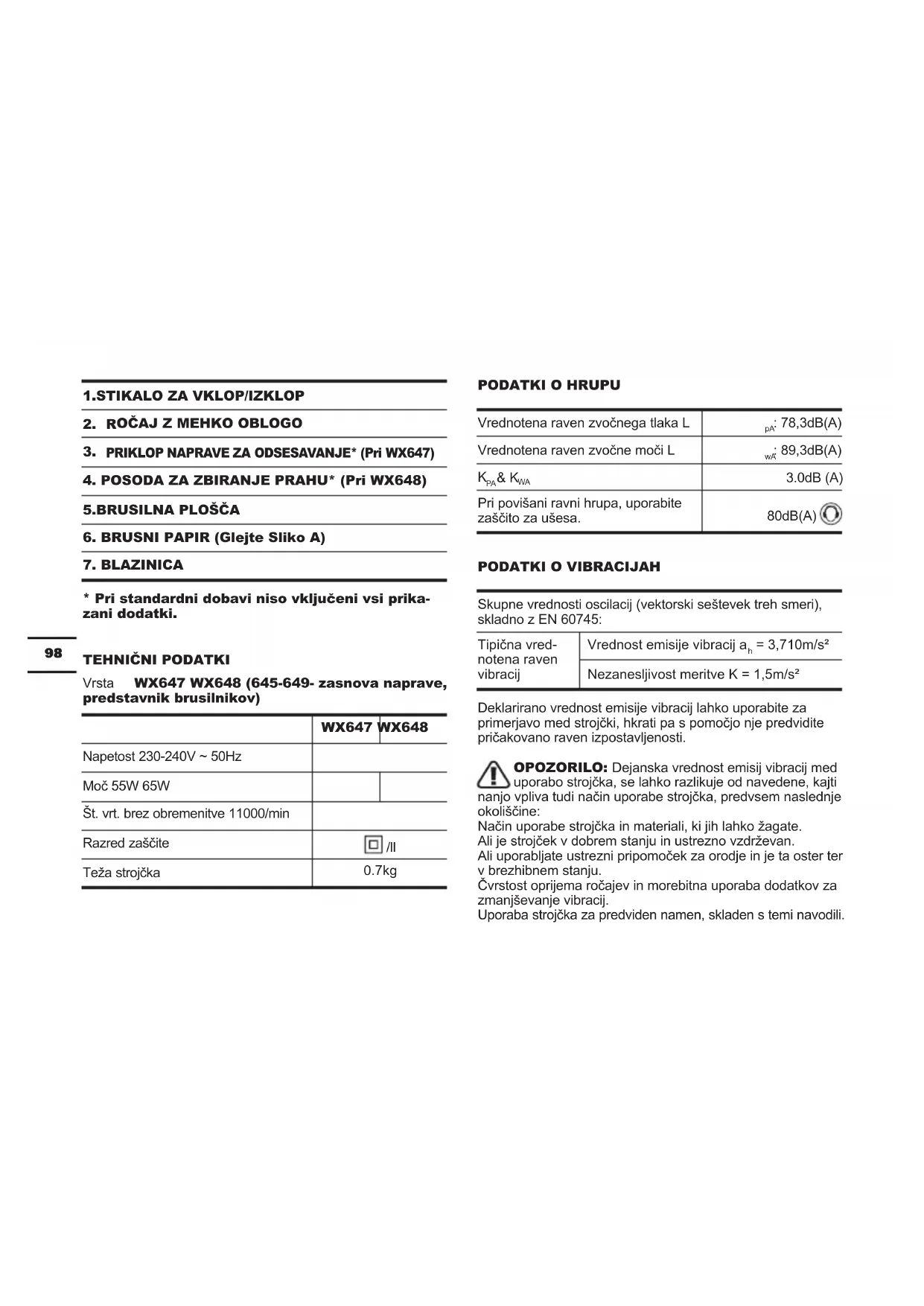 Delo si organizirajte tako, da boste opravila z visoko ravnjo vibracij izvajali v več fazah, tekom nekaj dni. DODATKI WX647 WX648 Samostoječi brusni papir (perforiran) 6 kosov 9 kosov brusni papir, ki je namenjen odstran- jevanju premazov 3 kosi 6 kosov komplet brusnih papirjev za ročno brušenje 3 kosi 6 kosov blazinica 1 kos 1 kos priklop naprave za odsesavanje 1 kos / posoda za zbiranje prahu / 1 kos Priporočamo vam, da dodatke vedno kupujete v isti trgovini, kot ste kupili orodje. Za podrobnosti si oglejte razlage na embalaži kompleta dodatkov. Pri odločanju o ustreznem dodatku, vam lahko pomaga tudi osebje v trgovini.