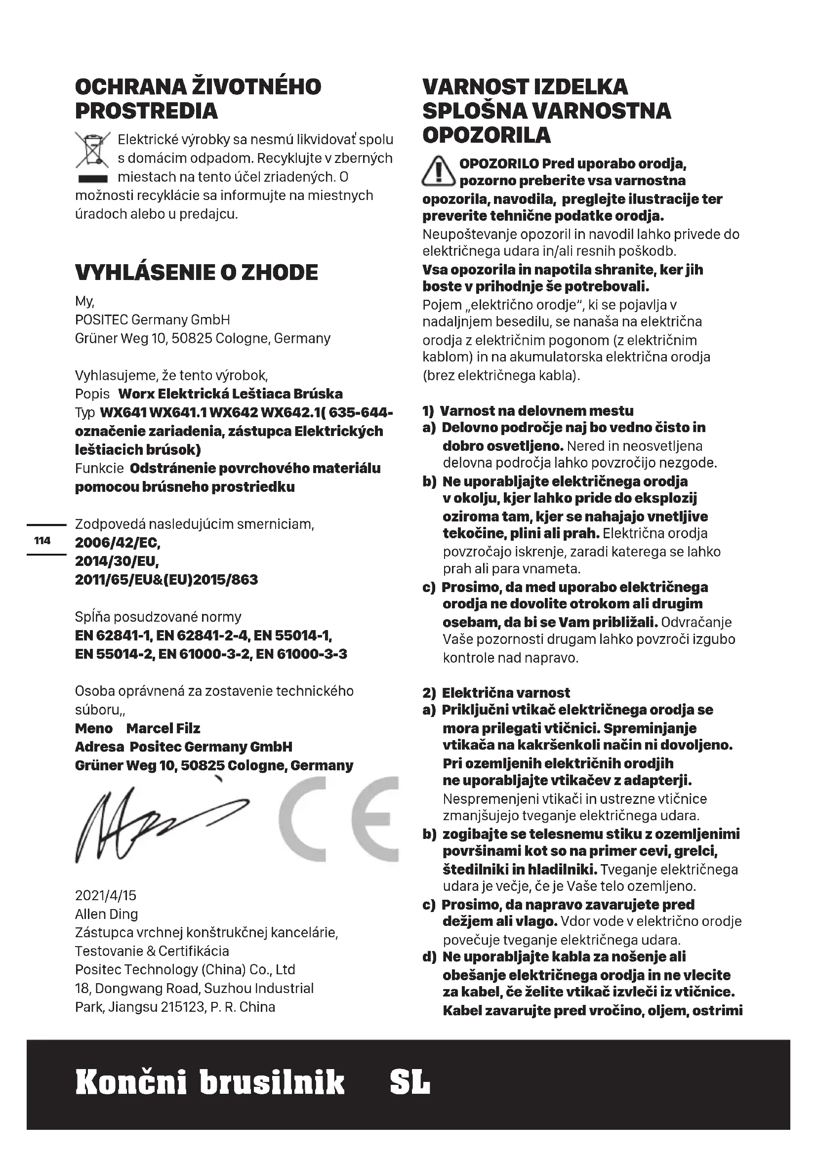 a) Vaše električno orodje naj popravlja le kvalificirano strokovno osebje, ki uporablja originalne nadomestne dele. Tako bo zagotovljena predpisana varna uporaba orodja. SIMBOLI Zaradi zmanjševanja nevarnosti poškodb, se temeljito seznanite z navodili za uporabo Dvojna izolacija Opozorilo Uporabljajte zaščito za ušesa Uporabljajte zaščito za oči Nosite zaščitno masko za prah Odpadnih električnih naprav ne smete zavreči skupaj z ostalimi gospodinjskimi odpadki. Dostavite jih na mesto za ločeno zbiranje odpadkov. Glede podrobnosti, se posvetujte z lokalno službo za ravnanje z odpadki.117 Končni brusilnik SL
