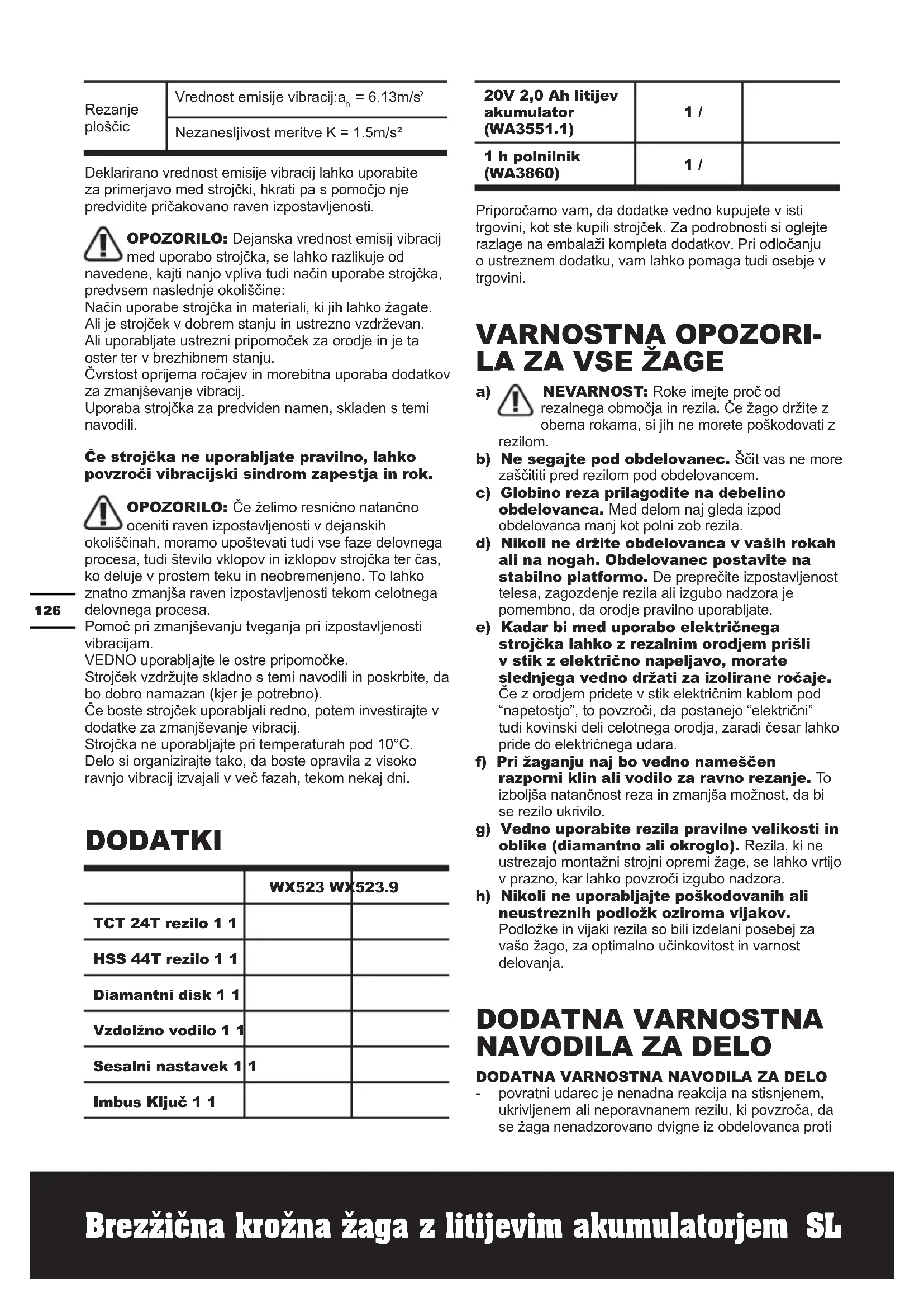 Nezanesljivost meritve K = 1.5m/s² Deklarirano vrednost emisije vibracij lahko uporabite za primerjavo med strojčki, hkrati pa s pomočjo nje predvidite pričakovano raven izpostavljenosti. OPOZORILO: Dejanska vrednost emisij vibracij med uporabo strojčka, se lahko razlikuje od navedene, kajti nanjo vpliva tudi način uporabe strojčka, predvsem naslednje okoliščine: Način uporabe strojčka in materiali, ki jih lahko žagate. Ali je strojček v dobrem stanju in ustrezno vzdrževan. Ali uporabljate ustrezni pripomoček za orodje in je ta oster ter v brezhibnem stanju. Čvrstost oprijema ročajev in morebitna uporaba dodatkov za zmanjševanje vibracij. Uporaba strojčka za predviden namen, skladen s temi navodili. Če strojčka ne uporabljate pravilno, lahko povzroči vibracijski sindrom zapestja in rok. OPOZORILO: Če želimo resnično natančno oceniti raven izpostavljenosti v dejanskih okoliščinah, moramo upoštevati tudi vse faze delovnega procesa, tudi število vklopov in izklopov strojčka ter čas, ko deluje v prostem teku in neobremenjeno. To lahko znatno zmanjša raven izpostavljenosti tekom celotnega delovnega procesa. Pomoč pri zmanjševanju tveganja pri izpostavljenosti vibracijam. VEDNO uporabljajte le ostre pripomočke. Strojček vzdržujte skladno s temi navodili in poskrbite, da bo dobro namazan (kjer je potrebno). Če boste strojček uporabljali redno, potem investirajte v dodatke za zmanjševanje vibracij. Strojčka ne uporabljajte pri temperaturah pod 10°C. Delo si organizirajte tako, da boste opravila z visoko ravnjo vibracij izvajali v več fazah, tekom nekaj dni. DODATKI WX523 WX523.9 TCT 24T rezilo 1 1 HSS 44T rezilo 1 1 Diamantni disk 1 1 Vzdolžno vodilo 1 1 Sesalni nastavek 1 1 Imbus Ključ 1 1 20V 2,0 Ah litijev akumulator (WA3551.1) 1 / 1 h polnilnik (WA3860) 1 / Priporočamo vam, da dodatke vedno kupujete v isti trgovini, kot ste kupili strojček. Za podrobnosti si oglejte razlage na embalaži kompleta dodatkov. Pri odločanju o ustreznem dodatku, vam lahko pomaga tudi osebje v trgovini. VARNOSTNA OPOZORI-