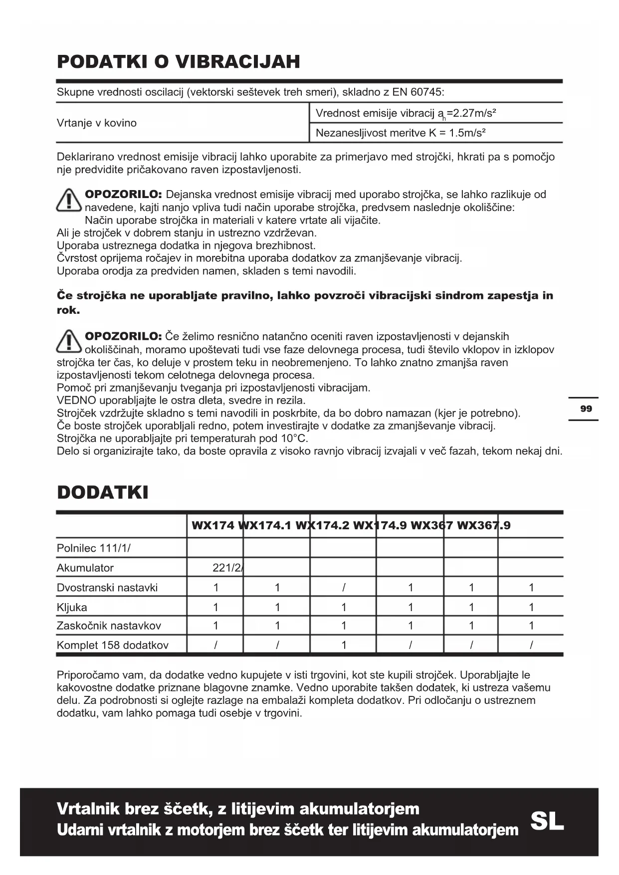 =2.27m/s² Nezanesljivost meritve K = 1.5m/s² Deklarirano vrednost emisije vibracij lahko uporabite za primerjavo med strojčki, hkrati pa s pomočjo nje predvidite pričakovano raven izpostavljenosti. OPOZORILO: Dejanska vrednost emisije vibracij med uporabo strojčka, se lahko razlikuje od navedene, kajti nanjo vpliva tudi način uporabe strojčka, predvsem naslednje okoliščine: Način uporabe strojčka in materiali v katere vrtate ali vijačite. Ali je strojček v dobrem stanju in ustrezno vzdrževan. Uporaba ustreznega dodatka in njegova brezhibnost. Čvrstost oprijema ročajev in morebitna uporaba dodatkov za zmanjševanje vibracij. Uporaba orodja za predviden namen, skladen s temi navodili. Če strojčka ne uporabljate pravilno, lahko povzroči vibracijski sindrom zapestja in rok. OPOZORILO: Če želimo resnično natančno oceniti raven izpostavljenosti v dejanskih okoliščinah, moramo upoštevati tudi vse faze delovnega procesa, tudi število vklopov in izklopov strojčka ter čas, ko deluje v prostem teku in neobremenjeno. To lahko znatno zmanjša raven izpostavljenosti tekom celotnega delovnega procesa. Pomoč pri zmanjševanju tveganja pri izpostavljenosti vibracijam. VEDNO uporabljajte le ostra dleta, svedre in rezila. Strojček vzdržujte skladno s temi navodili in poskrbite, da bo dobro namazan (kjer je potrebno). Če boste strojček uporabljali redno, potem investirajte v dodatke za zmanjševanje vibracij. Strojčka ne uporabljajte pri temperaturah pod 10°C. Delo si organizirajte tako, da boste opravila z visoko ravnjo vibracij izvajali v več fazah, tekom nekaj dni. DODATKI WX174 WX174.1 WX174.2 WX174.9 WX367 WX367.9 Polnilec 1 1 1 / 1 / Akumulator 2 2 1 / 2 / Dvostranski nastavki 1 1 / 1 1 1 Kljuka 1 1 1 1 1 1 Zaskočnik nastavkov 1 1 1 1 1 1 Komplet 158 dodatkov / / 1 / / / Priporočamo vam, da dodatke vedno kupujete v isti trgovini, kot ste kupili strojček. Uporabljajte le kakovostne dodatke priznane blagovne znamke. Vedno uporabite takšen dodatek, ki ustreza vašemu delu. Za podrobnosti si oglejte razlage na embalaži kompleta dodatkov. Pri odločanju o ustreznem dodatku, vam lahko pomaga tudi osebje v trgovini.100 Vrtalnik brez ščetk, z litijevim akumulatorjem Udarni vrtalnik z motorjem brez ščetk ter litijevim akumulatorjem