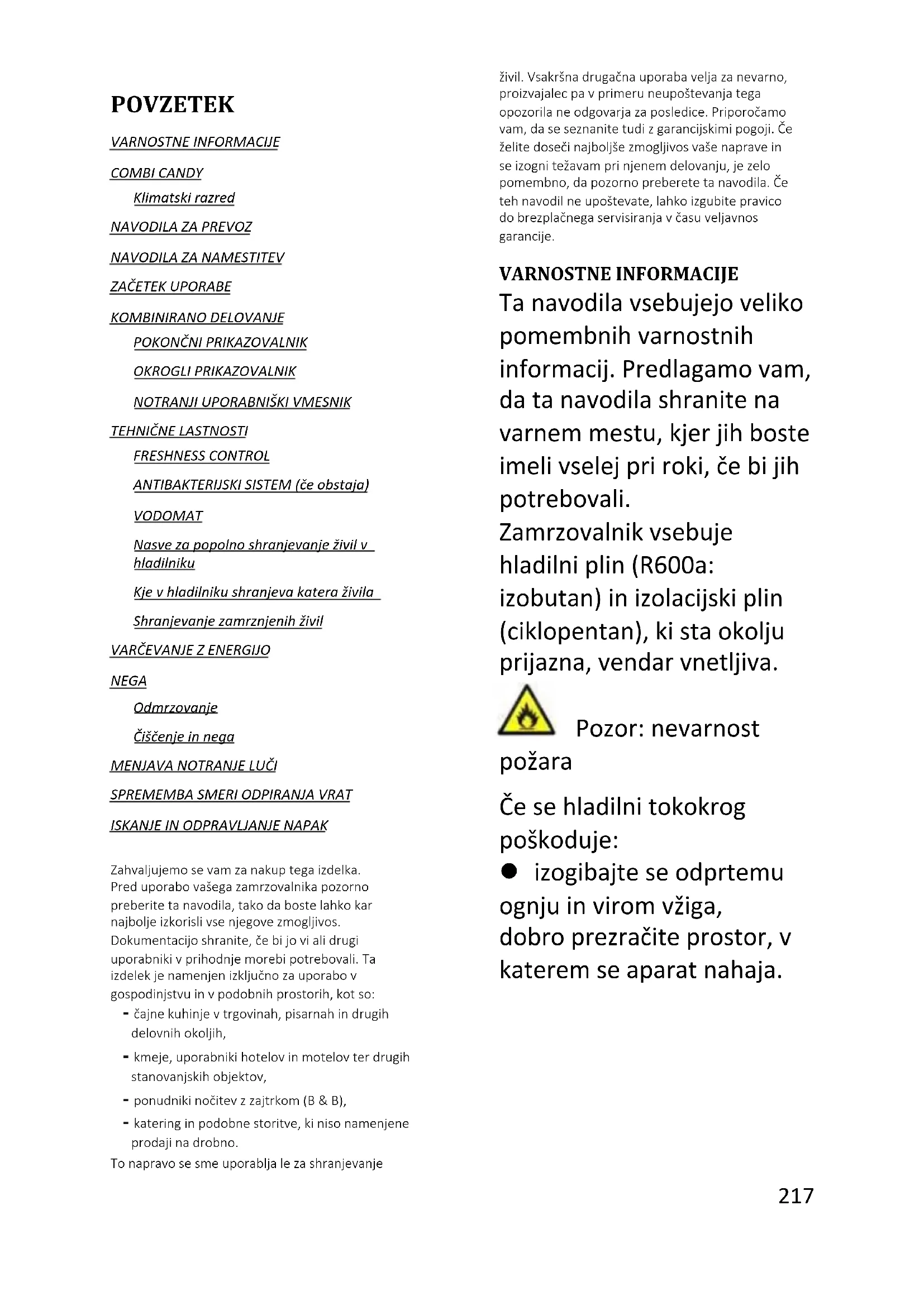 Zgodność Umieszczając znak na tym produkcie, potwierdzamy jego zgodność z odpowiednimi wymogami europejskimi w zakresie bezpieczeństwa, zdrowia oraz ochrony środowiska stosowanymi w prawodawstwie dotyczącym tego produktu.217 Slovenščina POVZETEK VARNOSTNE INFORMACIJE COMBI CANDY Klimatski razred NAVODILA ZA PREVOZ NAVODILA ZA NAMESTITEV ZAČETEK UPORABE KOMBINIRANO DELOVANJE POKONČNI PRIKAZOVALNIK OKROGLI PRIKAZOVALNIK NOTRANJI UPORABNIŠKI VMESNIK TEHNIČNE LASTNOSTI FRESHNESS CONTROL ANTIBAKTERIJSKI SISTEM (če obstaja) VODOMAT Nasveti za popolno shranjevanje živil v hladilniku Kje v hladilniku shranjevati katera živila Shranjevanje zamrznjenih živil VARČEVANJE Z ENERGIJO NEGA Odmrzovanje Čiščenje in nega MENJAVA NOTRANJE LUČI SPREMEMBA SMERI ODPIRANJA VRAT ISKANJE IN ODPRAVLJANJE NAPAK Zahvaljujemo se vam za nakup tega izdelka. Pred uporabo vašega zamrzovalnika pozorno preberite ta navodila, tako da boste lahko kar najbolje izkoristili vse njegove zmogljivosti. Dokumentacijo shranite, če bi jo vi ali drugi uporabniki v prihodnje morebiti potrebovali. Ta izdelek je namenjen izključno za uporabo v gospodinjstvu in v podobnih prostorih, kot so: - čajne kuhinje v trgovinah, pisarnah in drugih delovnih okoljih, - kmetije, uporabniki hotelov in motelov ter drugih stanovanjskih objektov, - ponudniki nočitev z zajtrkom (B & B), - katering in podobne storitve, ki niso namenjene prodaji na drobno. To napravo se sme uporabljati le za shranjevanje živil. Vsakršna drugačna uporaba velja za nevarno, proizvajalec pa v primeru neupoštevanja tega opozorila ne odgovarja za posledice. Priporočamo vam, da se seznanite tudi z garancijskimi pogoji. Če želite doseči najboljše zmogljivosti vaše naprave in se izogniti težavam pri njenem delovanju, je zelo pomembno, da pozorno preberete ta navodila. Če teh navodil ne upoštevate, lahko izgubite pravico do brezplačnega servisiranja v času veljavnosti garancije. VARNOSTNE INFORMACIJE Ta navodila vsebujejo veliko pomembnih varnostnih informacij. Predlagamo vam, da ta navodila shranite na varnem mestu, kjer jih boste imeli vselej pri roki, če bi jih potrebovali. Zamrzovalnik vsebuje hladilni plin (R600a: izobutan) in izolacijski plin (ciklopentan), ki sta okolju prijazna, vendar vnetljiva. Pozor: nevarnost požara Če se hladilni tokokrog poškoduje: izogibajte se odprtemu ognju in virom vžiga, dobro prezračite prostor, v katerem se aparat nahaja. Čas delovanja v odstotkih:218 OPOZORILO! Med čiščenjem/prenašanjem aparata pazite, da se ne dotaknete kovinskih žic kondenzatorja na zadnji strani aparata, saj si pri tem lahko poškodujete prste in roke ali pa povzročite poškodbe izdelka. Ta aparat ni namenjen za zlaganje pod ali na druge aparate. Ne poskušajte se usesti ali stopiti na vrh vašega aparata, saj ni temu namenjen. Pri tem lahko poškodujete sebe ali aparat. Pazite, da med prenašanjem ali prestavljanjem aparata pod njim ne ukleščite priključnega kabla, saj ga s tem lahko odrežete ali poškodujete. Pri nameščanju aparata pazite, da ne poškodujete talnih oblog, cevi, stenskih oblog ipd. Aparata ne prestavljajte tako, da ga vlečete za pokrov ali ročaj. Ne pustite otrokom, da bi se igrali z aparatom ali posegali v njegove nastavitve. Naša družba zavrača vsakršno odgovornost v primeru neupoštevanja navodil. Aparata ne nameščajte na vlažno, mastno ali prašno mesto in ne izpostavljajte ga neposredni sončni svetlobi ali vodi. Aparata ne nameščajte v bližino grelnikov ali vnetljivih materialov. V primeru izpada električne energije ne odpirajte pokrova. Če izpad ne traja dlje kot 20 ur, to ne bi smelo vplivati na zamrznjena živila. Če izpad električne energije traja dlje, živila preverite in jih takoj pojejte ali pa jih skuhajte in nato zamrznite. Če pokrov zamrzovalne skrinje težko odprete takoj po tem, ko ste ga pravkar zaprli, ne skrbite. To je posledica razlike v tlaku, ki se izenači in po219 nekaj minutah omogoči normalno odpiranje pokrova. Aparata ne priključujte na električno napajanje, dokler ne odstranite vseh zaščit, ki so bile potrebne zaradi pakiranja in prevoza. Preden aparat vključite, ga pustite najmanj 4 ure mirovati, da se olje v kompresorju posede, če ste aparat prevažali v vodoravni legi. Zamrzovalnik uporabljajte le za predvidene namene (in sicer za shranjevanje in zamrzovanje užitnih živil). V vinski vitrini ne shranjujte zdravil ali snovi za raziskovalne namene. Če snovi, ki jih shranjujete, zahtevajo strogi nadzor temperature shranjevanja, se lahko pokvarijo ali pa pride do nenadzorovane reakcije, ki je lahko nevarna. Pred kakršnimi koli posegi iztaknite vtič priključnega kabla iz omrežne vtičnice. Ob dostavi se prepričajte, da izdelek ni poškodovan ter da so vsi sestavni deli in dodatki brezhibno ohranjeni. Če opazite puščanje hladilnega sistema, se ne dotikajte stenske vtičnice in ne uporabljajte odprtega ognja. Odprite okno in prezračite prostor. Nato pokličite serviserja zaradi popravila. Ne uporabljajte podaljškov ali adapterjev. Priključnega kabla ne vlecite premočno in ne zvijajte ga ter ne dotikajte se vtiča z mokrimi rokami. Pazite, da ne poškodujete vtiča in/ali priključnega kabla, saj to lahko povzroči električni udar ali požar. Ne postavljajte ali shranjujte vnetljivih in zelo hlapnih snovi, kot so eter, bencin, UNP, propan, aerosolni220 razpršilci, lepila, čisti alkohol ipd. Te snovi lahko povzročijo eksplozijo. Če je električni kabel poškodovan, ga mora zamenjati izdelovalec, tehnik za servis ali podobno kvalificiran tehnik, da se izognete tveganju. V bližini vinske vitrine ne uporabljajte in ne shranjujte vnetljivih razpršil, kot so barve v razpršilu. To lahko povzroči eksplozijo ali požar. Na vrh aparata ne postavljajte predmetov in/ali posod, napolnjenih z vodo. Odsvetuje se uporaba podaljškov in razdelilnih letev. Aparata ne mečite v ogenj. Pazite, da med prevozom in med uporabo ne poškodujete hladi
