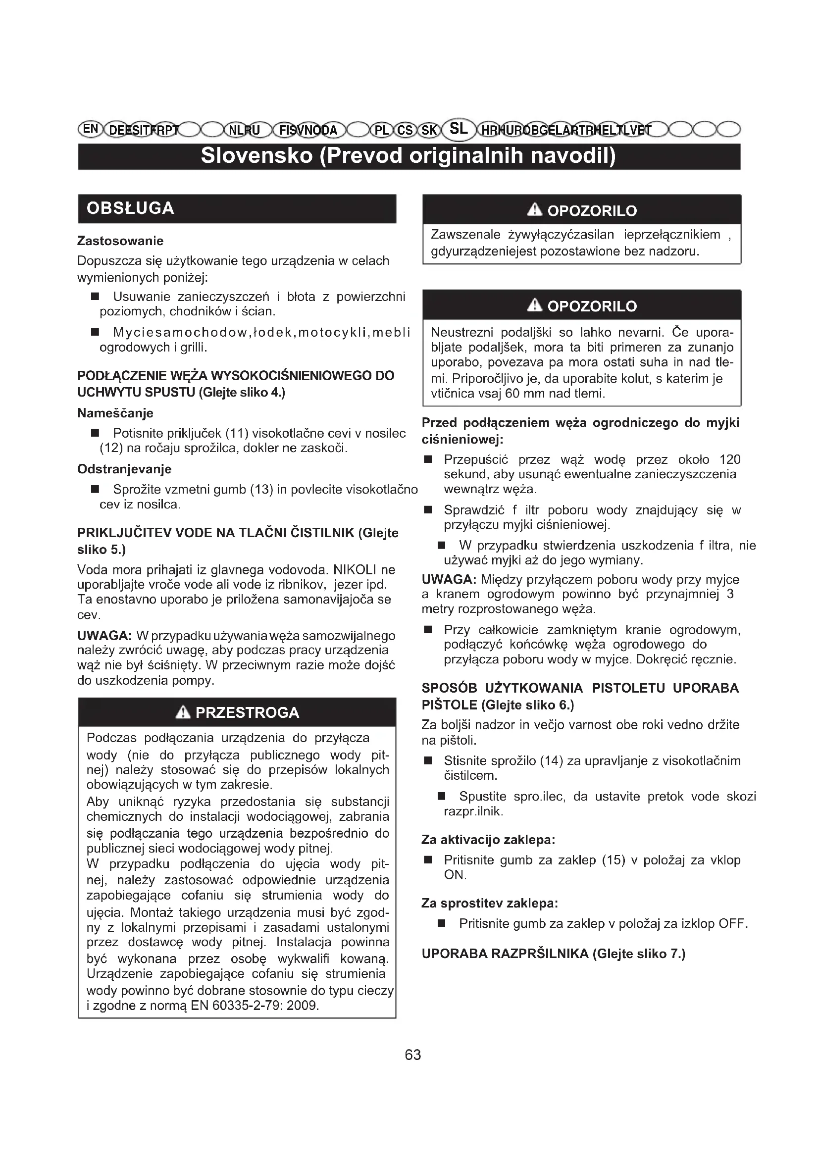 (Glejte sliko 10.) PRZESTROGA Črpalke ne zaženite, če dovod vode ni priključen in vklopljen. Vrtno cev odprite, nato stisnite visokotlačni sprožilec, da sprostite zračni tlak. KO se pojavi enakomeren curek vode, sprožilec spustite. KO zagotovite, da je stikalo v položaju OFF (izklopljeno), tlačni čistilnik priključite v napajanje. Za zagon motorja postavite stikalo v položaj za vklop ON(I). Vklopite vrtno cev in nato stisnite sprožilec čistilca. MAINTENANCE OPOZORILO Pri servisiranju uporabljajte le identične nadomestne dele. Uporaba drugih delov lahko pomeni tveganje ali povzroči škodo na izdelku. OPOZORILO Pred preverjanjem, čiščenjem ali servisiranjem stroja, izklopite motor, počakajte, da se vsi gibljivi deli zaustavijo in izklopite vtič iz vira napajanja. Neupoštevanje teh navodil lahko povzroči hude tele- sne poškodbe ali materialno škodo.