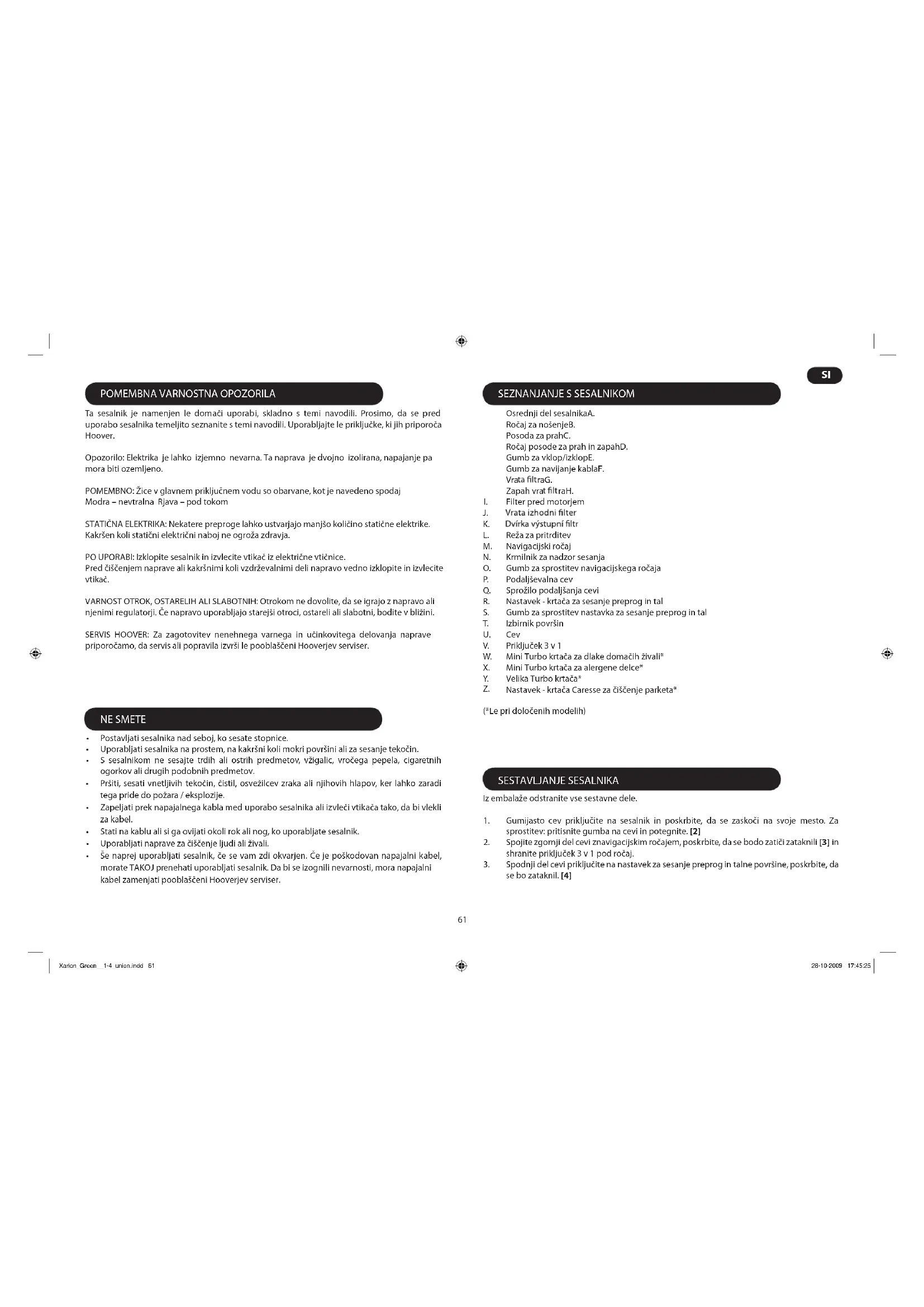 (*Le pri določenih modelih) Iz embalaže odstranite vse sestavne dele. Gumijasto cev priključite na sesalnik in poskrbite, da se zaskoči na svoje mesto. Za 1. sprostitev: pritisnite gumba na cevi in potegnite. [2] Spojite zgornji del cevi znavigacijskim ročajem, poskrbite, da se bodo zatiči zataknili 2. [3] in shranite priključek 3 v 1 pod ročaj. Spodnji del cevi priključite na nastavek za sesanje preprog in talne površine, poskrbite, da 3. se bo zataknil. [4] Postavljati sesalnika nad seboj, ko sesate stopnice.• Uporabljati sesalnika na prostem, na kakršni koli mokri površini ali za sesanje tekočin.• S sesalnikom ne sesajte trdih ali ostrih predmetov, vžigalic, vročega pepela, cigaretnih • ogorkov ali drugih podobnih predmetov. Pršiti, sesati vnetljivih tekočin, čistil, osvežilcev zraka ali njihovih hlapov, ker lahko zaradi • tega pride do požara / eksplozije. Zapeljati prek napajalnega kabla med uporabo sesalnika ali izvleči vtikača tako, da bi vlekli • za kabel. Stati na kablu ali si ga ovijati okoli rok ali nog, ko uporabljate sesalnik.• Uporabljati naprave za čiščenje ljudi ali živali.• Še naprej uporabljati sesalnik, če se vam zdi okvarjen. Če je poškodovan napajalni kabel, • morate TAKOJ pr enehati uporabljati sesalnik. Da bi se izognili nevarnosti, mora napajalni kabel zamenjati pooblaščeni Hooverjev serviser. Xarion_Green__1-4_union.indd 61 28-10-2009 17:45:25 Z.62