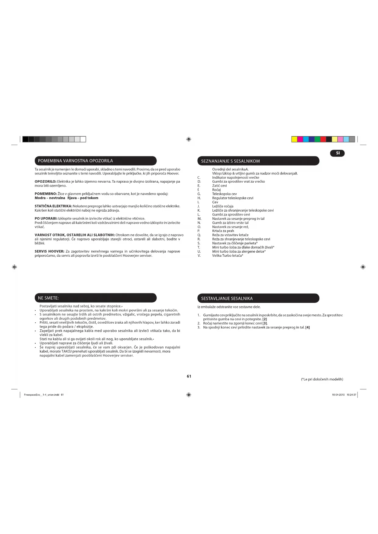 Ta sesalnik je namenjen le domači uporabi, skladno s temi navodili. Prosimo, da se pred uporabo sesalnik temeljito seznanite s temi navodili. Uporabljajte le priključke, ki jih priporoča Hoover. OPOZORILO: Elektrika je lahko izjemno nevarna. Ta naprava je dvojno izolirana, napajanje pa mora biti ozemljeno. POMEMBNO: Žice v glavnem priključnem vodu so obarvane, kot je navedeno spodaj: Modra – nevtralna Rjava – pod tokom STATIČNA ELEKTRIKA: Nekatere preproge lahko ustvarjajo manjšo količino statične elektrike. Kakršen koli statični električni naboj ne ogroža zdravja. PO UPORABI: Izklopite sesalnik in izvlecite vtikač iz električne vtičnice. Pred čiščenjem naprave ali kakršnimi koli vzdrževalnimi deli napravo vedno izklopite in izvlecite vtikač. VARNOST OTROK, OSTARELIH ALI SLABOTNIH: Otrokom ne dovolite, da se igrajo z napravo ali njenimi regulatorji. Če napravo uporabljajo starejši otroci, ostareli ali slabotni, bodite v bližini. SERVIS HOOVER: Za zagotovitev nenehnega varnega in učinkovitega delovanja naprave priporočamo, da servis ali popravila izvrši le pooblaščeni Hooverjev serviser. (*Le pri določenih modelih)