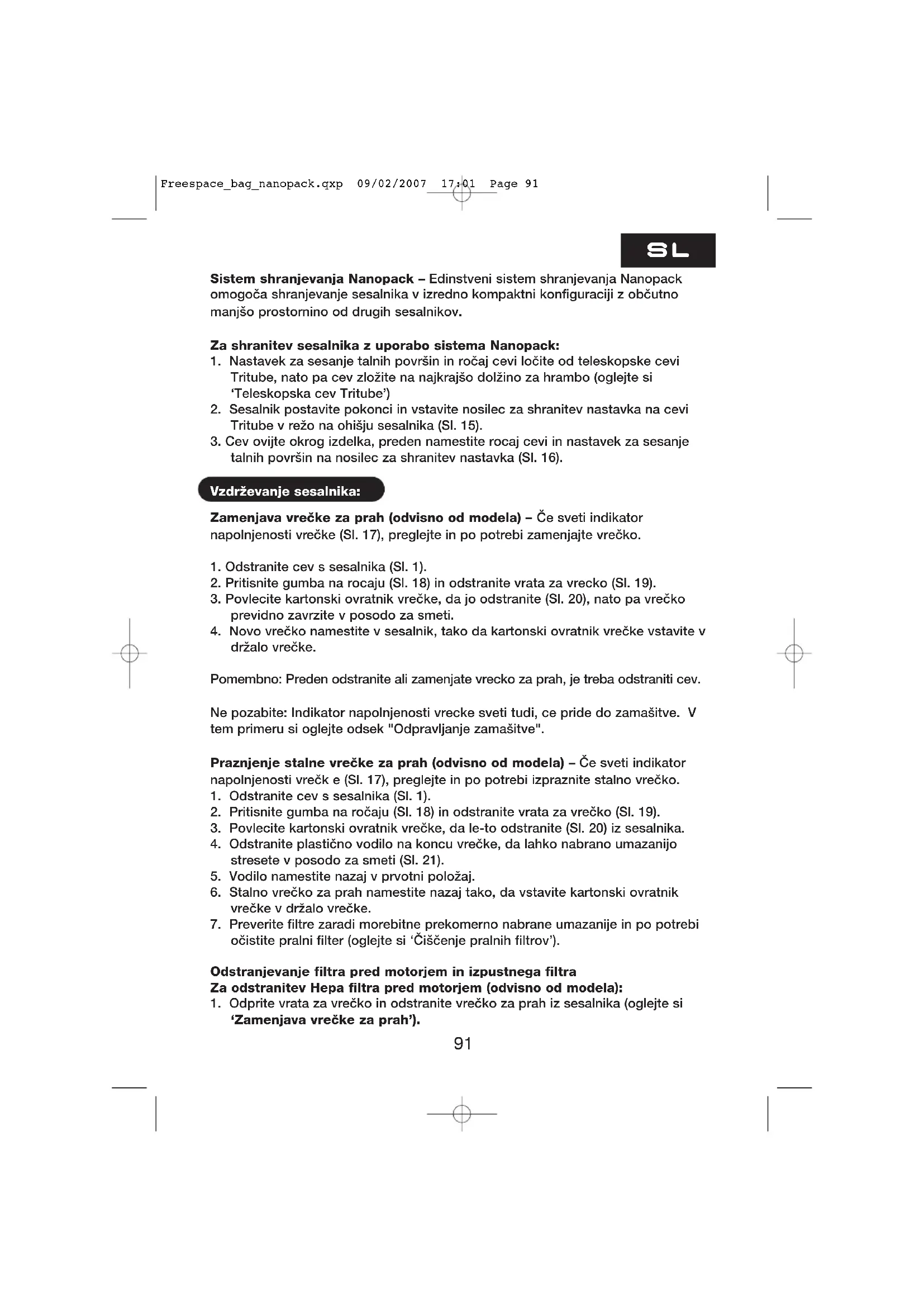talnih površin na nosilec za shranitev nastavka (Sl. 16). Vzdrževanje sesalnika: Zamenjava vrečke za prah (odvisno od modela) – Če sveti indikator napolnjenosti vr ečke (Sl. 17), preglejte in po potrebi zamenjajte vrečko.