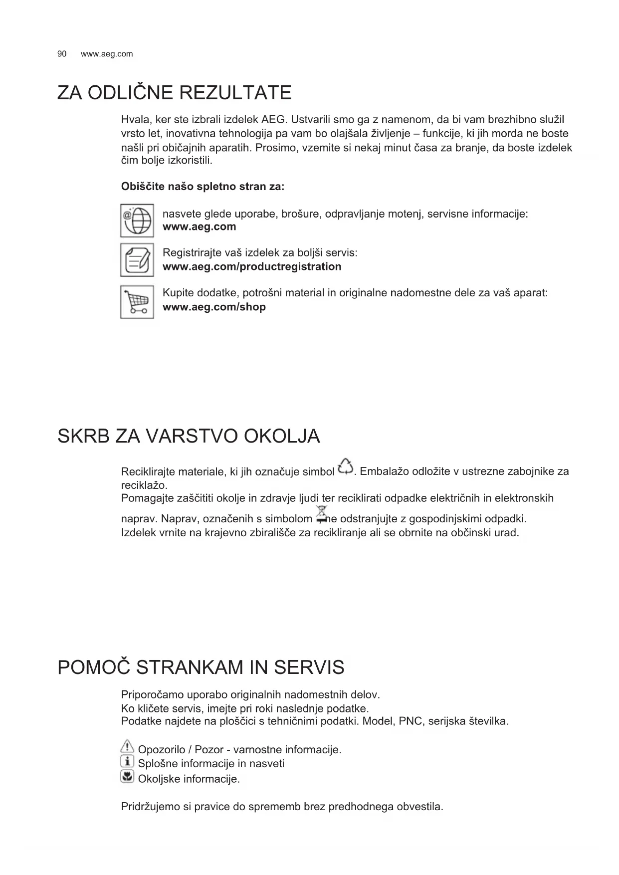 Priporočamo uporabo originalnih nadomestnih delov. Ko kličete servis, imejte pri roki naslednje podatke. Podatke najdete na ploščici s tehničnimi podatki. Model, PNC, serijska številka. Opozorilo / Pozor - varnostne informacije. Splošne informacije in nasveti Okoljske informacije. Pridržujemo si pravice do sprememb brez predhodnega obvestila.