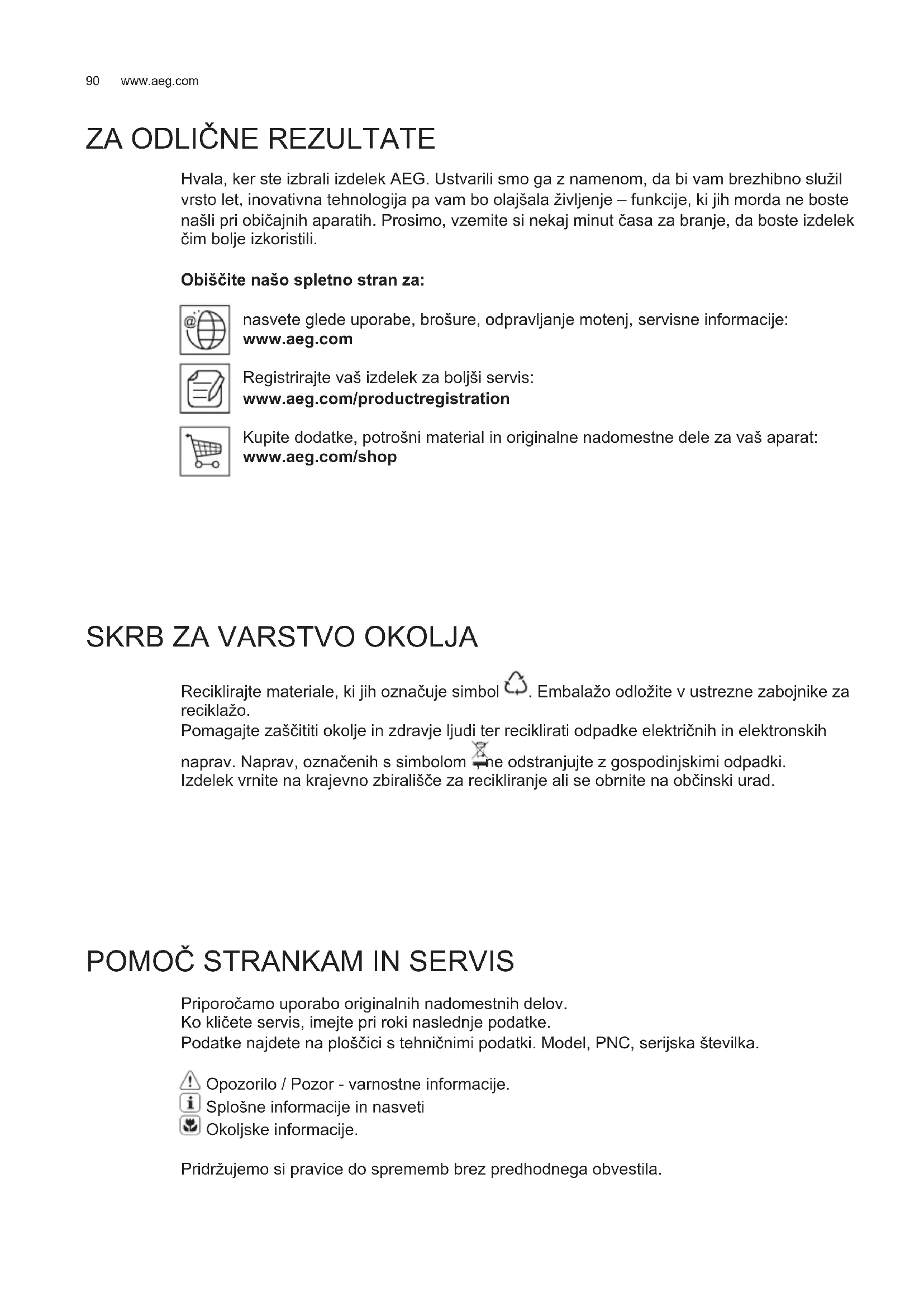 Priporočamo uporabo originalnih nadomestnih delov. Ko kličete servis, imejte pri roki naslednje podatke. Podatke najdete na ploščici s tehničnimi podatki. Model, PNC, serijska številka. Opozorilo / Pozor - varnostne informacije. Splošne informacije in nasveti Okoljske informacije. Pridržujemo si pravice do sprememb brez predhodnega obvestila.