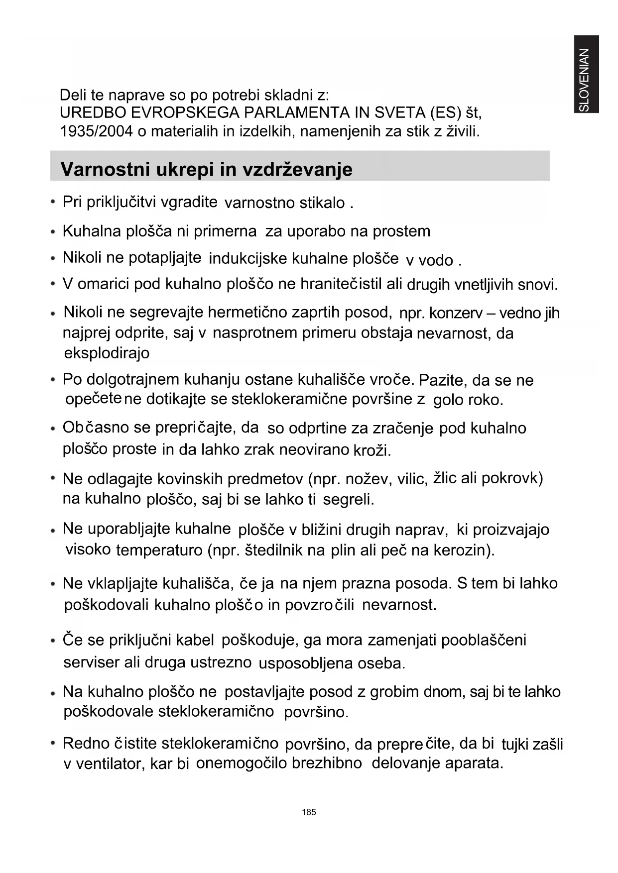 - Indukcijski kuhalni plošči lahko nastavite največjo raven moči, pri čemer lahko izbirate med različnimi ravnmi.196 ýišþenje in vzdrževanje ýišþenje indukcijske kuhalne plošþe je povsem enostavno: Vrsta neþistoþe ýišþenje Pripomoþek za þišþenje Manj umazana površina Namoþite z vroþo vodo in obrišite do suhega Gobica Madeži in sledi vodnega kamna Nanesite malo belega kisa na madež, obrišite z mehko krpo ali uporabite namensko þistilo Posebna lepilna folija za steklokeramiko Staljeni sladkor, alu- filija ali plastika Neþistoþo odstranite s posebnim strgalom za steklokeramiko (najboljša so silikonska) Posebna lepilna folija za steklokeramiko Opomba: Pred þišþenjem izklopite aparat. Prikaz in odpravljanje nepravilnosti v delovanju Napaka Možni razlogi Rešitev F0/F1/F2 okvara ventilatorja obrnite se na pooblašþeni servis F3-F8 okvara senzorja temperature obrnite se na pooblašþeni servis E1/E2 neustrezna elektriþna napetost preverite elektriþno napajanje, nato ponovno vklopite aparat E3/E4 nepravilna temperatura preverite ustreznost posode E5/E6 nezadostna toplota ponovno vklopite aparat potem, ko se je shladil V zgornji razpredelnici je naveden seznam najbolj pogostih nepravilnosti v delovanju. Indukcijske kuhalne plošþe nikoli ne razstavljajte sami, saj bi lahko povzroþili še hujšo okvaro. Servisiranje ýe se kuhalna plošþa pokvari: - najprej preverite, da je pravilno prikljuþena na elektriþno omrežje; nato - poskusite odpraviti napako s pomoþjo zgornje razpredelnice. ýe vam problema ne uspe odpraviti, izkljuþite kuhalno plošþo iz elektriþnega omrežja. Ne poskušajte je sami popraviti, ampak se obrnite na najbližji pooblašþeni servis. Pridržujemo si pravico do sprememb brez predhodnega obvestila in do tiskarskih napak. Izdelek je oznaþen skladno z direktivo evropske Gospodarske zbornice 2012/19 o odpadni elektriþni in elektronski opremi (WEEE). S pravilnim naþinom odstranjevanja izdelka boste pomagali prepreþiti morebitne negativne posledice na okolje in zdravje ljudi, ki bi jih lahko povzroþilo nepravilno odstranjevanje aparata. Simbol na izdelku oznaþuje, da s tem izdelkom ni dovoljeno ravnati kot z obiþajnimi gospodinjskimi odpadki. Izdelek odpeljite na ustrezno zbirno mesto za predelavo elektriþne in elektronske opreme. Odstranjevanje mora biti opravljeno skladno z lokalnimi okoljevarstvenimi predpisi o odstranjevanju odpadkov. Za podrobnejše informacije o odstranjevanju in predelavi tega izdelka se obrnite na pristojen mestni organ za odstranjevanje odpadkov, komunalno službo ali trgovino, v kateri ste izdelek kupili.197