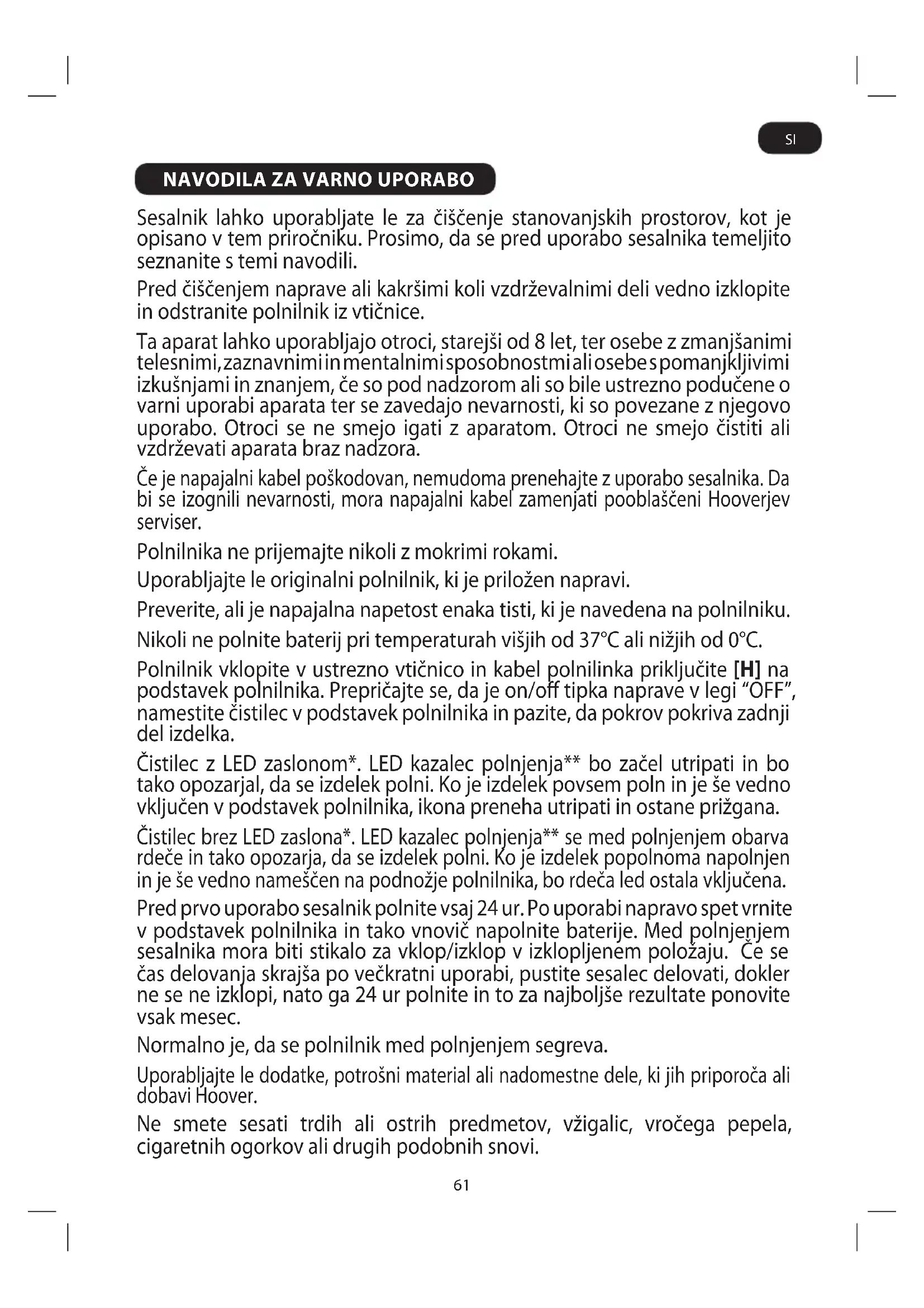 Sesalnik lahko uporabljate le za čiščenje stanovanjskih prostorov, kot je opisano v tem priročniku. Prosimo, da se pred uporabo sesalnika temeljito seznanite s temi navodili.