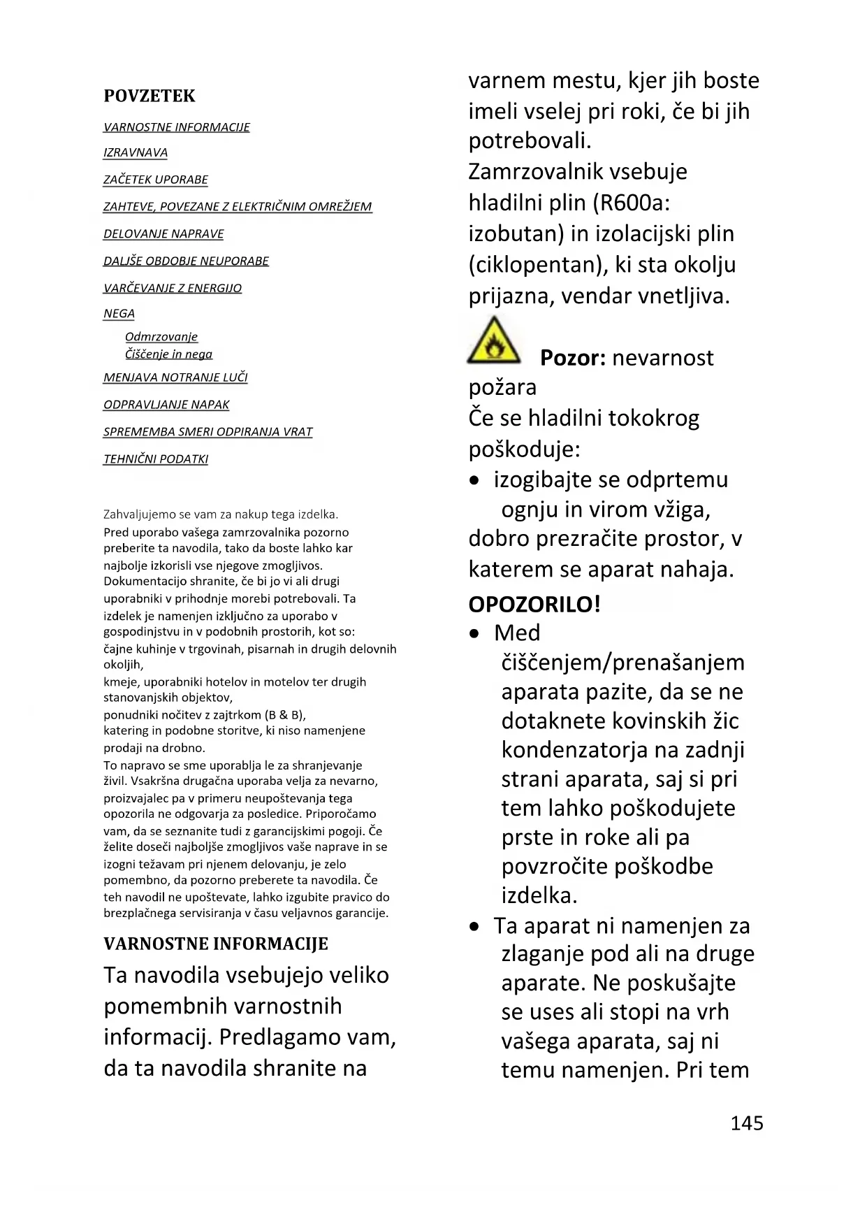 Zahvaljujemo se vam za nakup tega izdelka. Pred uporabo vašega zamrzovalnika pozorno preberite ta navodila, tako da boste lahko kar najbolje izkoristili vse njegove zmogljivosti. Dokumentacijo shranite, če bi jo vi ali drugi uporabniki v prihodnje morebiti potrebovali. Ta izdelek je namenjen izključno za uporabo v gospodinjstvu in v podobnih prostorih, kot so: čajne kuhinje v trgovinah, pisarnah in drugih delovnih okoljih, kmetije, uporabniki hotelov in motelov ter drugih stanovanjskih objektov, ponudniki nočitev z zajtrkom (B & B), katering in podobne storitve, ki niso namenjene prodaji na drobno. To napravo se sme uporabljati le za shranjevanje živil. Vsakršna drugačna uporaba velja za nevarno, proizvajalec pa v primeru neupoštevanja tega opozorila ne odgovarja za posledice. Priporočamo vam, da se seznanite tudi z garancijskimi pogoji. Če želite doseči najboljše zmogljivosti vaše naprave in se izogniti težavam pri njenem delovanju, je zelo pomembno, da pozorno preberete ta navodila. Če teh navodil ne upoštevate, lahko izgubite pravico do brezplačnega servisiranja v času veljavnosti garancije. VARNOSTNE INFORMACIJE Ta navodila vsebujejo veliko pomembnih varnostnih informacij. Predlagamo vam, da ta navodila shranite na varnem mestu, kjer jih boste imeli vselej pri roki, če bi jih potrebovali. Zamrzovalnik vsebuje hladilni plin (R600a: izobutan) in izolacijski plin (ciklopentan), ki sta okolju prijazna, vendar vnetljiva. Pozor: nevarnost požara Če se hladilni tokokrog poškoduje: