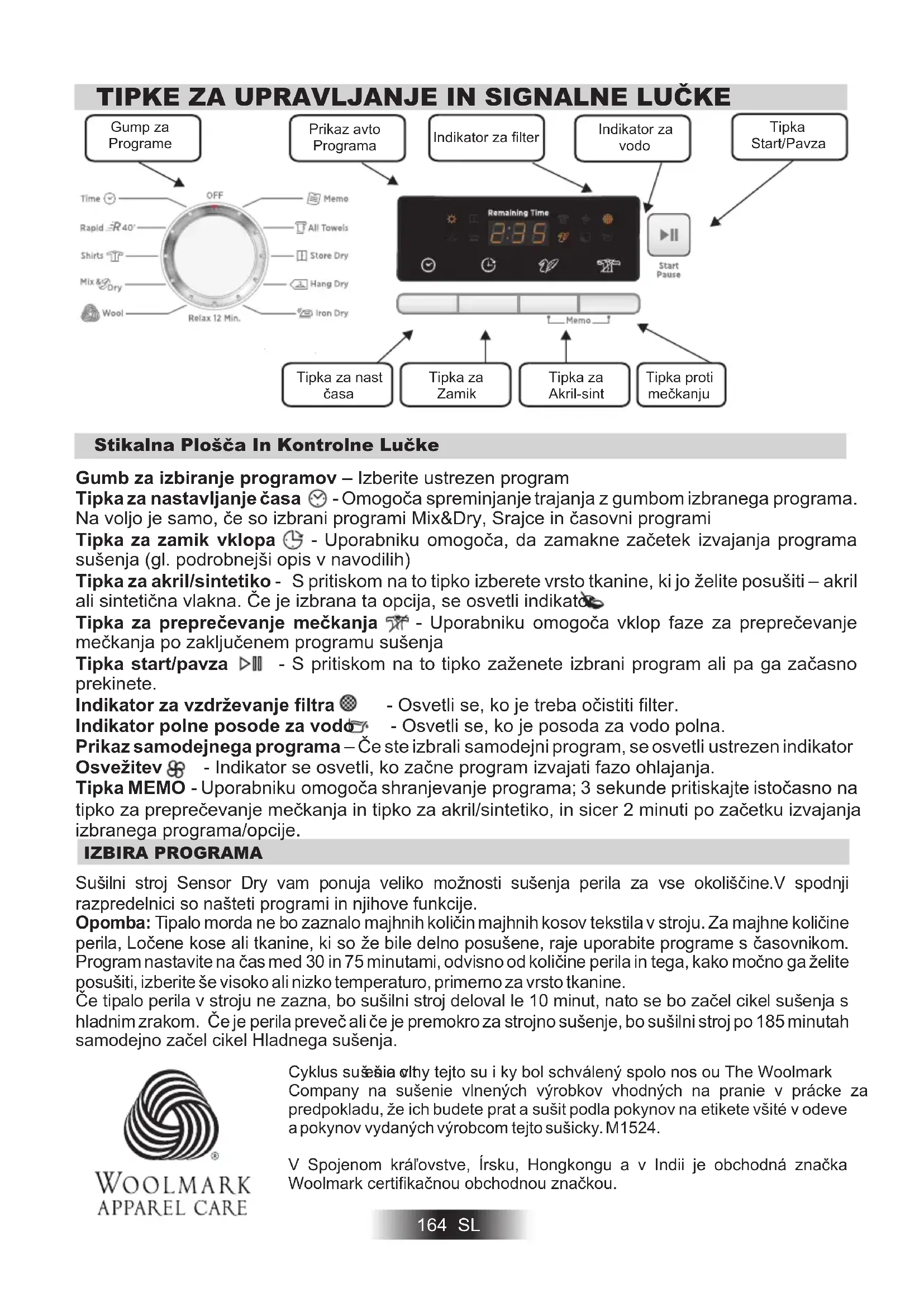 | Za likanje | Volnena oblačila: Program se lahko uporablja, da posuši do 1 kg perila (okol 3 pulloverje).Priporočljivo je, da pred sušenjem obrnete vsa oblačila.čas se lahko spremeni zaradi dimenzije in debeline perila in izbranega ožemanja med pranjem.Ob koncu cikla so oblačila pripravljena, da se oblećejo, vendar Če so le ta bolj težka, so lahko robovi malce mokri : predlagamo, da jih posušite naravno.Priporočljivo je, da izpraznite oblačila na samem koncu cikla.Priporočljivo je, da izpraznite oblačila na samem koncu cikla.Pozor: proces polstenja volne je nepovraten; posušite izklučno oblačila s simbolom "primerno za sušenje"; ta program ni primeren za akrilna oblačila. |