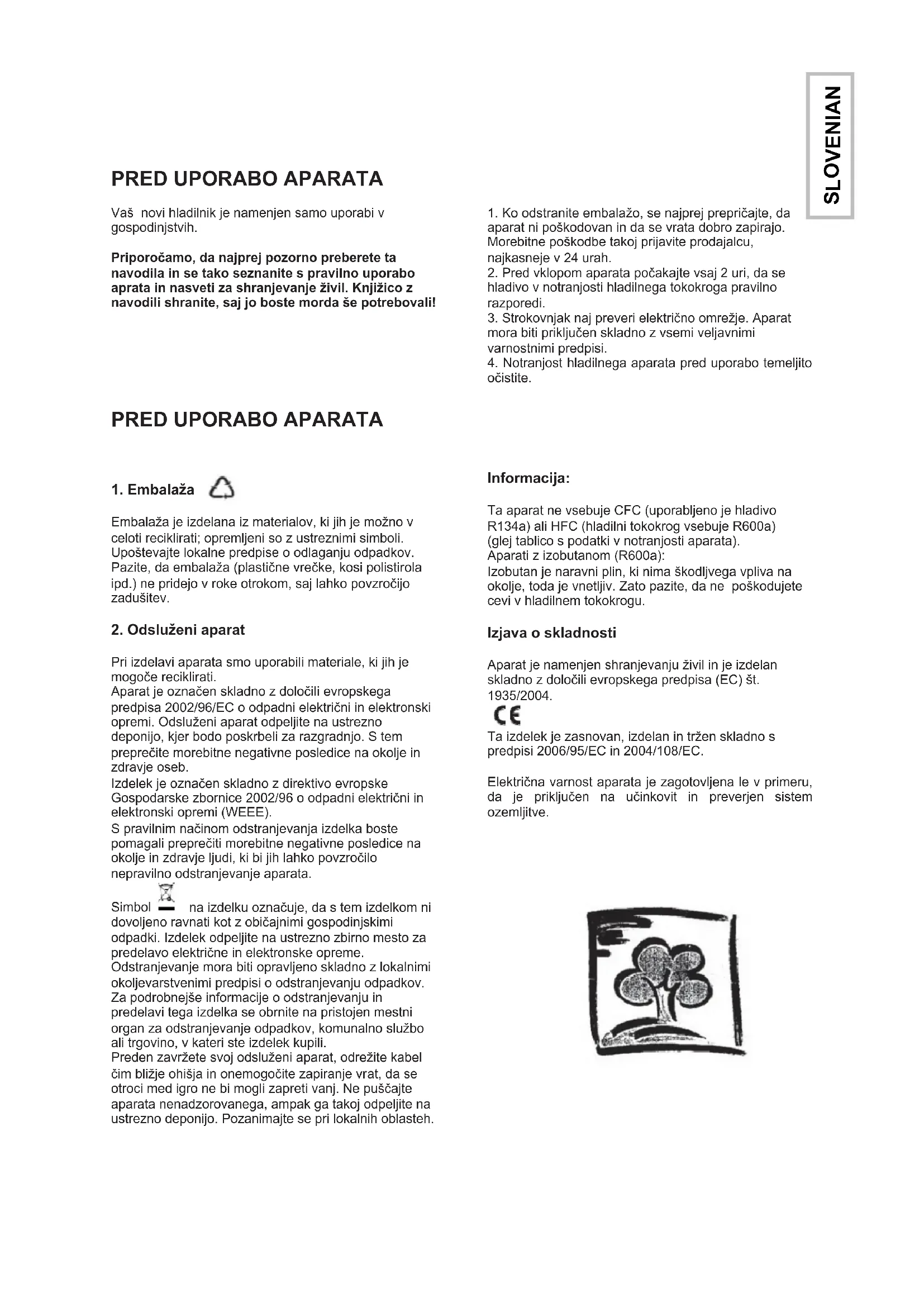 Ta aparat ne vsebuje CFC (uporabljeno je hladivo R134a) ali HFC (hladilni tokokrog vsebuje R600a) (glej tablico s podatki v notranjosti aparata). Aparati z izobutanom (R600a): Izobutan je naravni plin, ki nima škodljvega vpliva na okolje, toda je vnetljiv. Zato pazite, da ne poškodujete cevi v hladilnem tokokrogu. Izjava o skladnosti Aparat je namenjen shranjevanju živil in je izdelan skladno z določili evropskega predpisa (EC) št. 1935/2004. Ta izdelek je zasnovan, izdelan in tržen skladno s predpisi 2006/95/EC in 2004/108/EC. Električna varnost aparata je zagotovljena le v primeru, da je priključen na učinkovit in preverjen sistem ozemljitve.