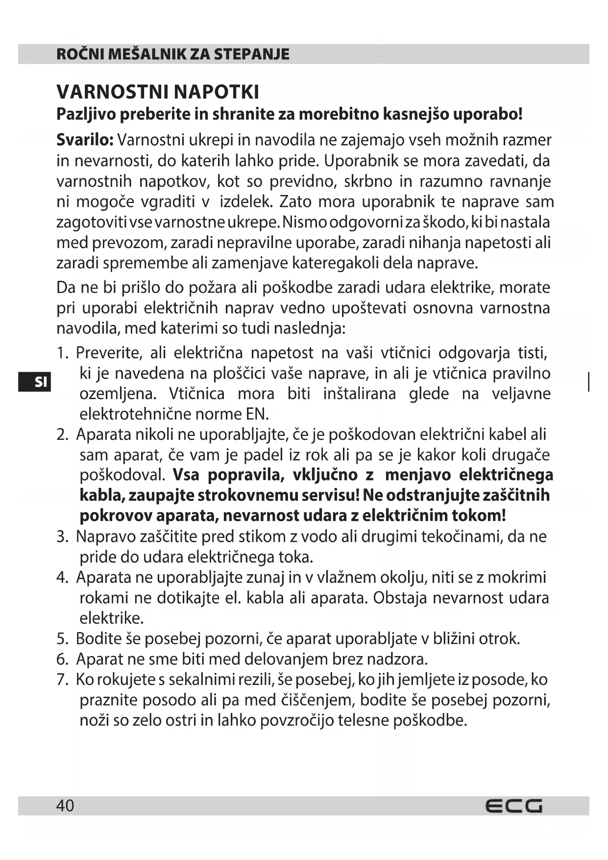Odstranjevanje električne in elektronske opreme (velja za države članice Evropske unije in druge evropske države, ki izvajajo sistem recikliranja). Simbol na izdelku ali embalaži pomeni, da se izdelek ne sme obravnavati kot komunalni odpadek. Dostaviti izdelek na lokacijo, namenjeno za recikliranje električne in elektronske opreme. Preprečite negativni vpliv na zdravje ljudi in okolje z pravilnim recikliranjem izdelka. Recikliranje ohranja naravne vire. Za več informacij orecikliranju tega izdelka se lahko obrnite na lokalne oblasti, lokalne organizacije ali trgovino, kjer ste izdelek kupili. Ta izdelek je vskladu zEU zahtevami oelektromagnetni skladnosti in električni varnosti. Pridržujemo si pravico do urejanja besedila in tehničnih parametrov. Navodila za uporabo so na razpolago na spletnih straneh www.ecg-electro.eu. 08/05SR/MNE