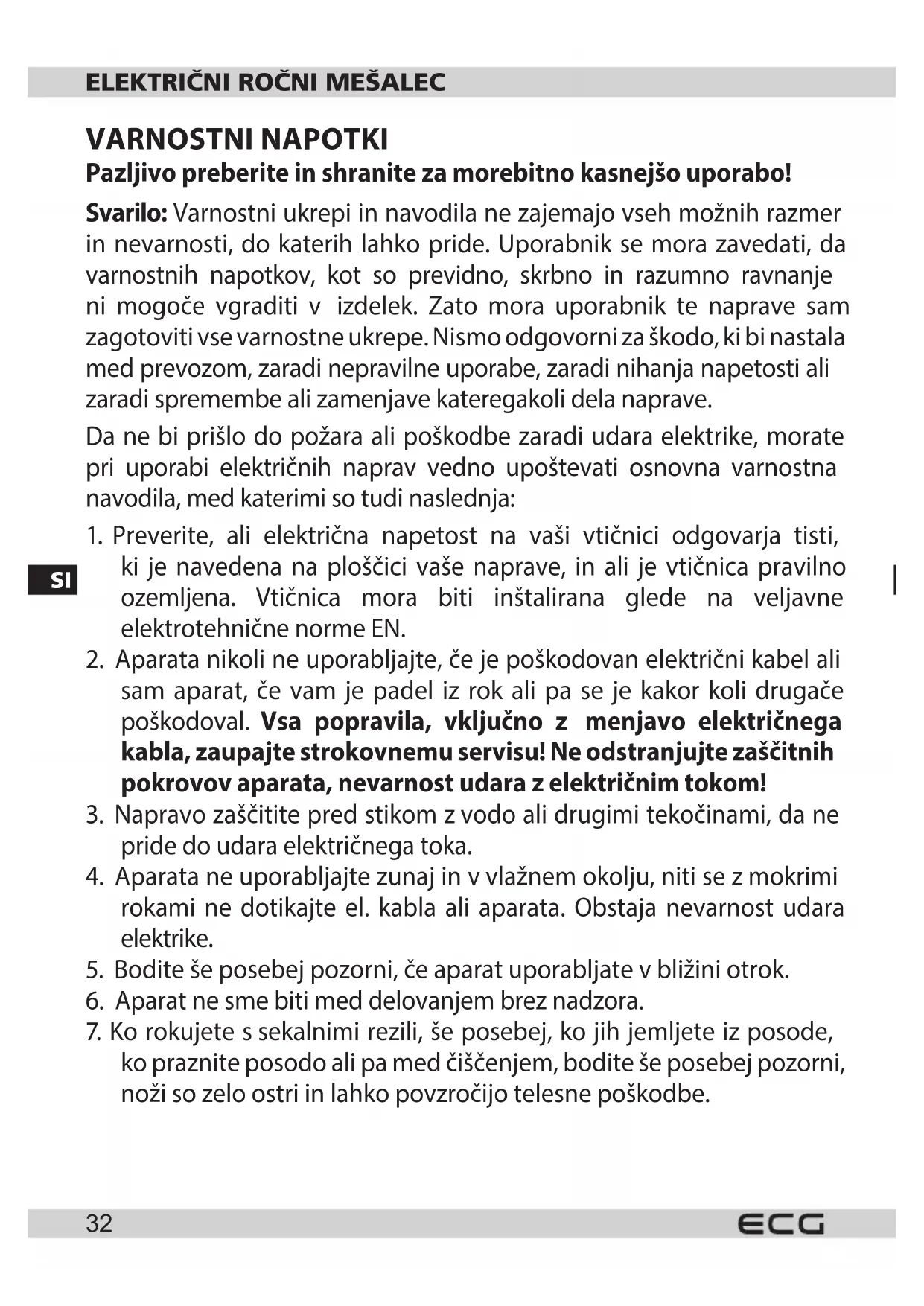 Odstranjevanje električne in elektronske opreme (velja za države članice Evropske unije in druge evropske države, ki izvajajo sistem recikliranja).Simbol na izdelku ali embalaži pomeni, da se izdelek ne sme obravnavati kot komunalni odpadek. Dostaviti izdelek na lokacijo, namenjeno za recikliranje električne in elektronske opreme. Preprečite negativni vpliv na zdravje ljudi in okolje zpravilnim recikliranjem izdelka. Recikliranje ohranja naravne vire. Za več informacij orecikliranju tega izdelka se lahko obrnite na lokalne oblasti, lokalne organizacije ali trgovino, kjer ste izdelek kupili. Ta izdelek je vskladu zEU zahtevami oelektromagnetni skladnosti in električni varnosti. Pridržujemo si pravico do urejanja besedila in tehničnih parametrov. Navodila za uporabo so na razpolago na spletnih straneh www.ecg-electro.eu.