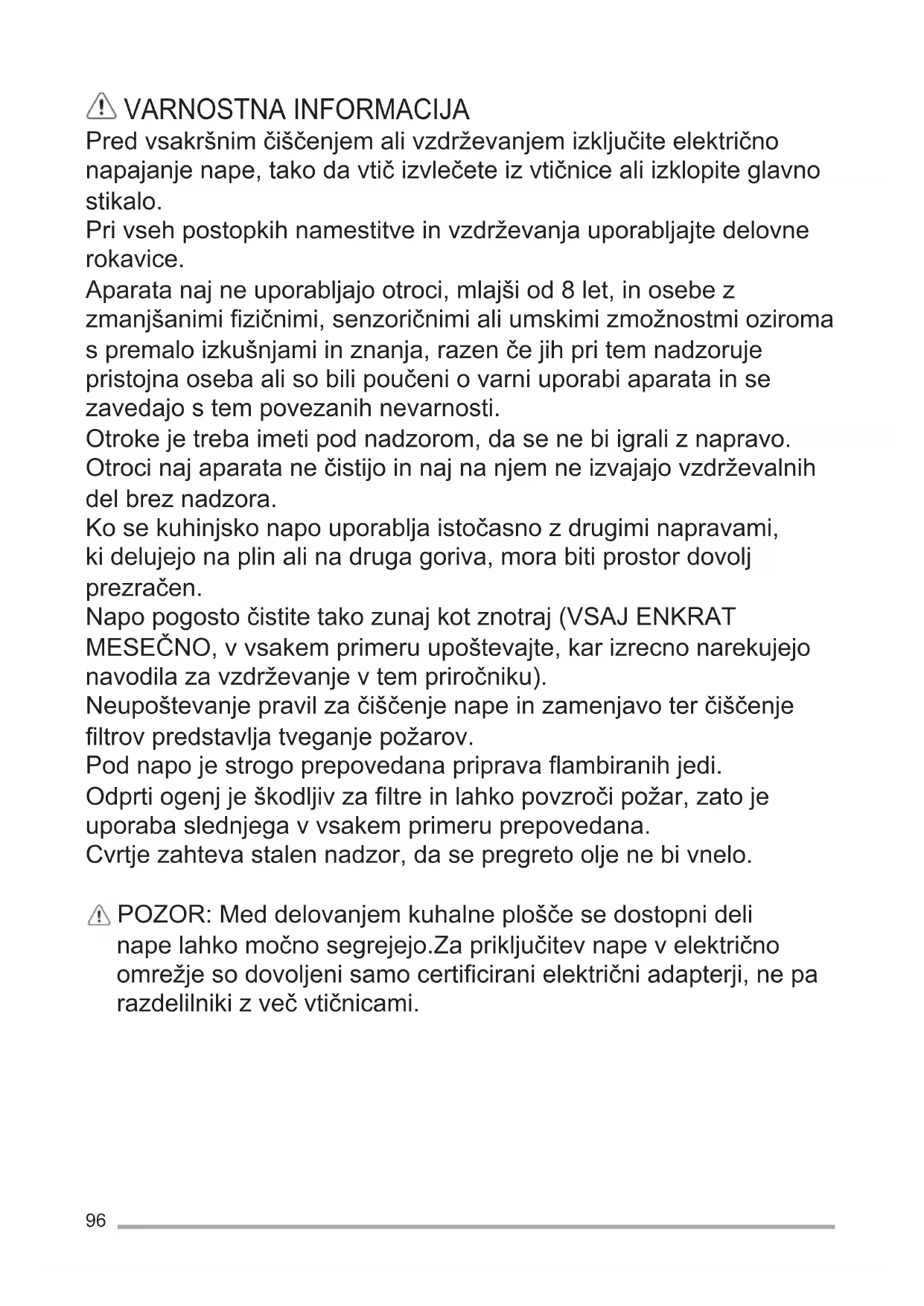 srednja (4.),maksimalna(5.). RASVJETA Kuhinjska napa je opremljena sustavom rasvjete koji se bazira na tehnologiji INDIKACIONIH SVJETALA. INDIKACIONASVJETLAgarantirajuoptimalnu rasvjetutetrajnost10putavećuodtradicionalnih lampiaomogućujuiušteduod90%električne energije. Oprez! Ne gledajte izravno u svjetla LED dioda. Usvezisazamjenom,obratitesetehničkoj potpori.96 VARNOSTNAINFORMACIJA Predvsakršnimčiščenjemalivzdrževanjemizključiteelektrično napajanjenape,takodavtičizvlečeteizvtičnicealiizklopiteglavno stikalo. Privsehpostopkihnamestitveinvzdrževanjauporabljajtedelovne rokavice. Aparatanajneuporabljajootroci,mlajšiod8let,inosebez zmanjšanimizičnimi,senzoričnimialiumskimizmožnostmioziroma spremaloizkušnjamiinznanja,razenčejihpritemnadzoruje pristojnaosebaalisobilipoučeniovarniuporabiaparatainse zavedajostempovezanihnevarnosti. Otrokejetrebaimetipodnadzorom,dasenebiigraliznapravo. Otrocinajaparatanečistijoinnajnanjemneizvajajovzdrževalnih delbreznadzora. Kosekuhinjskonapouporabljaistočasnozdrugiminapravami, kidelujejonaplinalinadrugagoriva,morabitiprostordovolj prezračen. Napopogostočistitetakozunajkotznotraj(VSAJENKRAT MESEČNO,vvsakemprimeruupoštevajte,karizrecnonarekujejo navodilazavzdrževanjevtempriročniku). Neupoštevanjepravilzačiščenjenapeinzamenjavoterčiščenje ltrovpredstavljatveganjepožarov. Podnapojestrogoprepovedanapripravaambiranihjedi. Odprtiogenjješkodljivzaltreinlahkopovzročipožar,zatoje uporabaslednjegavvsakemprimeruprepovedana. Cvrtjezahtevastalennadzor,dasepregretooljenebivnelo. POZOR:Meddelovanjemkuhalneploščesedostopnideli napelahkomočnosegrejejo.Zapriključitevnapevelektrično omrežjesodovoljenisamocertificiranielektričniadapterji,nepa razdelilnikizvečvtičnicami.97 VARNOSTNA NAVODILA Primenjaviuporabiteletipžarnice,kijenaveden vpoglavjuovzdrževanju/zamenjavižarnicevteh navodilih. Pozor!Napravenepriključujtenaelektrično omrežje,doklerinštalacijanivceloti zaključena. Karzadevatehničneinvarnostneukrepeza odvoddimov,moratestrogoupoštevatidoločbe pristojnihkrajevnihorganov. Vsesanizraksenesmeusmerjativcevovod, kislužikotodvodzapline,katereproizvajajo naprave,kidelujejonaplinalidrugagoriva. Napeneuporabljajteoziromajenepuščajtez nepravilnonameščenimižarnicami,sajobstaja tveganjeelektričnegaudara. Napenikolineuporabljajte,čerešetkanipravilno nameščena! Nape NIKOLI ne uporabljajte kot odlagalne površine,razenčejetoizrecnodovoljeno. Zanameščanjeizdelkauporabitelepriložene pritrdilnevijake.Čejihninavoljo,pakupitepravo vrstovijakov.Uporabitevijakepravedolžine,ki sonavedenivnavodilihzanamestitev.Vprimeru dvomovseposvetujtespooblaščenimservisnim centromalispodobnousposobljenoosebo. POZOR!Čeprimontaživijakovinpritrdilnih elementovneupoštevatetehnavodil,obstaja nevarnostelektričnegaudara. SKRBZAVARSTVOOKOLJA Reciklirajtemateriale,kijihoznačujesimbol .Embalažoodložitevustreznezabojnikeza reciklažo. Pomagajtezaščititiokoljeinzdravjeljuditer recikliratiodpadkeelektričnihinelektronskih naprav.Naprav,označenihssimbolom ,ne odstranjujtezgospodinjskimiodpadki.Izdelek vrnitenakrajevnozbirališčezarecikliranjealise obrnitenaobčinskiurad. UPORABA Napajeizdelanazauporabovodzračevalni izvedbi z zunanjim odvodom ,alivobtočni izvedbiznotranjimkroženjem . INŠTALACIJA Omrežnanapetostmoraustrezatinapetosti, navedeninanalepkizlastnostmi,nameščeniv notranjostinape.Čeimanapavtič,slednjega vstavitevvtičnico,kijeskladnazveljavnimi predpisiinsenahajanatakemmestu,kibo dostopnotudipovgradnjinaprave.Čenapa nimavtiča(neposrednapovezavanaomrežje) alisevtičnahajanatakemmestu,kipovgradnji napravenebibilodostopno,namestitedvopolno stikalo,skladnospredpisi,kizagotavljapopoln izklopizomrežjavpogojihprenapetostnega razredaIII,skladnospredpisioinštalaciji. Pozor!predponovnimpriklopomtokokroga napenaomrežnonapajanjeinkontrolo pravilnegadelovanja,vselejpreverite,alije omrežnikabelpravilnonameščen.98 Minimalnarazdaljamedpodpornopovršino posodnakuhalnipovršiniinspodnjimdelom napezakuhinjskeprostorenesmebitimanjša od50cmprielektričnihštedilnikihin65cmpri plinskihalimešanihštedilnikih. Čejevnavodilihzainstalacijoplinskega kuhalnikanapisanavečjarazdalja,jojetrebatudi upoštevati. VZDRŽEVANJE Pozor!Predvsakršnimčiščenjemali vzdrževanjemizključiteelektričnonapajanje nape,takodavtičizvlečeteizvtičniceali izklopiteglavnostikalo.Napazahteva pogostočiščenje,takozunajkotznotraj. Začiščenjeuporabljajtekrpo,navlaženos tekočiminevtralnimidetergenti. Izogibajteseuporabiizdelkov,kivsebujejo abrazivnesnovi.NEUPOBLJAJTEALKOHOLA! Pozor!Neupoštevanjepravilzačiščenje naprave in zamenjavo filtrov predstavlja tveganjepožarov.Zatovamsvetujemo,da sleditepriporočenimnavodilom.Zavračamo vsakršnoodgovornostzamorebitnoškodo namotorjuinpožare,kibibiliposledica neprimernegavzdrževanjaalineupoštevanja zgornjihopozoril. Maščobni lter -Očistitigajetrebaenkrat mesečnozneagresivnimičistilnimisredstvi, ročnoalivpomivalnemstrojuprinizkitemperaturi inkratkimciklompranja. Spranjemvpomivalnemstrojusemaščobnilter lahkorazbarva,todanjegoveltrirneznačilnosti ostanejonespremenjene. Type 20 LONG LIFE - Pralni lter z aktivnim ogljem Ogleni lter se lahko opere vsake dva meseca v topli vodi in ustreznimi čistilnimi sredstvi ali v pomivalnem stroju pri 65°C (v primeru pranja v pomivalnem stroju izvedite popoln pralni cikel brez posodevstroju). Odstranite odvečno vodo, ne da bi pri tem poškodovali lter, nato snemite vložek, ki se nahaja v notranjosti plastičnega ogrodja in ga dajtevpečza10minutnatemperaturi100°C,da gavcelotiposušite. Vložekzamenjajtevsaka3 letain vsakič,ko na njemodkrijetepoškodbe. Type 15 - Nepralni lter z aktivnim ogljem Oglenilterjepotrebnozamenjatipodaljši uporabi,gledenatipkuheterrednočiščenje maščobnegaltra.Vsekakorjepotrebno zamenjativložeknajmanjvsakeštirimesece. Filterninitipralennitiobnovljiv.