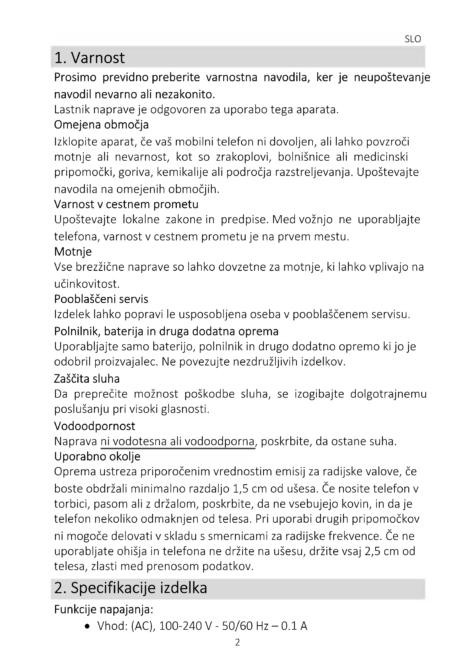 Prosimo previdno preberite varnostna navodila, ker je neupoštevanje navodil nevarno ali nezakonito. Lastnik naprave je odgovoren za uporabo tega aparata. Omejena območja Izklopite aparat, če vaš mobilni telefon ni dovoljen, ali lahko povzroči motnje ali nevarnost, kot so zrakoplovi, bolnišnice ali medicinski pripomočki, goriva, kemikalije ali področja razstreljevanja. Upoštevajte navodila na omejenih območjih. Varnost v cestnem prometu Upoštevajte lokalne zakone in predpise. Med vožnjo ne uporabljajte telefona, varnost v cestnem prometu je na prvem mestu. Motnje Vse brezžične naprave so lahko dovzetne za motnje, ki lahko vplivajo na učinkovitost. Pooblaščeni servis Izdelek lahko popravi le usposobljena oseba v pooblaščenem servisu. Polnilnik, baterija in druga dodatna oprema Uporabljajte samo baterijo, polnilnik in drugo dodatno opremo ki jo je odobril proizvajalec. Ne povezujte nezdružljivih izdelkov. Zaščita sluha Da preprečite možnost poškodbe sluha, se izogibajte dolgotrajnemu poslušanju pri visoki glasnosti. Vodoodpornost Naprava ni vodotesna ali vodoodporna, poskrbite, da ostane suha. Uporabno okolje Oprema ustreza priporočenim vrednostim emisij za radijske valove, če boste obdržali minimalno razdaljo 1,5 cm od ušesa. Če nosite telefon v torbici, pasom ali z držalom, poskrbite, da ne vsebujejo kovin, in da je telefon nekoliko odmaknjen od telesa. Pri uporabi drugih pripomočkov ni mogoče delovati v skladu s smernicami za radijske frekvence. Če ne uporabljate ohišja in telefona ne držite na ušesu, držite vsaj 2,5 cm od telesa, zlasti med prenosom podatkov.