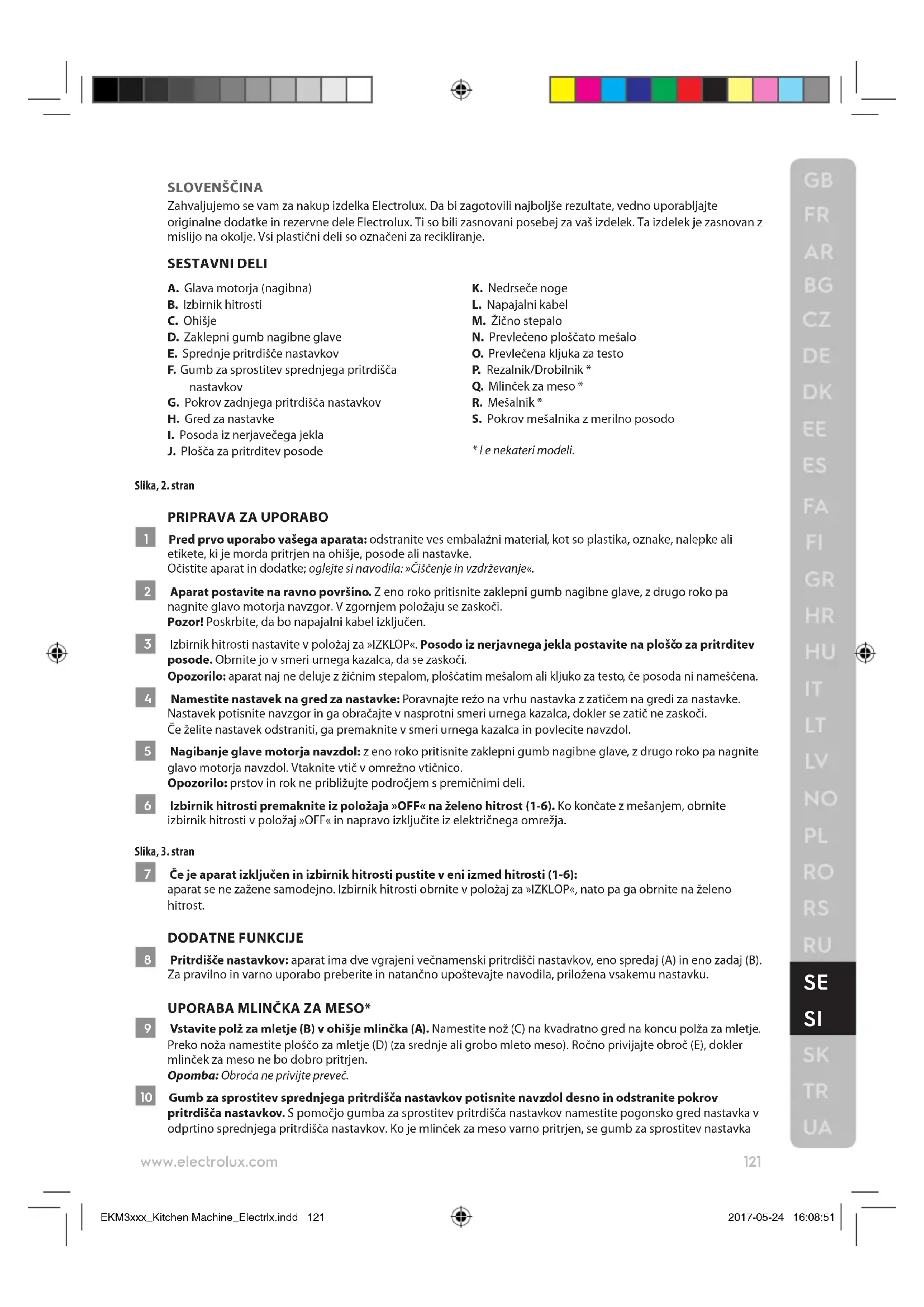 Motor se med delovanjem upočasni. Količina testa je morda presegla največjo zmogljivost. Odstranite polovico in zgnetite v dveh delih. Testo je morda preveč mokro, prijema se na steno posode. Dodajajte moko, po eno jedilno žlico naenkrat, dokler motor ne pospeši. Gnetite, dokler testo ne počisti stene posode. Aparat se ne zažene. Naprava ni priključena na električno omrežje. Poskrbite, da boste pred delovanjem vključili napravo. Izbirnik hitrosti ni bil v položaju za »IZKLOP«, ko je bil aparat izključen. Izbirnik hitrosti obrnite v položaj za »IZKLOP«, nato pa na želeno hitrost. Naprava se med delovanjem trese/premika. Blažilne noge niso primerno pritrjene na površino. Poskrbite, da bodo blažilne noge čiste. Aparat postavite na gladko in sijočo površino. To je običajno za delovanje pri veliki obremenitvi (npr. težko testo, sir). Odstranite polovico in zgnetite v dveh delih. ODSTRANJEVANJE Ta simbol na izdelku pomeni, da izdelek vsebuje baterijo, ki je ni dovoljeno odlagati z običajnimi gospodinjskimi odpadki. Ta simbol na izdelku ali njegovi embalaži pomeni, da z izdelkom ni dovoljeno ravnati kot z običajnimi gospodinjskimi odpadki. Izdelek za recikliranje nesite na ustrezno zbirno mesto ali v Electroluxov servisni center, kjer lahko na varen in profesionalen način odstranijo in reciklirajo baterijo in električne dele. Upoštevajte pravila v vaši državi za ločeno zbiranje električnih izdelkov in baterij za ponovno polnjenje. Podjetje Electrolux si pridržuje pravico, da spremeni izdelke, informacije in specikacije brez predhodnega obvestila. EKM3xxx_Kitchen Machine_Electrlx.indd 124 2017-05-24 16:08:52125 www.electrolux.com