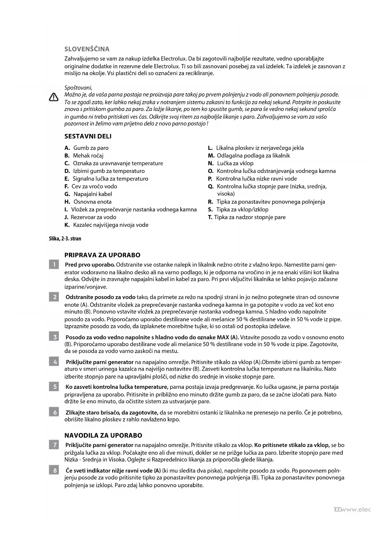 9 Za vklop pare, pritisnite gumb za paro. Preden deaktivirate gumb iz likalne postaje izpustite vso paro, šele nato ogložite likalnik na likalno postajo. 10 Likalnik izklopite tako, da nekaj časa pritiskate tipko za vklop/izklop, dokler se ne oglasi zvočni signal. Če likalnik pustite brez nadzora na nosilcu za likalnik, se po 10 minutah samodejno izklopi. 11 Zmeraj pustite, da se likalnik popolnoma ohladi na odlagalni podlagi za likalnik, preden ga pospravite. Ko se je likalnik ohladil, izpraznite posodo za vodo. Pospravite parni generator. 12 Vedno pospravite kabel varno ovit zraven likalnika. NIKOLI ne ovijajte napajalnega kabla okrog likalnika. ČIŠČENJE (NE UPORABLJAJTE ČISTILNIH SREDSTEV) 13 Likalnik vedno shranjujte tako, da ga postavite na zadnji del. Za čiščenje zunanjih površin uporabite vlažno mehko krpo, nato ga osušite s suho krpo. Ne uporabljajte kemičnih raztopil, ker bodo ta poškodovala površino likalnika. 14 Zamenjava enote za preprečevanje nastanka vodnega kamna: Če sveti indikator odstranjevanja vodnega kamna, odstranite posodo za vodo. Odstranite enoto za preprečevanje nastanka vodnega kamna, tako da jo pov- lečete navzgor. Novo enoto za preprečevanje nastanka vodnega kamna potopite v vodo za več kot eno minuto, nato jo vstavite v posodo za vodo. Poskrbite za pravilen položaj nove enote za preprečevanje nastanka vodnega kamna, v nasprotnem primeru bo indikator odstranjevanja vodnega kamna še naprej utripal. Za najboljšo učinkovitost priporočamo kartušo iz naše ponudbe s sklicno številko EDC06. 15 Po koncu uporabe naprave obrnite gumb za temperaturo v položaj za IZKLOP (»0«). Likalnik postavite na nosilec za likalnik. Opomba: Likalnika ne shranjujte z vodo v posodi. THERMOSAFE™ (* LE DOLOČENI MODELI) 16 Vaš aparat ima indikator vroče likalne plošče ThermoSafe™, ki zazna, kdaj je likalna plošča vroča, tako da spreminja barvo od črne do rdeče. Ko je temperatura likalne plošče < 40 °C, znova postane črn, kar pomeni, da lahko likalnik shranite. Uživajte z vašim novim Electrolux izdelkom! VARNOSTNI NASVETI Pred prvo uporabo naprave pozorno preberite navodila za uporabo.