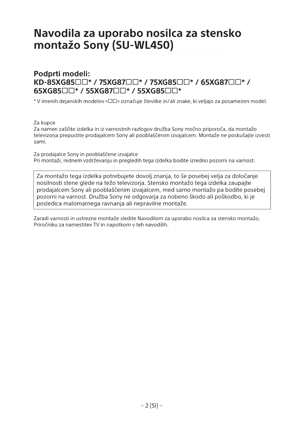 - V imenih dejanskih modelov »« označuje številke in/ali znake, ki veljajo za posamezen model. Za kupce Za namen zaščite izdelka in iz varnostnih razlogov družba Sony močno priporoča, da montažo televizorja prepustite prodajalcem Sony ali pooblaščenim izvajalcem. Montaže ne poskušajte izvesti sami. Za prodajalce Sony in pooblaščene izvajalce Pri montaži, rednem vzdrževanju in pregledih tega izdelka bodite izredno pozorni na varnost. Za montažo tega izdelka potrebujete dovolj znanja, to še posebej velja za določanje nosilnosti stene glede na težo televizorja. Stensko montažo tega izdelka zaupajte prodajalcem Sony ali pooblaščenim izvajalcem, med samo montažo pa bodite posebej pozorni na varnost. Družba Sony ne odgovarja za nobeno škodo ali poškodbo, ki je posledica malomarnega ravnanja ali nepravilne montaže. Zaradi varnosti in ustrezne montaže sledite Navodilom za uporabo nosilca za stensko montažo, Priročniku za namestitev TV in napotkom v teh navodilih.− 3 (SI) −