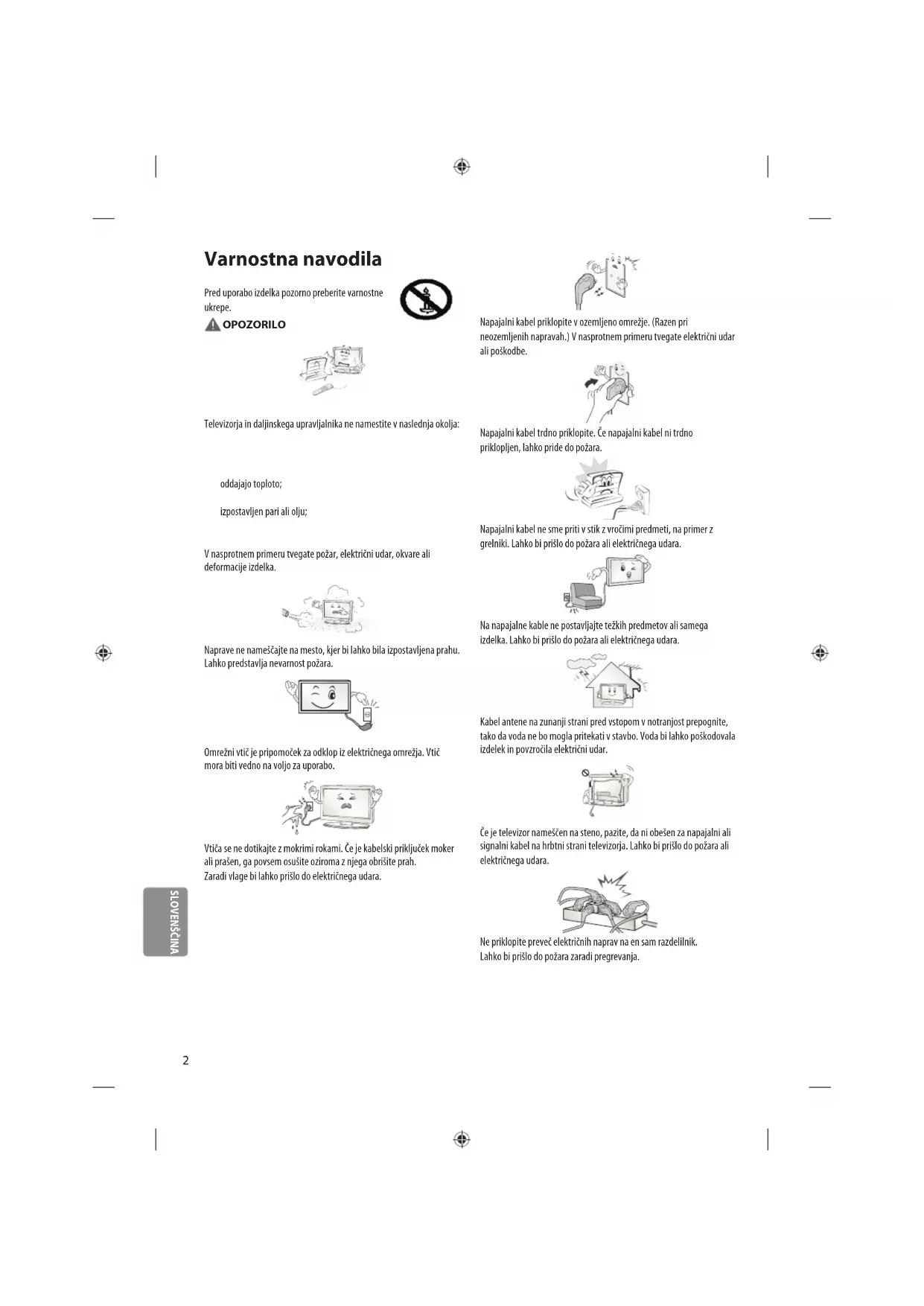 - LG-jevi televizorji LED uporabljajo zaslon LCD in osvetlitev ozadja s tehnologijo LED.2 SLOVENŠČINA Varnostna navodila Pred uporabo izdelka pozorno preberite varnostne ukrepe. OPOZORILO Televizorja in daljinskega upravljalnika ne namestite v naslednja okolja: tNa neposredno sončno svetlobo; tV prostor z visoko zračno vlažnostjo, kot je kopalnica; tV bližino virov toplote, kot so štedilniki in druge naprave, ki oddajajo toploto; tV bližino kuhinjskih pultov ali vlažilnikov zraka, kjer bi lahko izpostavljen pari ali olju; tV območje, kjer bi bil izpostavljen dežju ali vetru; tV bližino posod z vodo, kot so vaze. V nasprotnem primeru tvegate požar, električni udar, okvare ali deformacije izdelka. Naprave ne nameščajte na mesto, kjer bi lahko bila izpostavljena prahu. Lahko predstavlja nevarnost požara. Omrežni vtič je pripomoček za odklop iz električnega omrežja. Vtič mora biti vedno na voljo za uporabo. Vtiča se ne dotikajte z mokrimi rokami. Če je kabelski priključek moker ali prašen, ga povsem osušite oziroma z njega obrišite prah. Zaradi vlage bi lahko prišlo do električnega udara. Napajalni kabel priklopite v ozemljeno omrežje. (Razen pri neozemljenih napravah.) V nasprotnem primeru tvegate električni udar ali poškodbe. Napajalni kabel trdno priklopite. Če napajalni kabel ni trdno priklopljen, lahko pride do požara. Napajalni kabel ne sme priti v stik z vročimi predmeti, na primer z grelniki. Lahko bi prišlo do požara ali električnega udara. Na napajalne kable ne postavljajte težkih predmetov ali samega izdelka. Lahko bi prišlo do požara ali električnega udara. Kabel antene na zunanji strani pred vstopom v notranjost prepognite, tako da voda ne bo mogla pritekati v stavbo. Voda bi lahko poškodovala izdelek in povzročila električni udar. Če je televizor nameščen na steno, pazite, da ni obešen za napajalni ali signalni kabel na hrbtni strani televizorja. Lahko bi prišlo do požara ali električnega udara. Ne priklopite preveč električnih naprav na en sam razdelilnik. Lahko bi prišlo do požara zaradi pregrevanja.3 SLOVENŠČINA Pazite, da vam izdelek med priklopom zunanjih naprav ne pade. Lahko bi prišlo do telesnih poškodb ali škode na izdelku. Desiccant Snovi za vpijanje vlage ali vinilno embalažo hranite zunaj dosega otrok. Snovi za vpijanje vlage so strupene, če jih zaužijete. V primeru nenamernega zaužitja pacienta prisilite k bruhanju in odpeljite v najbližjo bolnišnico. Vinilna embalaža predstavlja tveganje zadušitve. Hranite jo zunaj dosega otrok. Otrokom ne pustite plezanja ali obešanja na televizor. Televizor bi se lahko prevrnil in povzročil hude poškodbe. Izrabljene baterije zavrzite odgovorno, da jih ne bo mogel zaužiti otrok. Če jih otrok vendarle zaužije, nemudoma poiščite zdravniško pomoč. Če je en konec napajalnega kabla priključen v stensko vtičnico, v drugi konec ne vstavljajte prevodnikov (kot je kovinska paličica). Poleg tega se ne dotaknite napajalnega kabla tik po tem, ko ga vstavite v vtičnico. S tem bi tvegali električni udar. (Odvisno od modela) Blizu naprave ne postavljajte ali hranite vnetljivih snovi. Neprevidno ravnanje z vnetljivimi snovmi lahko privede do eksplozije ali požara. V izdelek ne vstavljajte kovinskih predmetov, na primer kovancev, lasnih igel, paličic in žic, ali vnetljivih predmetov, na primer papirja ali vžigalic. Še zlasti bodite previdni v prisotnosti otrok. Lahko bi prišlo do električnega udara, požara ali poškodb. Če v izdelek pade predmet, izključite napajalni kabel in se obrnite na servisni center. Izdelka ne škropite z vodo ali ga čistite z vnetljivimi sredstvi (razredčila ali benzen). Lahko bi prišlo do požara ali električnega udara. Izdelka ne izpostavljajte udarcem, vanj ne vstavljajte predmetov in ne tolcite po zaslonu. Sicer lahko pride do električnega udara ali poškodb izdelka. Izdelka ali antene se ne dotikajte med nevihto ali bliskanjem. S tem bi tvegali električni udar. Če pride do uhajanja plina, izdelka ni dovoljeno odklopiti iz vtičnice. Sobo je treba najprej dobro prezračiti. Lahko bi prišlo do požara ali opeklin zaradi iskrenja. Izdelka ne razstavljajte, popravljajte ali spreminjajte sami. Lahko bi prišlo do požara ali električnega udara. Za pregled, umerjanje ali popravilo se obrnite na servisni center.4 SLOVENŠČINA V naslednjih primerih nemudoma odklopite izdelek in se obrnite na lokalni servisni center. tIzdelek je utrpel udarec. tIzdelek je poškodovan. tV izdelku so predmeti. tIzdelek oddaja dim ali nenavaden vonj. Lahko bi prišlo do požara ali električnega udara. Če naprave dlje časa ne boste uporabljali, izključite napajalni kabel. Prah lahko povzroči požar, poškodovana izolacija pa lahko povzroči preskok električne iskre, električni udar ali požar. Izdelka ne izpostavljajte kapljanju ali razlitju tekočin, nanj pa tudi ni dovoljeno postavljati predmetov, napolnjenih z vodo, na primer vaz. Izdelka ne nameščajte na steno, če bi bil lahko izpostavljen olju ali oljnim hlapom. Izdelek se lahko poškoduje in pade. Če v izdelek (adapter AC, napajalni kabel, televizor ...) prodre voda ali druga snov, izključite napajalni kabel in se takoj obrnite na servisni center. Lahko bi prišlo do požara ali električnega udara. Uporabljajte samo odobreni adapter AC in napajalni kabel, ki ga je odobrila družba LG Electronics. Sicer lahko pride do požara, električnega udara, okvare ali deformacije izdelka. Adapterja AC in napajalnega kabla ne razstavljajte. Lahko bi prišlo do požara ali električnega udara. POZOR Napravo namestite na mesto, kjer ni radijskih valov. Zunanja antena mora biti dovolj oddaljena od napajalnih vodov, da med njimi ne more priti do stika, tudi če bi antena padla. Lahko bi prišlo do električnega udara. Izdelka ne nameščajte na mesta, kot so majave police ali nagnjene površine. Izogibajte se tudi površinam, kjer bi bil izdelek izpostavljen tresljajem, in površinam s š
