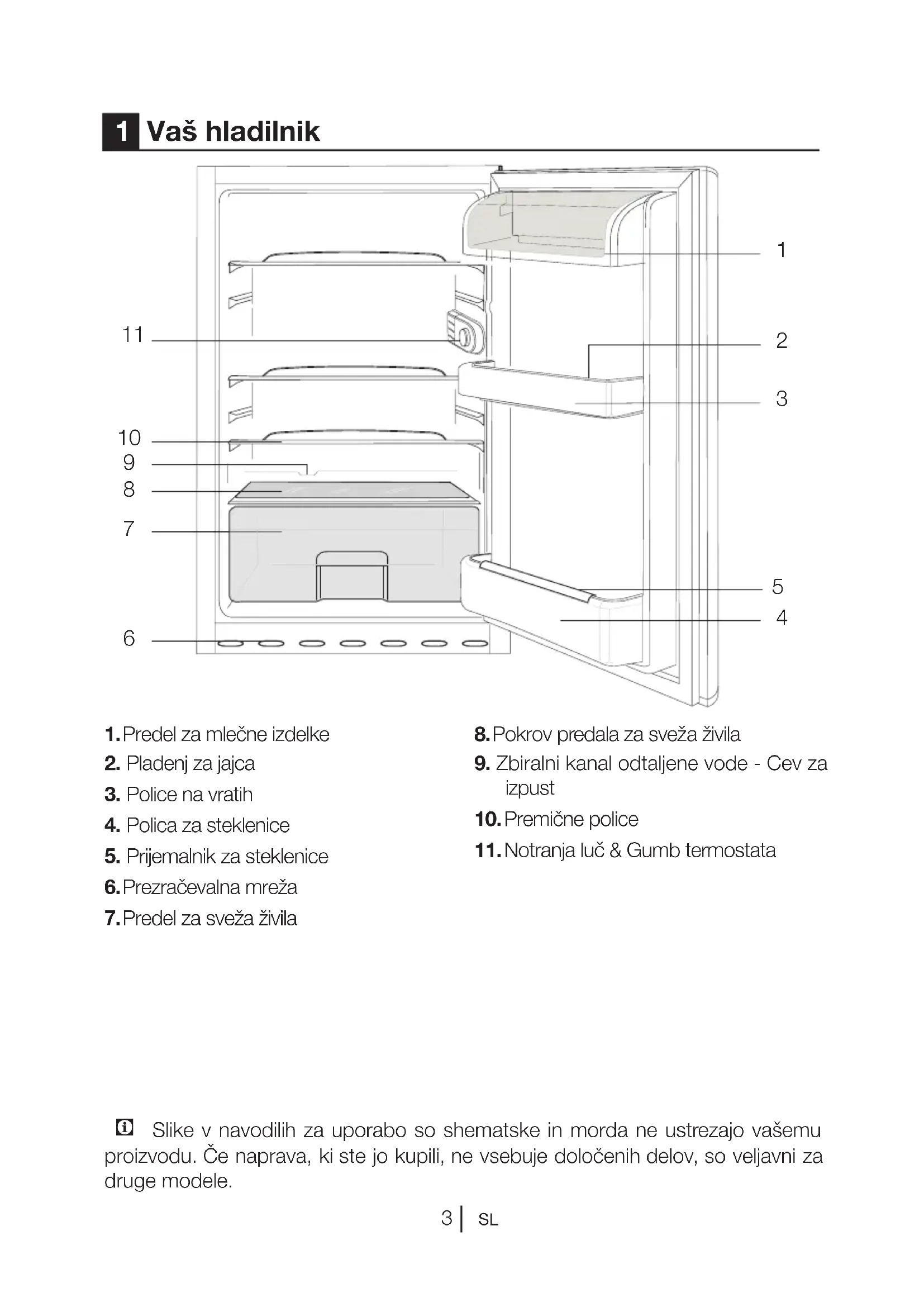 1 Vaš hladilnik C Slike v navodilih za uporabo so shematske in morda ne ustrezajo vašemu proizvodu. Če naprava, ki ste jo kupili, ne vsebuje določenih delov, so veljavni za druge modele.