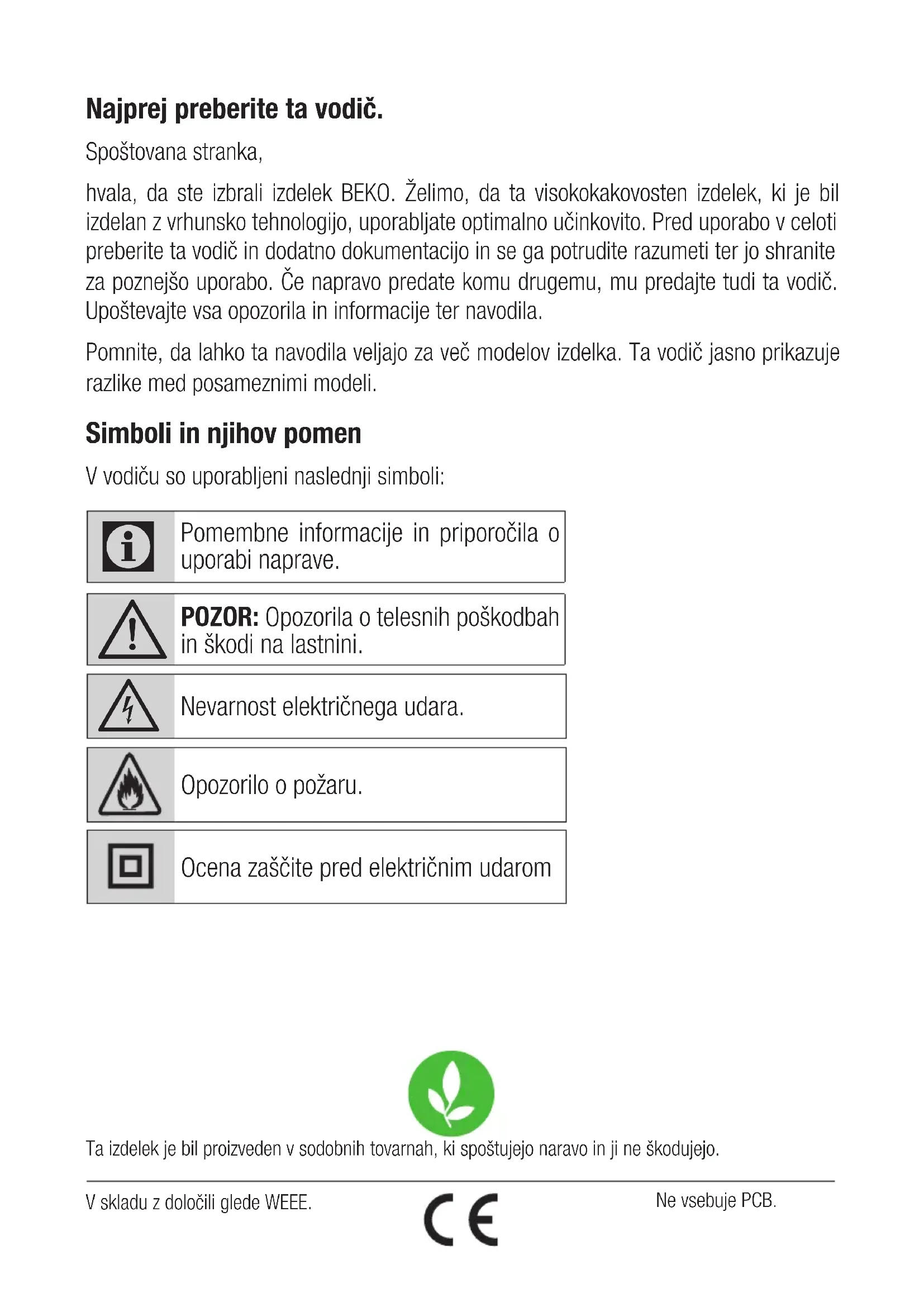 - Izdelki Beko ustrezajo veljavnim varnostnim standardom. Zato, če je naprava ali njen napa- jalni kabel poškodovan, jo mora popraviti ali zamenjati prodajalec, servisni center ali strokovnjak in pooblaščeni servis. Nepravilna ali neustrezna popravila lahko pred- stavljajo tveganje in nevarnost za uporabnika.