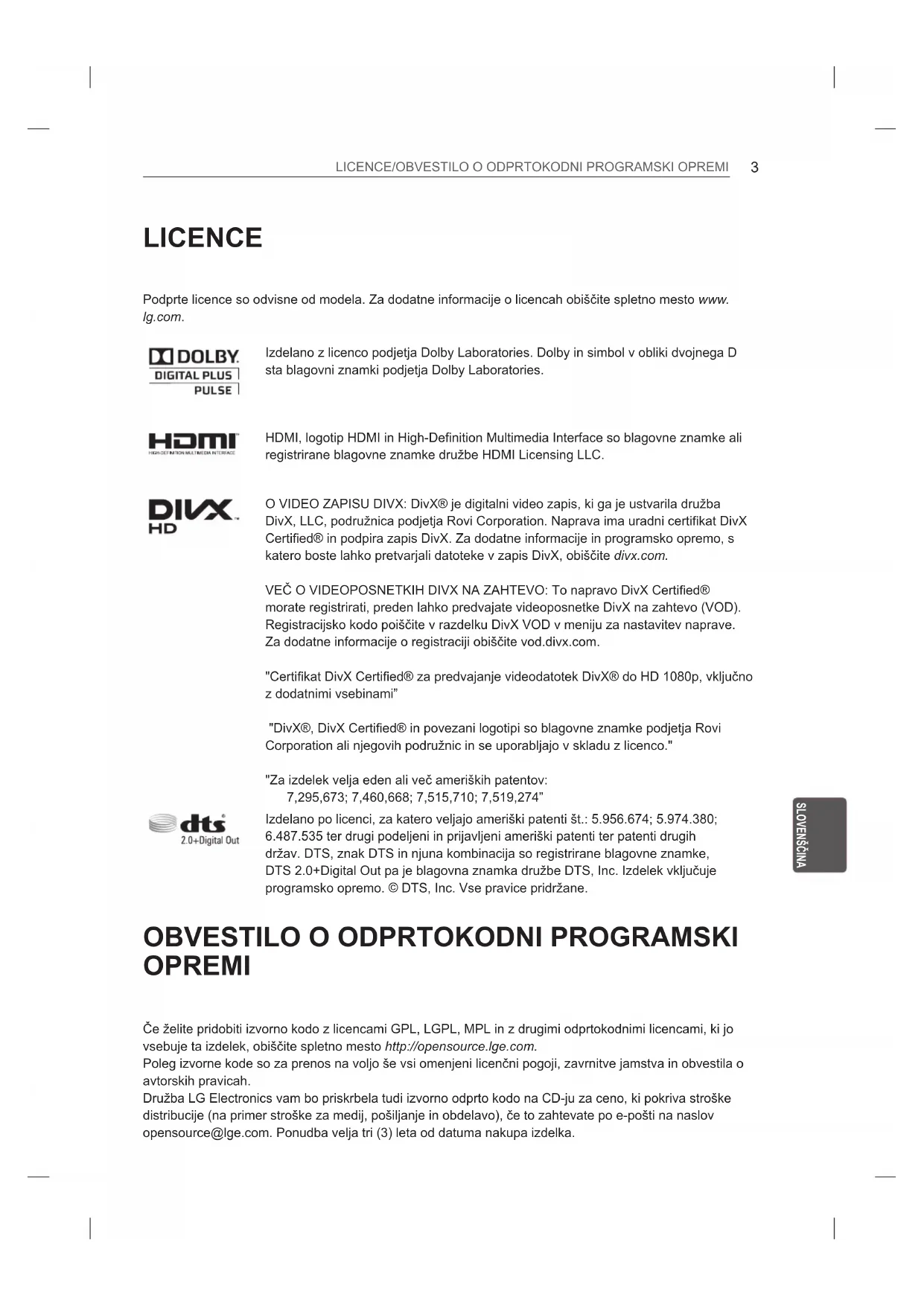 LICENCE Podprte licence so odvisne od modela. Za dodatne informacije o licencah obiščite spletno mesto www. lg.com. Izdelano z licenco podjetja Dolby Laboratories. Dolby in simbol v obliki dvojnega D sta blagovni znamki podjetja Dolby Laboratories. HDMI, logotip HDMI in High-Definition Multimedia Interface so blagovne znamke ali registrirane blagovne znamke družbe HDMI Licensing LLC. O VIDEO ZAPISU DIVX: DivX® je digitalni video zapis, ki ga je ustvarila družba DivX, LLC, podružnica podjetja Rovi Corporation. Naprava ima uradni certikat DivX Certied® in podpira zapis DivX. Za dodatne informacije in programsko opremo, s katero boste lahko pretvarjali datoteke v zapis DivX, obiščite divx.com. VEČ O VIDEOPOSNETKIH DIVX NA ZAHTEVO: To napravo DivX Certied® morate registrirati, preden lahko predvajate videoposnetke DivX na zahtevo (VOD). Registracijsko kodo poiščite v razdelku DivX VOD v meniju za nastavitev naprave. Za dodatne informacije o registraciji obiščite vod.divx.com. "Certikat DivX Certied® za predvajanje videodatotek DivX® do HD 1080p, vključno z dodatnimi vsebinami” "DivX®, DivX Certied® in povezani logotipi so blagovne znamke podjetja Rovi Corporation ali njegovih podružnic in se uporabljajo v skladu z licenco." "Za izdelek velja eden ali več ameriških patentov: 7,295,673; 7,460,668; 7,515,710; 7,519,274” Izdelano po licenci, za katero veljajo ameriški patenti št.: 5.956.674; 5.974.380;