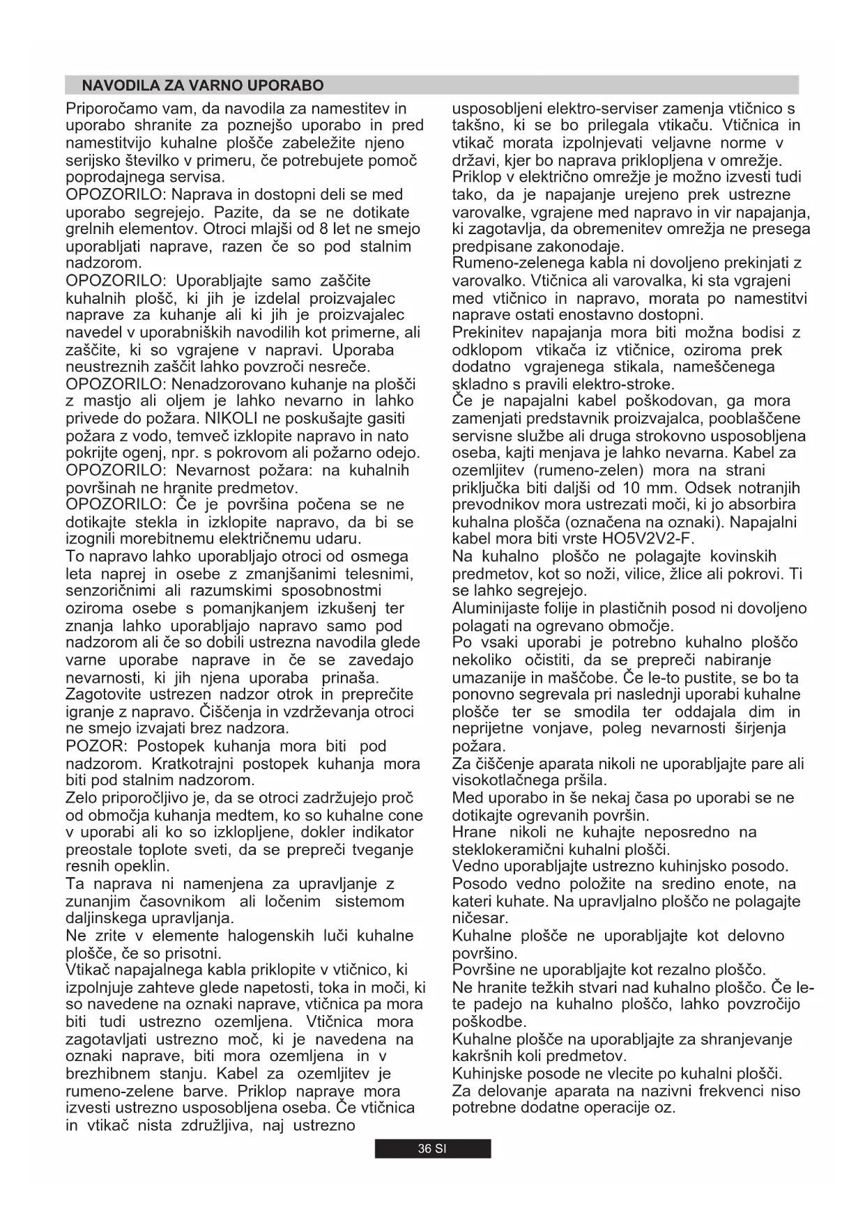 ZA UPORABNIKA Dovoljena je samo namenska uporaba kuhalne plošče, tj. za kuhanje v gospodinjstvih. Drugačna uporaba ni dovoljena in predstavlja tveganje za uporabnika. Proizvajalec ne prevzema odgovornosti za poškodbe ali škodo zaradi nenamenske uporabe.