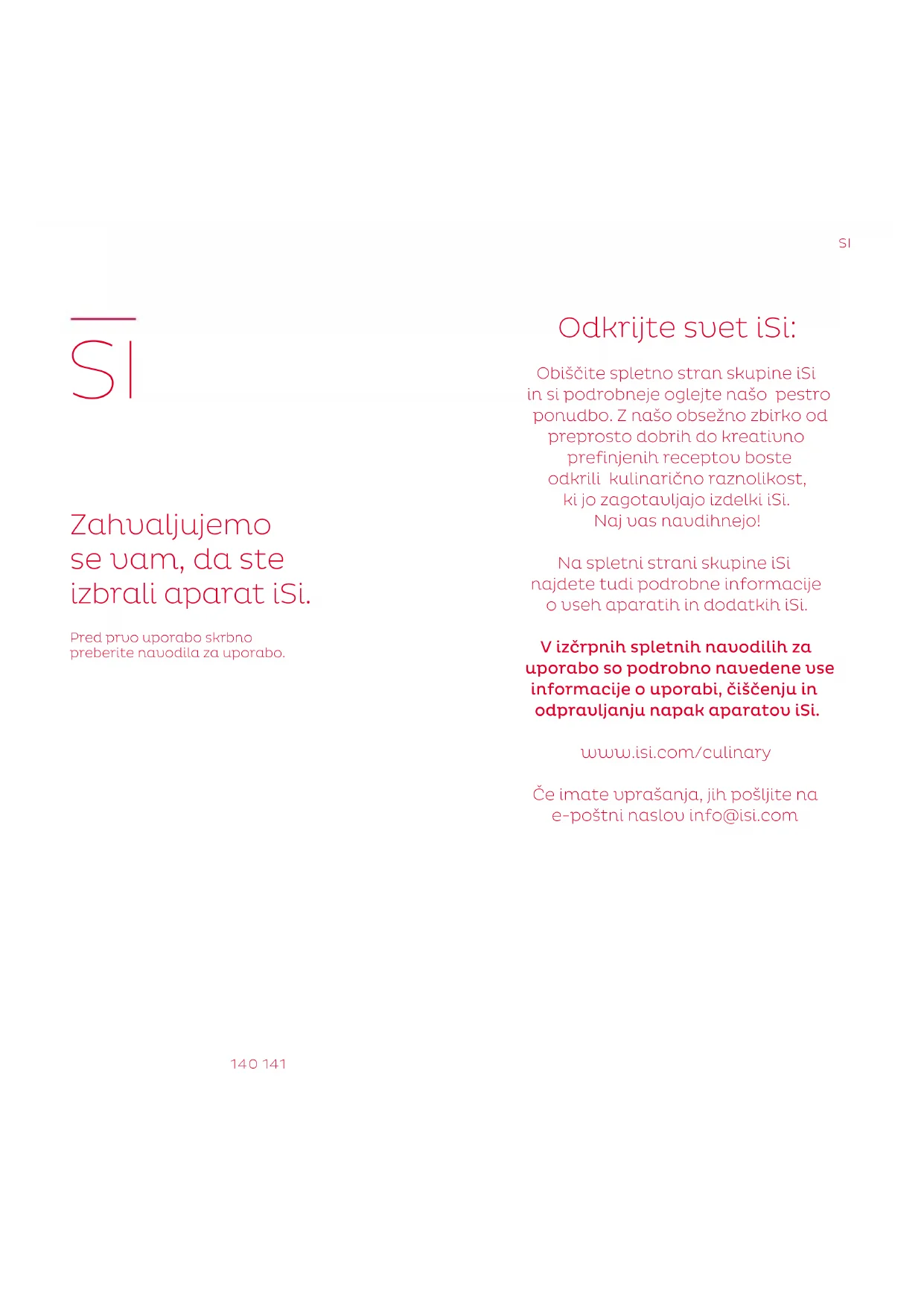 Odkrijte svet iSi: Obiščite spletno stran skupine iSi in si podrobneje oglejte našo pestro ponudbo. Z našo obsežno zbirko od preprosto dobrih do kreativno prefinjenih receptov boste odkrili kulinarično raznolikost, ki jo zagotavljajo izdelki iSi. Naj vas navdihnejo! Na spletni strani skupine iSi najdete tudi podrobne informacije o vseh aparatih in dodatkih iSi. V izčrpnih spletnih navodilih za uporabo so podrobno navedene vse informacije o uporabi, čiščenju in odpravljanju napak aparatov iSi. www.isi.com/culinary Če imate vprašanja, jih pošljite na e-poštni naslov info@isi.com142 143