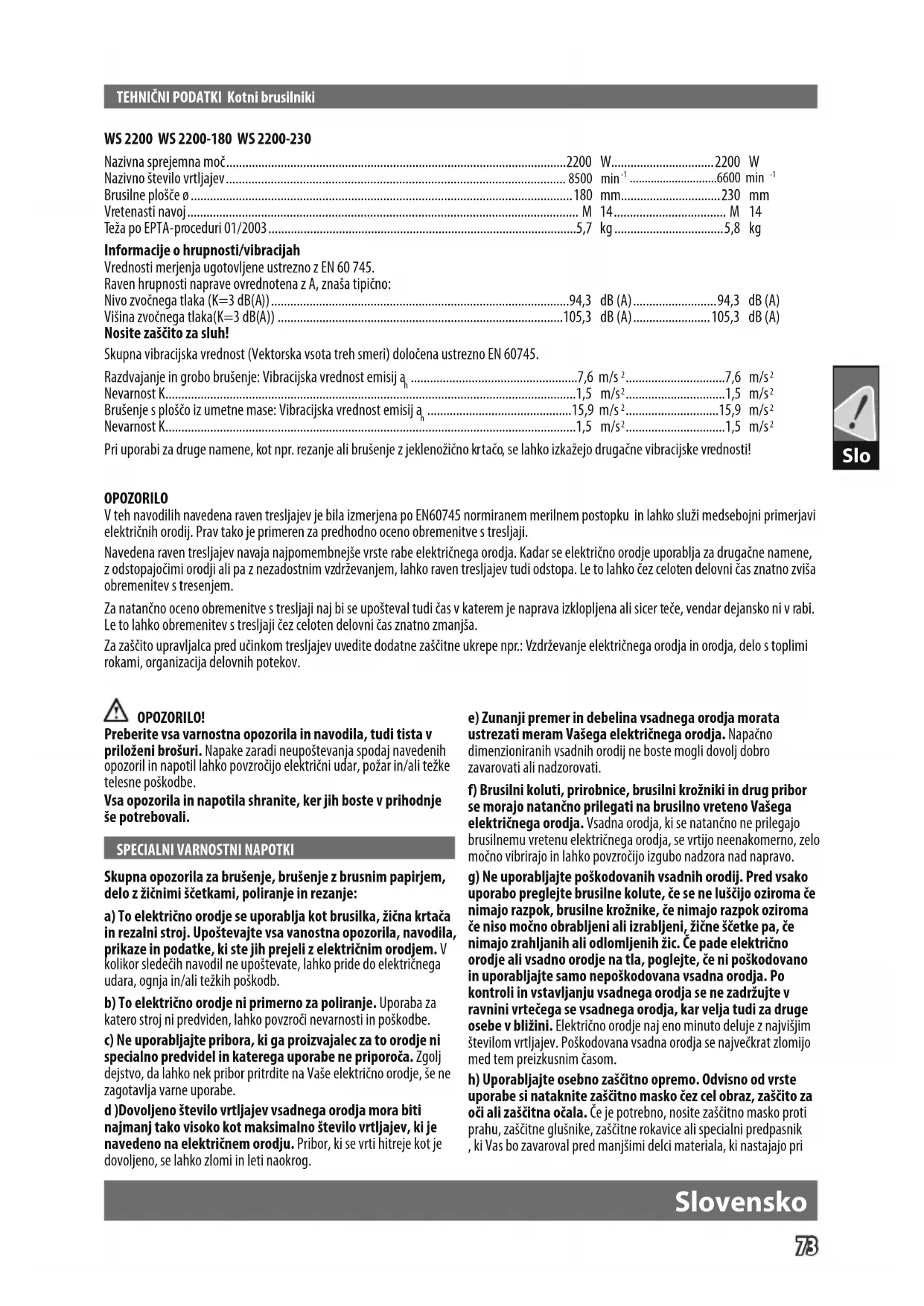Pri uporabi za druge namene, kot npr. rezanje ali brušenje z jeklenožično krtačo, se lahko izkažejo drugačne vibracijske vrednosti! OPOZORILO V teh navodilih navedena raven tresljajev je bila izmerjena po EN60745 normiranem merilnem postopku in lahko služi medsebojni primerjavi električnih orodij. Prav tako je primeren za predhodno oceno obremenitve s tresljaji. Navedena raven tresljajev navaja najpomembnejše vrste rabe električnega orodja. Kadar se električno orodje uporablja za drugačne namene, z odstopajočimi orodji ali pa z nezadostnim vzdrževanjem, lahko raven tresljajev tudi odstopa. Le to lahko čez celoten delovni čas znatno zviša obremenitev s tresenjem. Za natančno oceno obremenitve s tresljaji naj bi se upošteval tudi čas v katerem je naprava izklopljena ali sicer teče, vendar dejansko ni v rabi. Le to lahko obremenitev s tresljaji čez celoten delovni čas znatno zmanjša. Za zaščito upravljalca pred učinkom tresljajev uvedite dodatne zaščitne ukrepe npr.: Vzdrževanje električnega orodja in orodja, delo s toplimi rokami, organizacija delovnih potekov. OPOZORILO! Preberite vsa varnostna opozorila in navodila, tudi tista v priloženi brošuri. Napake zaradi neupoštevanja spodaj navedenih opozoril in napotil lahko povzročijo električni udar, požar in/ali težke telesne poškodbe. Vsa opozorila in napotila shranite, ker jih boste v prihodnje še potrebovali.