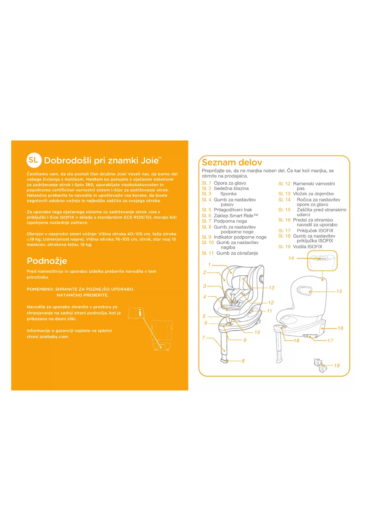 Čestitamo vam, da ste postali član družine Joie! Veseli nas, da bomo del vašega življenja z malčkom. Medtem ko potujete z ojačanim sistemom za zadrževanje otrok i-Spin 360, uporabljate visokokakovosten in popolnoma certificiran varnostni sistem i-Size za zadrževanje otrok. Natančno preberite ta navodila in upoštevajte vse korake, da boste zagotovili udobno vožnjo in najboljšo zaščito za svojega otroka.Za uporabo tega ojačanega sistema za zadrževanje otrok Joie s priključki i-Size ISOFIX v skladu s standardom ECE R129/03, morajo biti izpolnjene naslednje zahteve.Obrnjen v nasprotni smeri vožnje: Višina otroka 40–105 cm, teža otroka 19 kg; Usmerjenost naprej: Višina otroka 76–105cm, otrok, star vsaj 15 mesecev, otrokova teža 19kg; Podnožje Pred namestitvijo in uporabo izdelka preberite navodila v tem priročniku.POMEMBNO: SHRANITE ZA POZNEJŠO UPORABO. NATANČNO PREBERITE.Navodila za uporabo shranite v prostoru za shranjevanje na zadnji strani podnožja, kot je prikazano na desni sliki.Informacije o garanciji najdete na spletni strani joiebaby.com. Seznam delov Sl. 1 Opora za glavoSl. 2 Sedežna blazinaSl. 3 SponkaSl. 4 Gumb za nastavitev pasovSl. 5 Prilagoditveni trakSl. 6 Zaklep Smart Ride™Sl. 7 Podporna nogaSl. 8 Gumb za nastavitev podporne nogeSl. 9 Indikator podporne nogeSl. 10 Gumb za nastavitev nagibaSl. 11 Gumb za obračanjeSl. 12 Ramenski varnostni pas Sl. 13 Vložek za dojenčkeSl. 14 Ročica za nastavitev opore za glavoSl. 15 Zaščita pred stranskimi udarciSl. 16 Predel za shrambo navodil za uporaboSl. 17 Priključek ISOFIXSl. 18 Gumb za nastavitev priključka ISOFIXSl. 19 Vodila ISOFIXPrepričajte se, da ne manjka noben del. Če kar koli manjka, se obrnite na prodajalca.