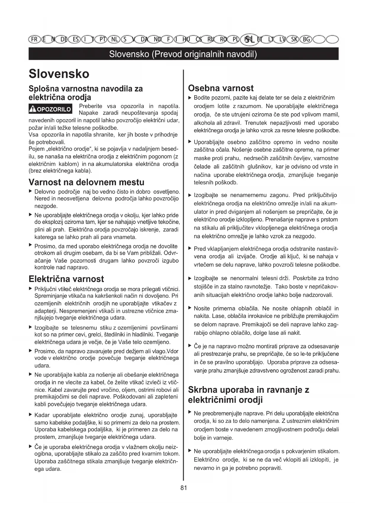 izteče tekočina. Izogibajte se kontaktu z njo. Pri naključnem kontaktu s kožo spirajte z vodo. Če pride tekočina v oko, dodatno poiščite tudi zdravniško pomoč. Iztekajoča akum- ulatorska tekočina lahko povzroči draženje kože ali opekline. S L FR E N DE ES I T PT NL S V DA NO F I HU CS RU RO PL HR ET LT LV SK BGSlovensko (Prevod originalnih navodil)