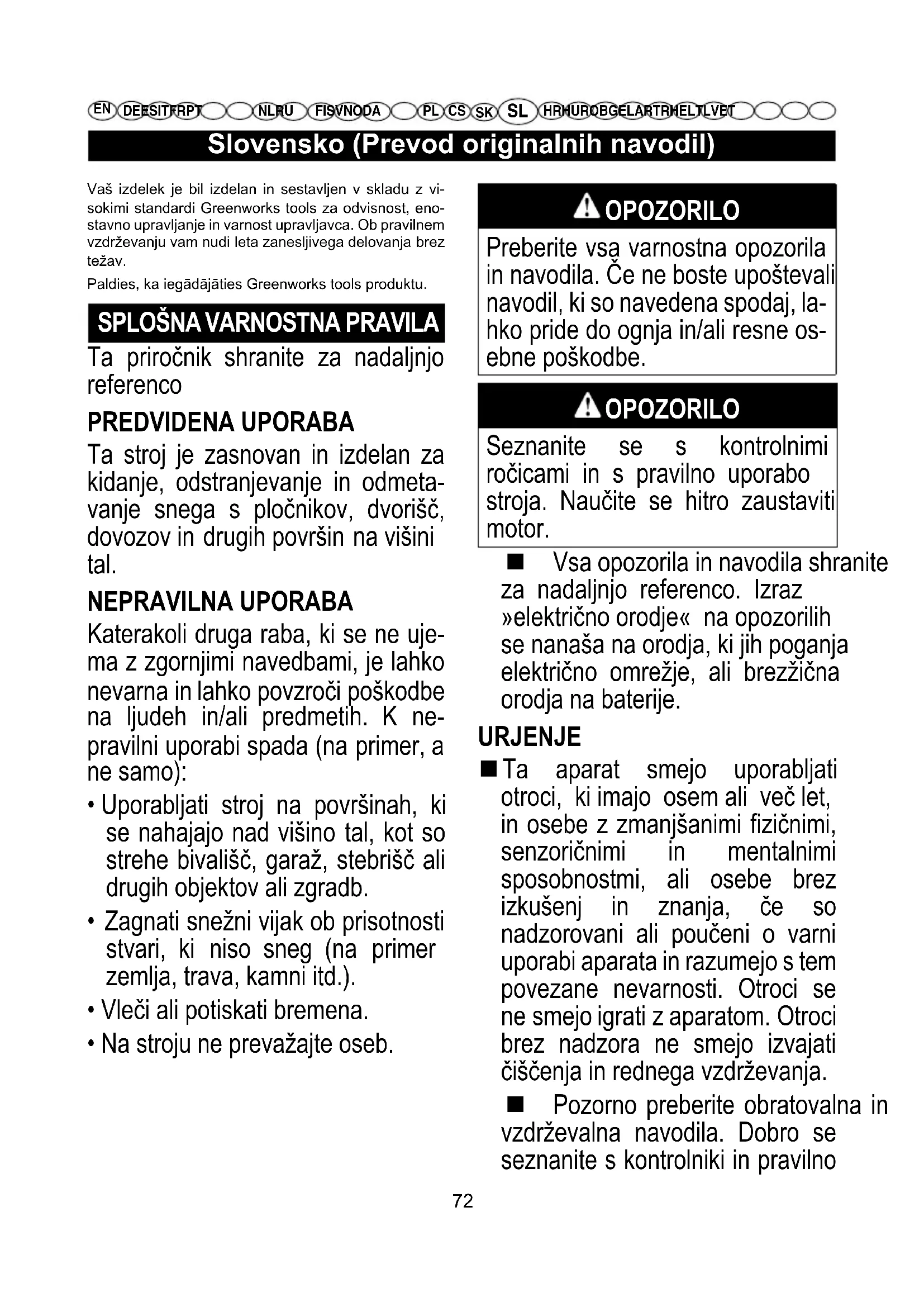 DE ES IT FR PTNL RUFI SV NO DA HR HU RO BG EL AR TR HE LT LV ET OPOZORILO Preberite vsa varnostna opozorila in navodila. Če ne boste upoštevali navodil, ki so navedena spodaj, la- hko pride do ognja in/ali resne os- ebne poškodbe. OPOZORILO Seznanite se s kontrolnimi ročicami in s pravilno uporabo stroja. Naučite se hitro zaustaviti motor. Vsa opozorila in navodila shranite za nadaljnjo referenco. Izraz »električno orodje« na opozorilih se nanaša na orodja, ki jih poganja električno omrežje, ali brezžična orodja na baterije. URJENJE Ta aparat smejo uporabljati otroci, ki imajo osem ali več let, in osebe z zmanjšanimi fizičnimi, senzoričnimi in mentalnimi sposobnostmi, ali osebe brez izkušenj in znanja, če so nadzorovani ali poučeni o varni uporabi aparata in razumejo s tem povezane nevarnosti. Otroci se ne smejo igrati z aparatom. Otroci brez nadzora ne smejo izvajati čiščenja in rednega vzdrževanja. Pozorno preberite obratovalna in vzdrževalna navodila. Dobro se seznanite s kontrolniki in pravilno Vaš izdelek je bil izdelan in sestavljen v skladu z vi- sokimi standardi Greenworks tools za odvisnost, eno- stavno upravljanje in varnost upravljavca. Ob pravilnem vzdrževanju vam nudi leta zanesljivega delovanja brez težav. Paldies, ka iegādājāties Greenworks tools produktu.