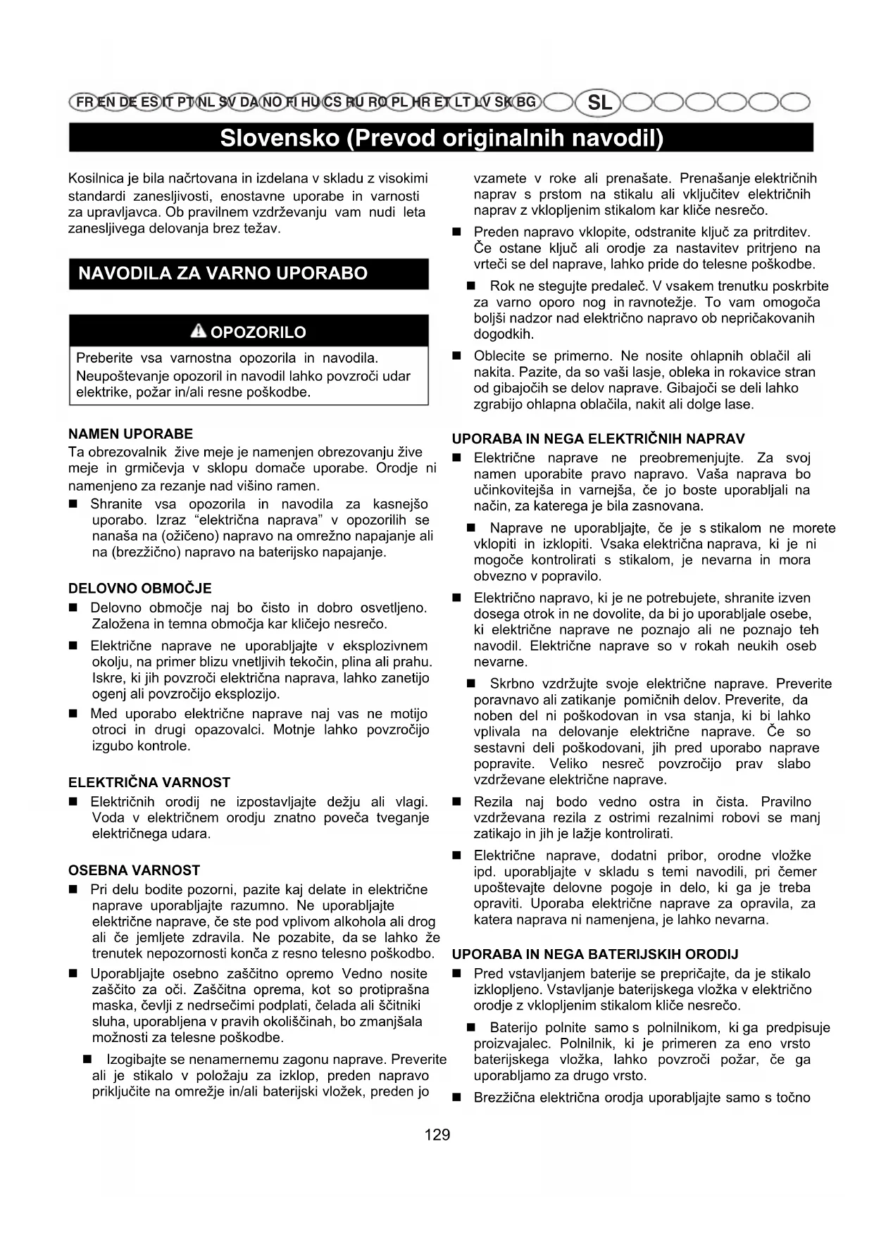 FR EN DE ES IT PT NL SV DA NO FI HU CS RU RO PL HR ET LT LV SK BG Kosilnica je bila načrtovana in izdelana v skladu z visokimi standardi zanesljivosti, enostavne uporabe in varnosti za upravljavca. Ob pravilnem vzdrževanju vam nudi leta zanesljivega delovanja brez težav.
