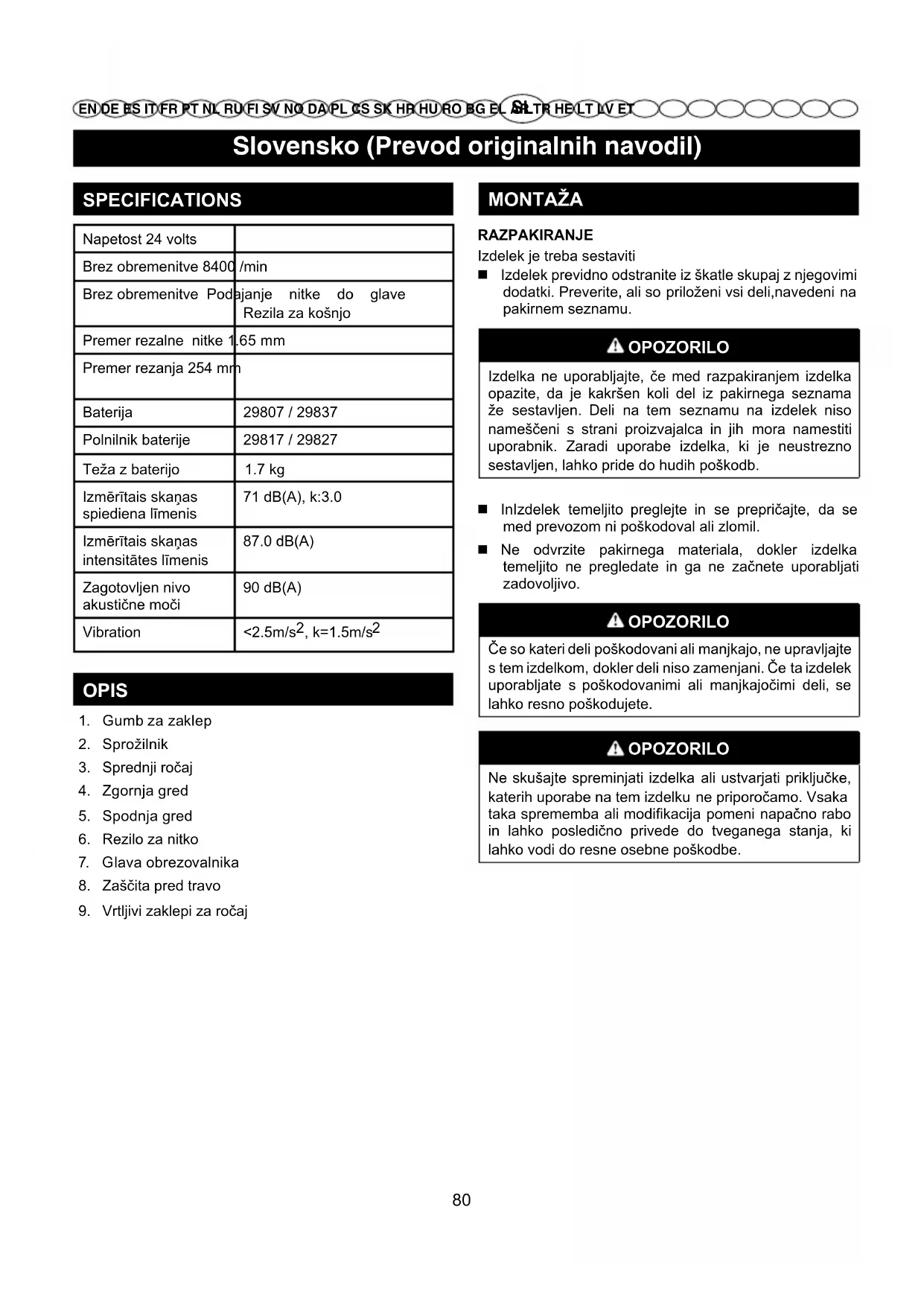 EN DE ES IT FR PT NL RU FI SV NO DA PL CS SK HR HU RO BG EL AR TR HE LT LV ET OPOZORILO Pred sestavljanjem delov vedno odklopite žico iz vžigalne svečke za motor, sicer ga lahko nenamerno vklopite in povzročite resne telesne poškodbe. PRITRJEVANJE SPREDNJEGA ROČAJA Glejte Sliko 2. OPOZORILO Rezila se ne dotikajte. V nasprotnem primeru lahko pride do hude telesne poškodbe. Z izvijačem Phillips z glave obrezovalnika odstranite vijak. Zaščito pred travo namestite na dvignjene nastavke na glavi obrezovalnika. Ponovno namestite vijak in ga zategnite v smeri urnega kazalca. OPOZORILO Čeprav mislite, da dobro poznate delovanje naprave, bodite zelo pazljivi. Le trenutek nepazljivosti je dovolj za resno osebno poškodbo. OPOZORILO Vedno nosite varnostna očala ali očala s stranskimi ščitniki, ko upravljate z orodji na elektriko. Če tega ne boste storili, vam lahko v oči padejo predmeti, kar lahko povzroči resno poškodbo. OPOZORILO Ne uporabljate priključkov ali dodatkov, ki jih proizvajalec tega izdelka ne priporoča. Uporaba priključkov ali dodatkov, ki niso priporočeni, lahko privede do resnih osebnih poškodb.
