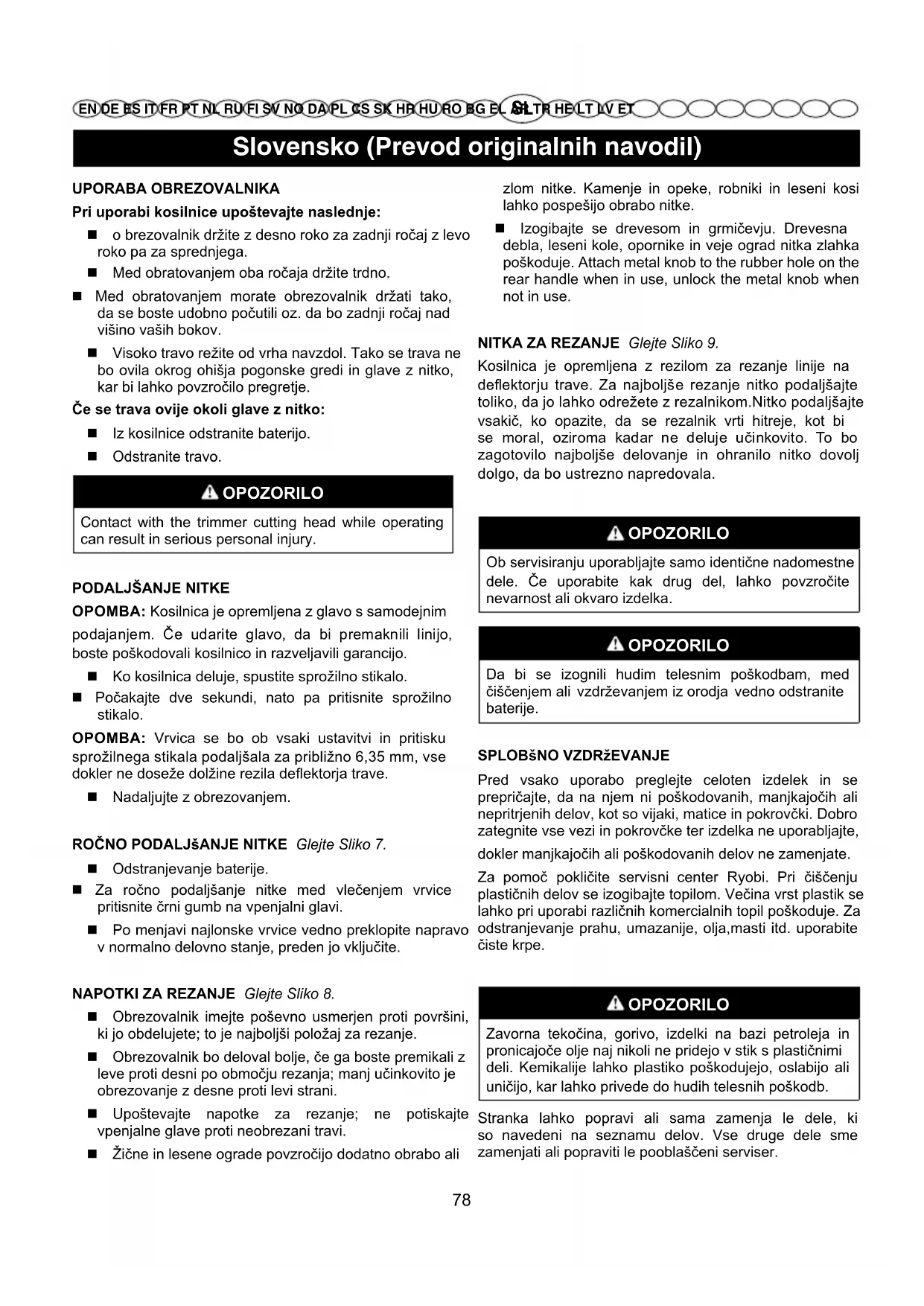 EN DE ES IT FR PT NL RU FI SV NO DA PL CS SK HR HU RO BG EL AR TR HE LT LV ET UPORABA OBREZOVALNIKA Pri uporabi kosilnice upoštevajte naslednje: o brezovalnik držite z desno roko za zadnji ročaj z levo roko pa za sprednjega. Med obratovanjem oba ročaja držite trdno. Med obratovanjem morate obrezovalnik držati tako, da se boste udobno počutili oz. da bo zadnji ročaj nad višino vaših bokov. Visoko travo režite od vrha navzdol. Tako se trava ne bo ovila okrog ohišja pogonske gredi in glave z nitko, kar bi lahko povzročilo pregretje. Če se trava ovije okoli glave z nitko: Iz kosilnice odstranite baterijo. Odstranite travo. OPOZORILO Contact with the trimmer cutting head while operating can result in serious personal injury.