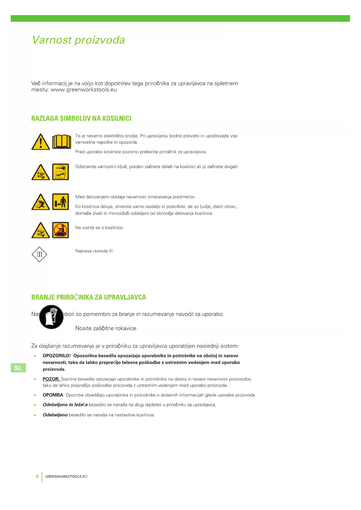 To je nevarno električno orodje. Pri upravljanju bodite previdni in upoštevajte vse varnostne napotke in opozorila. Pred uporabo kosilnice pozorno preberite priročnik za upravljavca. Odstranite varnostni ključ, preden začnete delati na kosilnici ali jo začnete dvigati. Med delovanjem obstaja nevarnost izmetavanja predmetov. Ko kosilnica deluje, ohranite varno razdaljo in poskrbite, da so ljudje, zlasti otroci, domače živali in mimoidoči oddaljeni od območja delovanja kosilnice. Ne vozite se s kosilnico. Naprava razreda III. Več informacij je na voljo kot dopolnitev tega priročnika za upravljavca na spletnem mestu: www.greenworkstools.eu