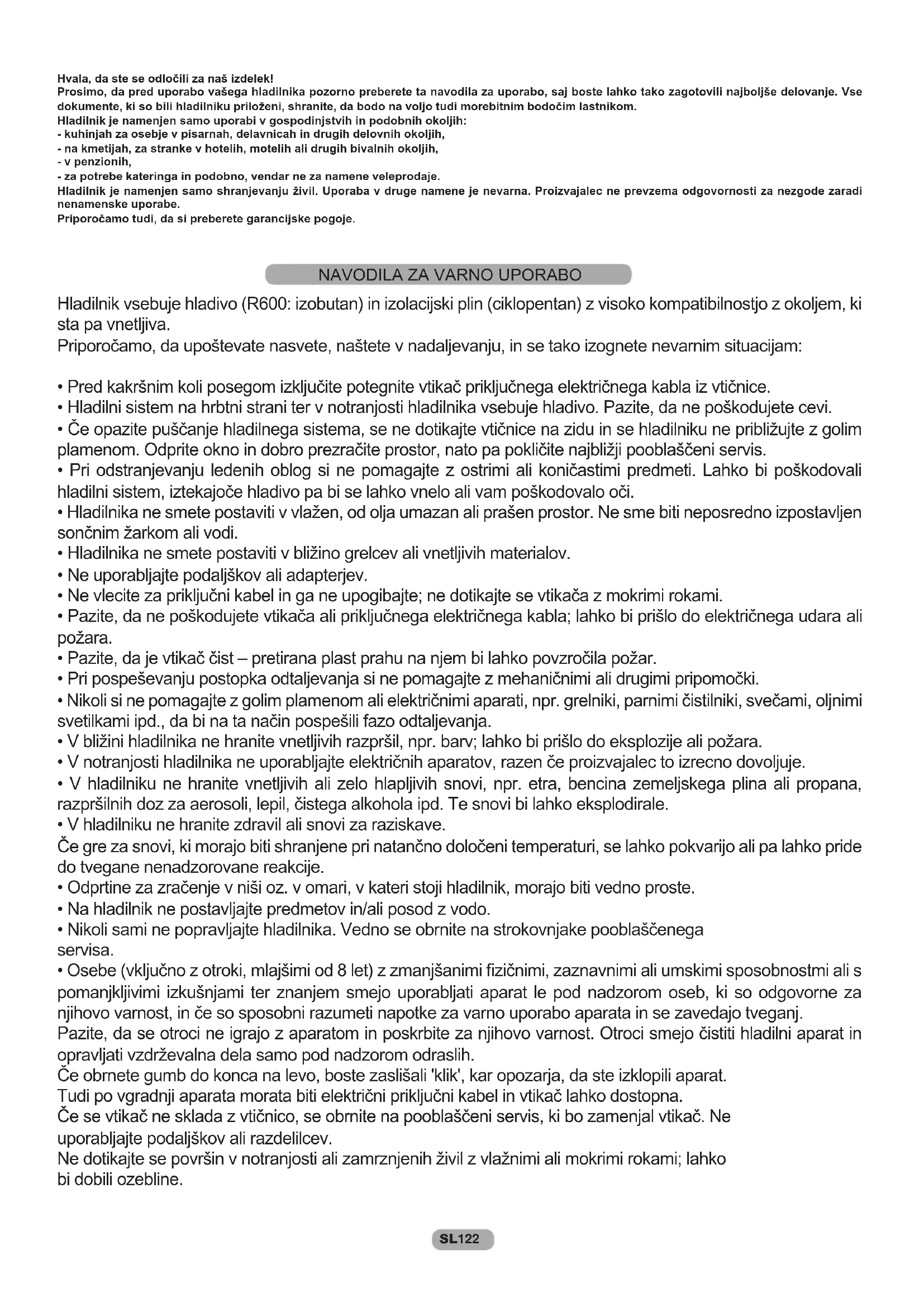 Hvala, da ste se odločili za naš izdelek! Prosimo, da pred uporabo vašega hladilnika pozorno preberete ta navodila za uporabo, saj boste lahko tako zagotovili najboljše delovanje. Vse dokumente, ki so bili hladilniku priloženi, shranite, da bodo na voljo tudi morebitnim bodočim lastnikom. Hladilnik je namenjen samo uporabi v gospodinjstvih in podobnih okoljih: - kuhinjah za osebje v pisarnah, delavnicah in drugih delovnih okoljih, - na kmetijah, za stranke v hotelih, motelih ali drugih bivalnih okoljih, - v penzionih, - za potrebe kateringa in podobno, vendar ne za namene veleprodaje. Hladilnik je namenjen samo shranjevanju živil. Uporaba v druge namene je nevarna. Proizvajalec ne prevzema odgovornosti za nezgode zaradi nenamenske uporabe. Priporočamo tudi, da si preberete garancijske pogoje. Hladilnik vsebuje hladivo (R600: izobutan) in izolacijski plin (ciklopentan) z visoko kompatibilnostjo z okoljem, ki sta pa vnetljiva. Priporočamo, da upoštevate nasvete, naštete v nadaljevanju, in se tako izognete nevarnim situacijam: