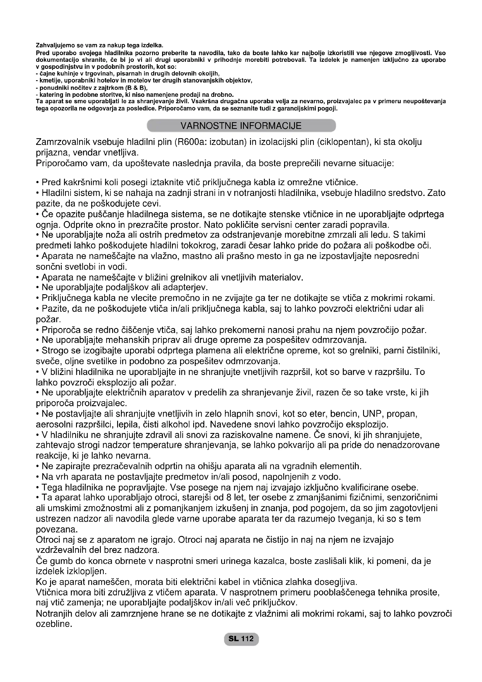 VSEBINASL 112 Zahvaljujemo se vam za nakup tega izdelka. Pred uporabo svojega hladilnika pozorno preberite ta navodila, tako da boste lahko kar najbolje izkoristili vse njegove zmogljivosti. Vso dokumentacijo shranite, če bi jo vi ali drugi uporabniki v prihodnje morebiti potrebovali. Ta izdelek je namenjen izključno za uporabo v gospodinjstvu in v podobnih prostorih, kot so: - čajne kuhinje v trgovinah, pisarnah in drugih delovnih okoljih, - kmetije, uporabniki hotelov in motelov ter drugih stanovanjskih objektov, - ponudniki nočitev z zajtrkom (B & B), - katering in podobne storitve, ki niso namenjene prodaji na drobno. Ta aparat se sme uporabljati le za shranjevanje živil. Vsakršna drugačna uporaba velja za nevarno, proizvajalec pa v primeru neupoštevanja tega opozorila ne odgovarja za posledice. Priporočamo vam, da se seznanite tudi z garancijskimi pogoji. Zamrzovalnik vsebuje hladilni plin (R600a: izobutan) in izolacijski plin (ciklopentan), ki sta okolju prijazna, vendar vnetljiva. Priporočamo vam, da upoštevate naslednja pravila, da boste preprečili nevarne situacije: