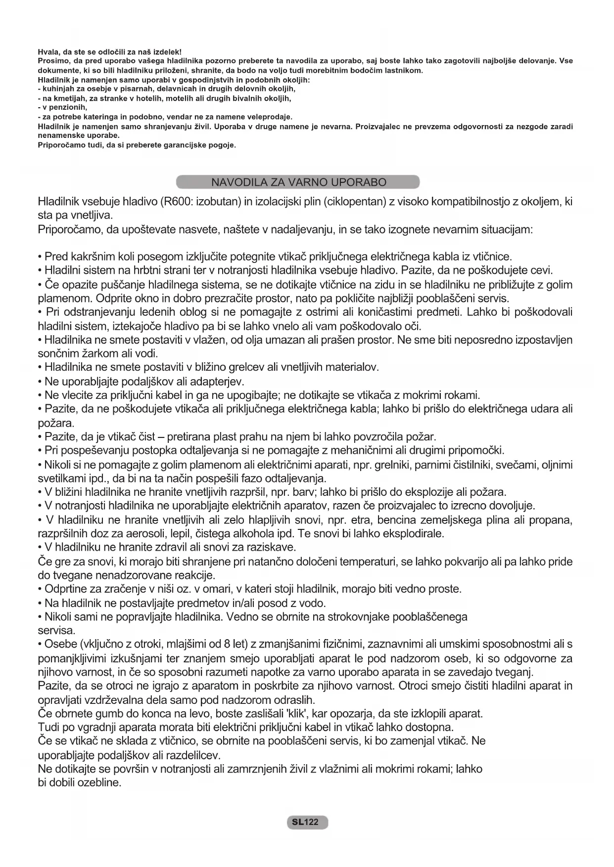 Hvala, da ste se odločili za naš izdelek! Prosimo, da pred uporabo vašega hladilnika pozorno preberete ta navodila za uporabo, saj boste lahko tako zagotovili najboljše delovanje. Vse dokumente, ki so bili hladilniku priloženi, shranite, da bodo na voljo tudi morebitnim bodočim lastnikom. Hladilnik je namenjen samo uporabi v gospodinjstvih in podobnih okoljih: - kuhinjah za osebje v pisarnah, delavnicah in drugih delovnih okoljih, - na kmetijah, za stranke v hotelih, motelih ali drugih bivalnih okoljih, - v penzionih, - za potrebe kateringa in podobno, vendar ne za namene veleprodaje. Hladilnik je namenjen samo shranjevanju živil. Uporaba v druge namene je nevarna. Proizvajalec ne prevzema odgovornosti za nezgode zaradi nenamenske uporabe. Priporočamo tudi, da si preberete garancijske pogoje. Hladilnik vsebuje hladivo (R600: izobutan) in izolacijski plin (ciklopentan) z visoko kompatibilnostjo z okoljem, ki sta pa vnetljiva. Priporočamo, da upoštevate nasvete, naštete v nadaljevanju, in se tako izognete nevarnim situacijam: