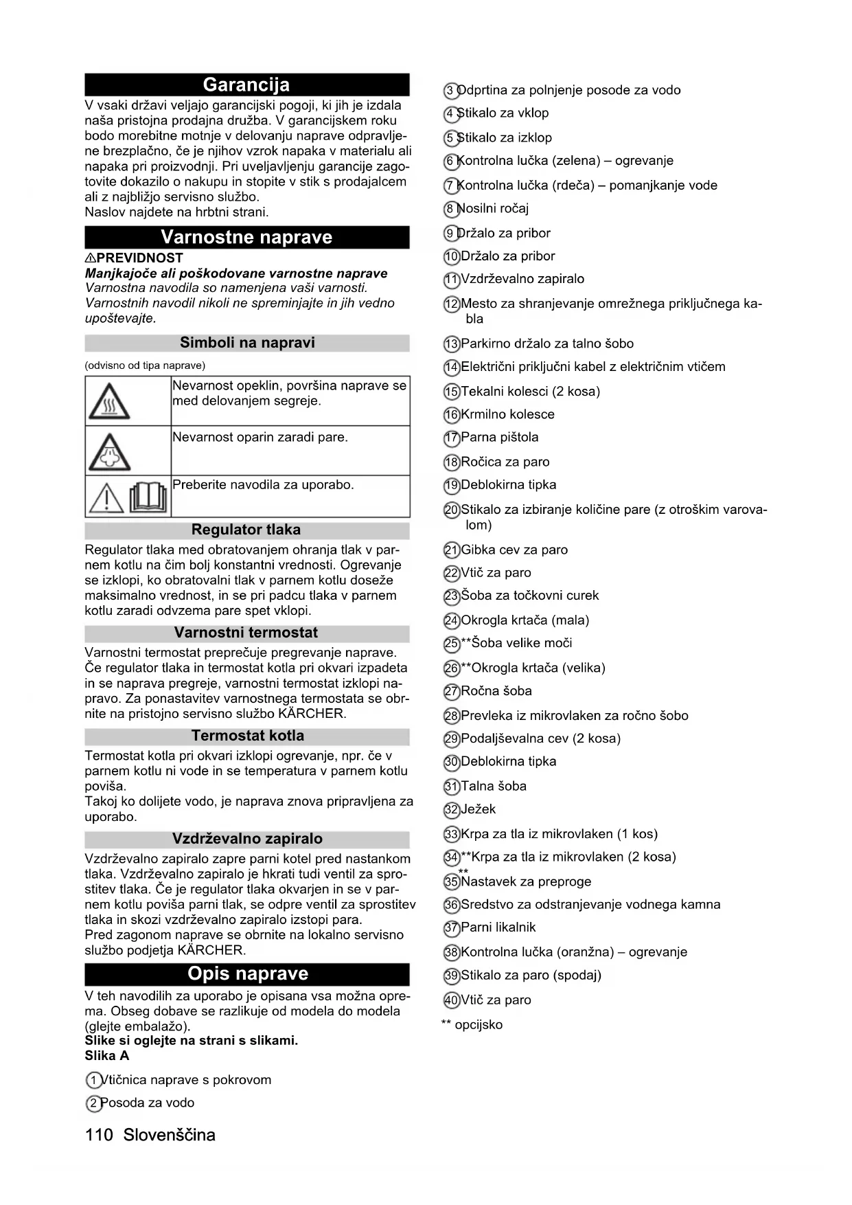 • Tehnični podatki 10 Slovenščina Garancija V vsaki državi veljajo garancijski pogoji, ki jih je izdala naša pristojna prodajna družba. V garancijskem roku bodo morebitne motnje v delovanju naprave odpravlje- ne brezplačno, če je njihov vzrok napaka v materialu ali napaka pri proizvodnji. Pri uveljavljenju garancije zago- tovite dokazilo o nakupu in stopite v stik s prodajalcem ali z najbližjo servisno službo. Naslov najdete na hrbtni strani. Varnostne naprave 몇 PREVIDNOST Manjkajoče ali poškodovane varnostne naprave Varnostna navodila so namenjena vaši varnosti. Varnostnih navodil nikoli ne spreminjajte in jih vedno upoštevajte. Simboli na napravi (odvisno od tipa naprave) Regulator tlaka Regulator tlaka med obratovanjem ohranja tlak v par- nem kotlu na čim bolj konstantni vrednosti. Ogrevanje se izklopi, ko obratovalni tlak v parnem kotlu doseže maksimalno vrednost, in se pri padcu tlaka v parnem kotlu zaradi odvzema pare spet vklopi. Varnostni termostat Varnostni termostat preprečuje pregrevanje naprave. Če regulator tlaka in termostat kotla pri okvari izpadeta in se naprava pregreje, varnostni termostat izklopi na- pravo. Za ponastavitev varnostnega termostata se obr- nite na pristojno servisno službo KÄRCHER. Termostat kotla Termostat kotla pri okvari izklopi ogrevanje, npr. če v parnem kotlu ni vode in se temperatura v parnem kotlu poviša. Takoj ko dolijete vodo, je naprava znova pripravljena za uporabo. Vzdrževalno zapiralo Vzdrževalno zapiralo zapre parni kotel pred nastankom tlaka. Vzdrževalno zapiralo je hkrati tudi ventil za spro- stitev tlaka. Če je regulator tlaka okvarjen in se v par- nem kotlu poviša parni tlak, se odpre ventil za sprostitev tlaka in skozi vzdrževalno zapiralo izstopi para. Pred zagonom naprave se obrnite na lokalno servisno službo podjetja KÄRCHER. Opis naprave V teh navodilih za uporabo je opisana vsa možna opre- ma. Obseg dobave se razlikuje od modela do modela (glejte embalažo). Slike si oglejte na strani s slikami. Slika A 1 Vtičnica naprave s pokrovom 2 Posoda za vodo 3 Odprtina za polnjenje posode za vodo 4 Stikalo za vklop 5 Stikalo za izklop 6 Kontrolna lučka (zelena) – ogrevanje 7 Kontrolna lučka (rdeča) – pomanjkanje vode 8 Nosilni ročaj 9 Držalo za pribor 10 Držalo za pribor 11 Vzdrževalno zapiralo 12 Mesto za shranjevanje omrežnega priključnega ka- bla 13 Parkirno držalo za talno šobo 14 Električni priključni kabel z električnim vtičem 15 Tekalni kolesci (2 kosa) 16 Krmilno kolesce 17 Parna pištola 18 Ročica za paro 19 Deblokirna tipka 20 Stikalo za izbiranje količine pare (z otroškim varova- lom) 21 Gibka cev za paro 22 Vtič za paro 23 Šoba za točkovni curek 24 Okrogla krtača (mala) 25 **Šoba velike moči 26 **Okrogla krtača (velika) 27 Ročna šoba 28 Prevleka iz mikrovlaken za ročno šobo 29 Podaljševalna cev (2 kosa) 30 Deblokirna tipka 31 Talna šoba 32 Ježek 33 Krpa za tla iz mikrovlaken (1 kos) 34 **Krpa za tla iz mikrovlaken (2 kosa) 35 Nastavek za preproge 36 Sredstvo za odstranjevanje vodnega kamna 37 Parni likalnik 38 Kontrolna lučka (oranžna) – ogrevanje 39 Stikalo za paro (spodaj) 40 Vtič za paro ** opcijsko Nevarnost opeklin, površina naprave se med delovanjem segreje. Nevarnost oparin zaradi pare. Preberite navodila za uporabo. **Slovenščina 111 Montaža Montaža pribora p. 1151