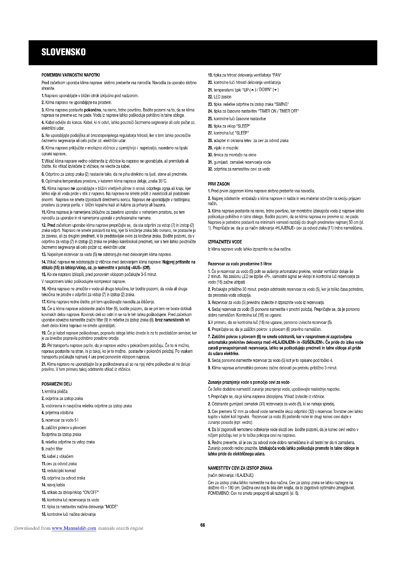 poškoduje pohištvo in talne obloge. Bodite pozorni, da se klima naprava ne prevrne oz. ne pade. Napravo je potrebno postaviti na minimalni varnosti razdalji do drugih predmetov najmanj 50 cm (sl. 1). Prepričajte se, da je za način delovanja »HLAJENJE« cev za odvod zraka (11) trdno nameščena. IZPRAZNITEV VODE Iz klima naprave vodo lahko izpraznite na dva načina. Rezervoar za vodo prostornine 5 litrov