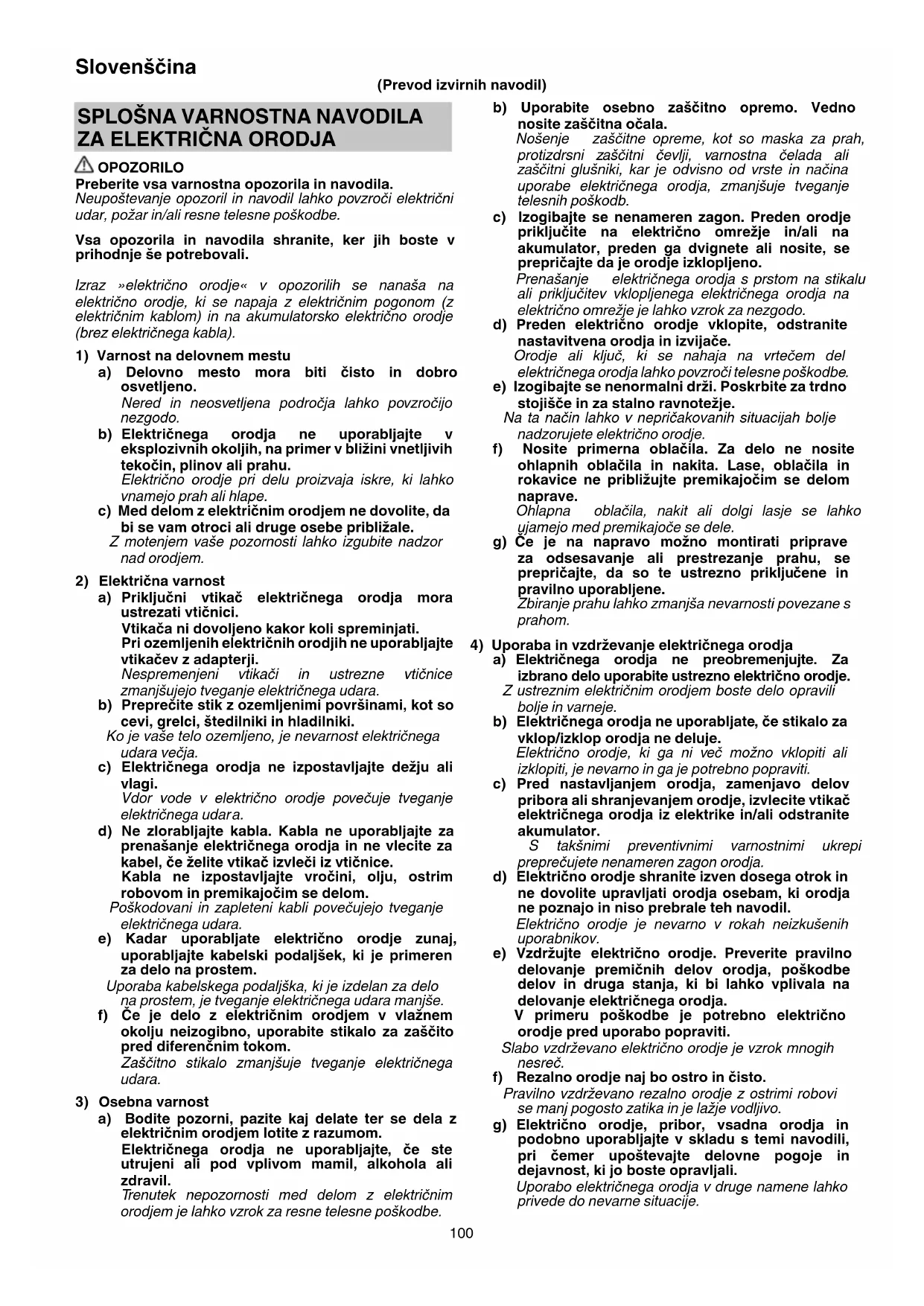 OPOZORILO Preberite vsa varnostna opozorila in navodila. Neupoštevanje opozoril in navodil lahko povzroči električni udar, požar in/ali resne telesne poškodbe. Vsa opozorila in navodila shranite, ker jih boste v prihodnje še potrebovali. Izraz »električno orodje« v opozorilih se nanaša na električno orodje, ki se napaja z električnim pogonom (z električnim kablom) in na akumulatorsko električno orodje (brez električnega kabla).