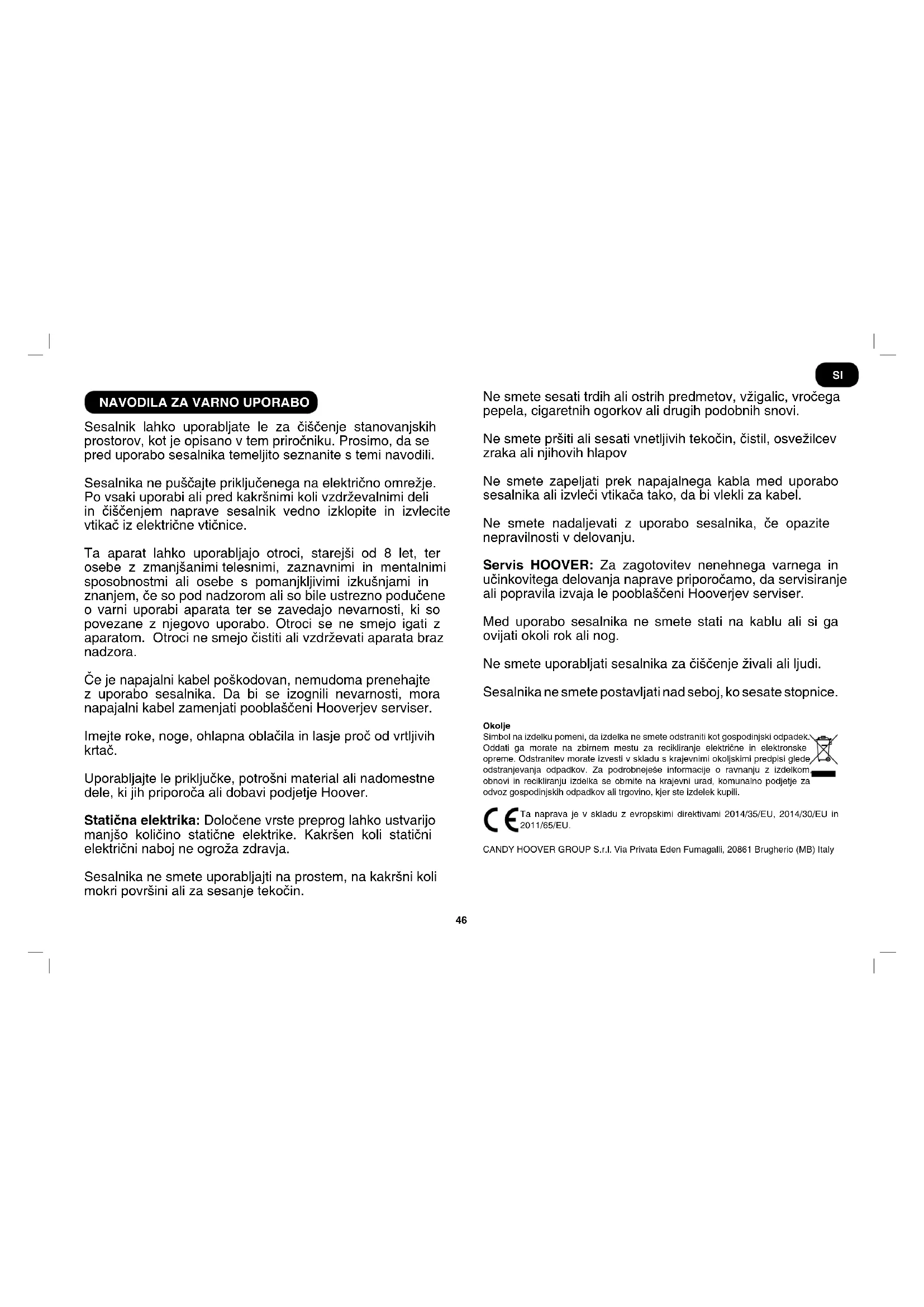 Sesalnik lahko uporabljate le za čiščenje stanovanjskih prostorov, kot je opisano v tem priročniku. Prosimo, da se pred uporabo sesalnika temeljito seznanite s temi navodili. Sesalnika ne puščajte priključenega na električno omrežje. Po vsaki uporabi ali pred kakršnimi koli vzdrževalnimi deli in čiščenjem naprave sesalnik vedno izklopite in izvlecite vtikač iz električne vtičnice. Ta aparat lahko uporabljajo otroci, starejši od 8 let, ter osebe z zmanjšanimi telesnimi, zaznavnimi in mentalnimi sposobnostmi ali osebe s pomanjkljivimi izkušnjami in znanjem, če so pod nadzorom ali so bile ustrezno podučene o varni uporabi aparata ter se zavedajo nevarnosti, ki so povezane z njegovo uporabo. Otroci se ne smejo igati z aparatom. Otroci ne smejo čistiti ali vzdrževati aparata braz nadzora. Če je napajalni kabel poškodovan, nemudoma prenehajte z uporabo sesalnika. Da bi se izognili nevarnosti, mora napajalni kabel zamenjati pooblaščeni Hooverjev serviser. Imejte roke, noge, ohlapna oblačila in lasje proč od vrtljivih krtač. Uporabljajte le priključke, potrošni material ali nadomestne dele, ki jih priporoča ali dobavi podjetje Hoover. Statična elektrika: Določene vrste preprog lahko ustvarijo manjšo količino statične elektrike. Kakršen koli statični električni naboj ne ogroža zdravja. Sesalnika ne smete uporabljajti na prostem, na kakršni koli mokri površini ali za sesanje tekočin. Ne smete sesati trdih ali ostrih predmetov, vžigalic, vročega pepela, cigaretnih ogorkov ali drugih podobnih snovi. Ne smete pršiti ali sesati vnetljivih tekočin, čistil, osvežilcev zraka ali njihovih hlapov Ne smete zapeljati prek napajalnega kabla med uporabo sesalnika ali izvleči vtikača tako, da bi vlekli za kabel. Ne smete nadaljevati z uporabo sesalnika, če opazite nepravilnosti v delovanju. Servis HOOVER: Za zagotovitev nenehnega varnega in učinkovitega delovanja naprave priporočamo, da servisiranje ali popravila izvaja le pooblaščeni Hooverjev serviser. Med uporabo sesalnika ne smete stati na kablu ali si ga ovijati okoli rok ali nog. Ne smete uporabljati sesalnika za čiščenje živali ali ljudi. Sesalnika ne smete postavljati nad seboj, ko sesate stopnice. Okolje Simbol na izdelku pomeni, da izdelka ne smete odstraniti kot gospodinjski odpadek. Oddati ga morate na zbirnem mestu za recikliranje električne in elektronske opreme. Odstranitev morate izvesti v skladu s krajevnimi okoljskimi predpisi glede odstranjevanja odpadkov. Za podrobneješe informacije o ravnanju z izdelkom, obnovi in recikliranju izdelka se obrnite na krajevni urad, komunalno podjetje za odvoz gospodinjskih odpadkov ali trgovino, kjer ste izdelek kupili. Ta naprava je v skladu z evropskimi direktivami 2014/35/EU, 2014/30/EU in 2011/65/EU. CANDY HOOVER GROUP S.r.l. Via Privata Eden Fumagalli, 20861 Brugherio (MB) Italy SISESTAVLJANJE SESALNIKA Iz embalaže odstranite vse sestavne dele.