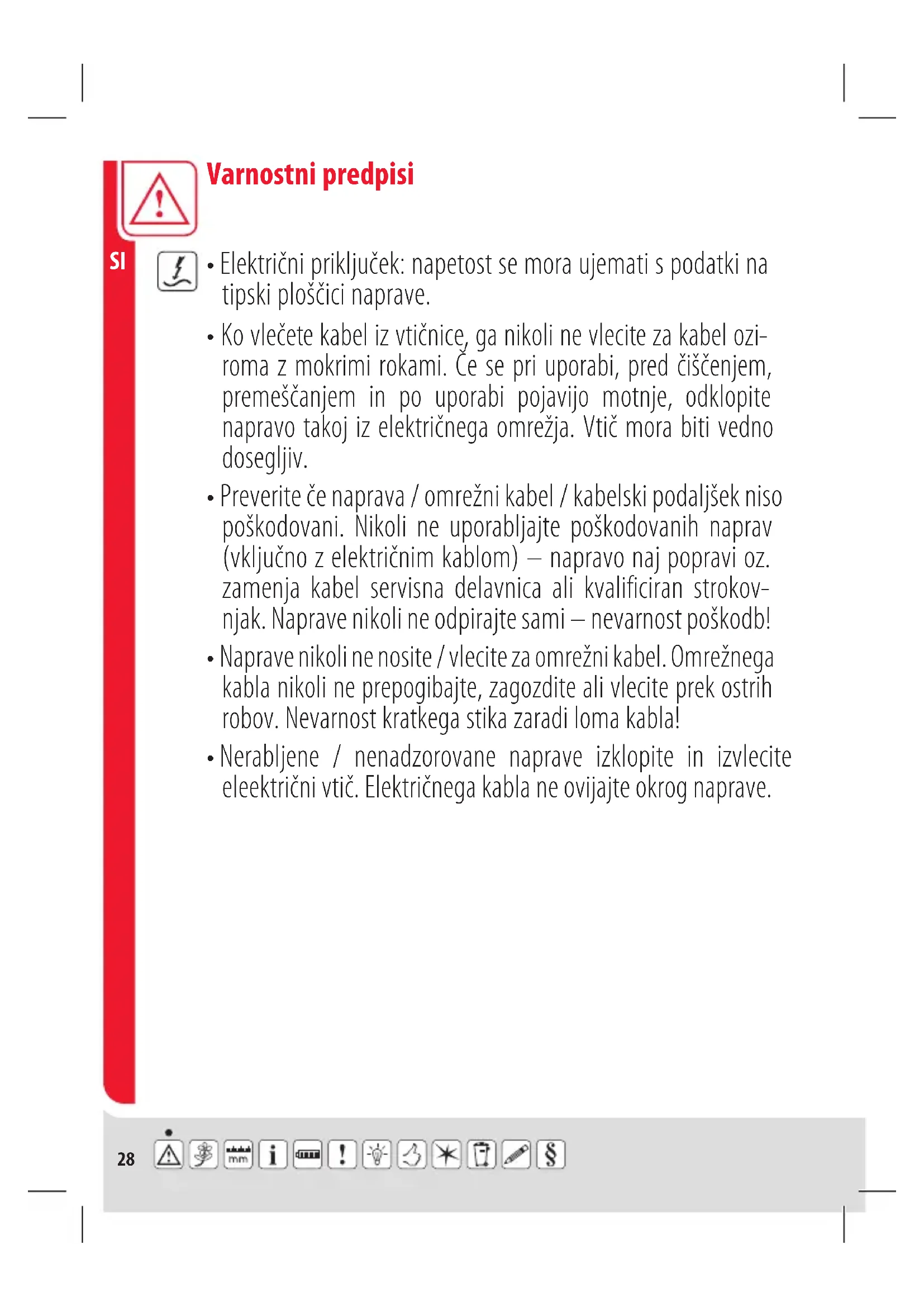 - Nerabljene / nenadzorovane naprave izklopite in izvlecite eleektrični vtič. Električnega kabla ne ovijajte okrog naprave. Varnostni predpisi29
