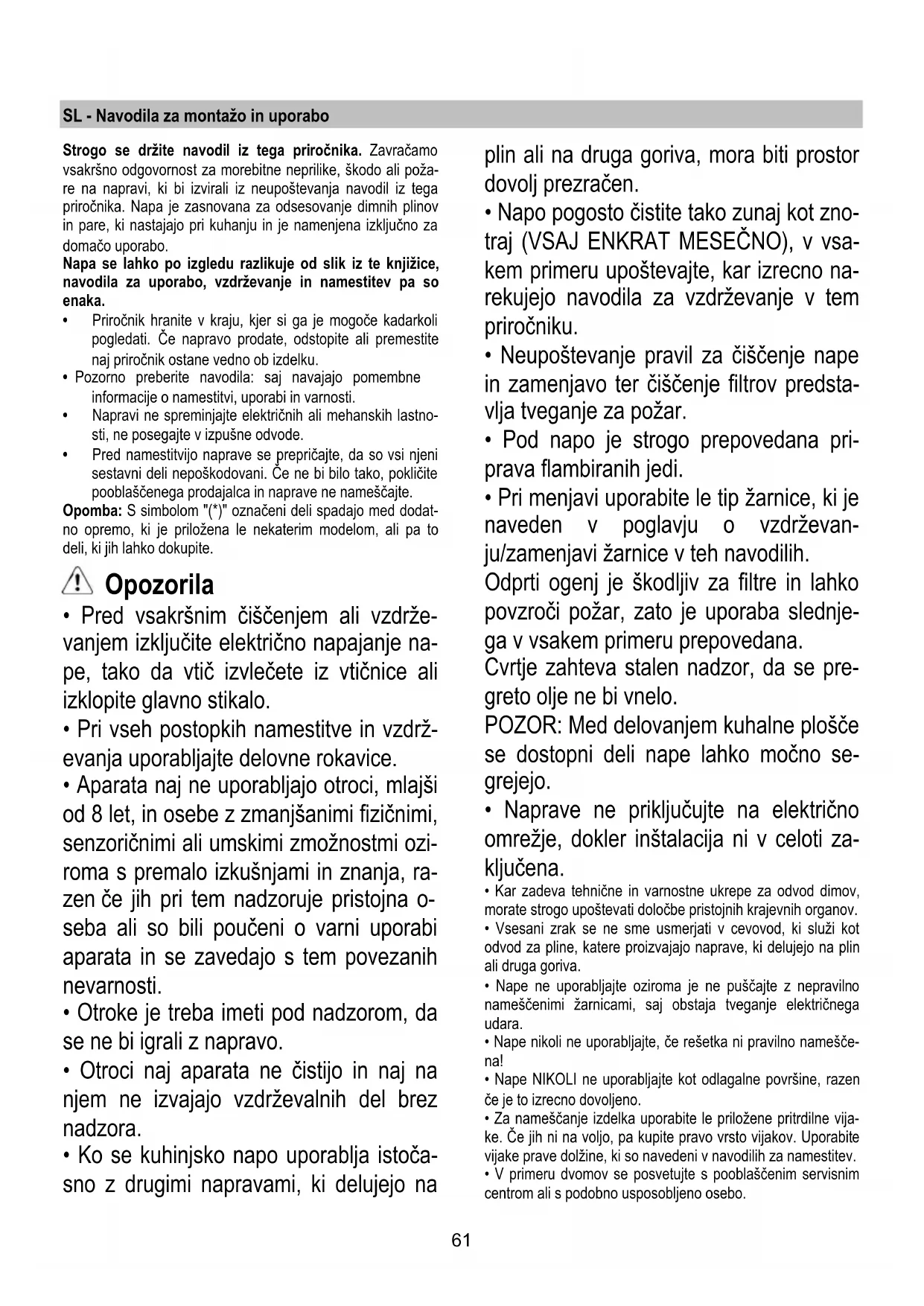- Neupoštevanje pravil za čiščenje nape in zamenjavo ter čiščenje filtrov predsta- vlja tveganje za požar.