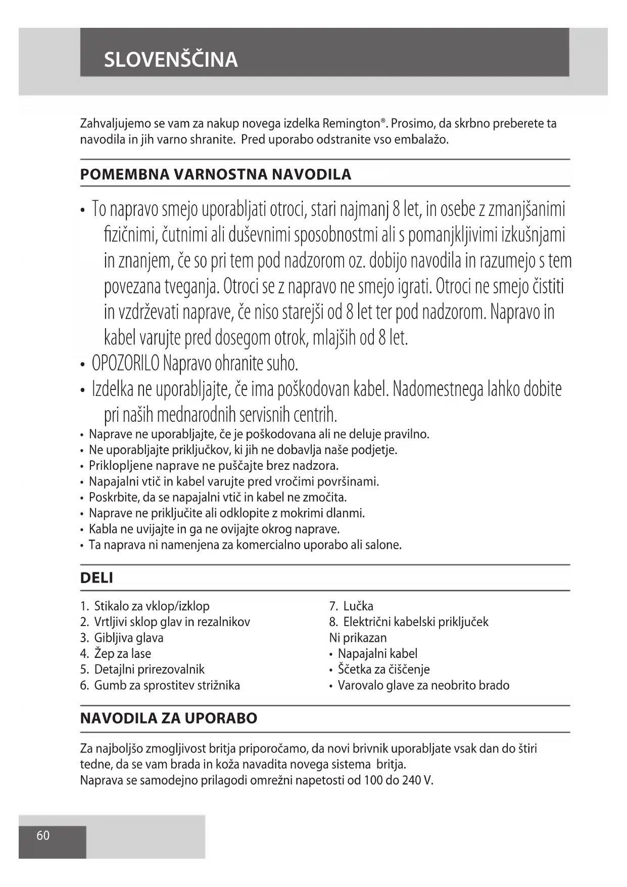 Za najboljšo zmogljivost britja priporočamo, da novi brivnik uporabljate vsak dan do štiri tedne, da se vam brada in koža navadita novega sistema britja. Naprava se samodejno prilagodi omrežni napetosti od 100 do 240 V. SLOVENŠČINA61 SLOVENŠČINA