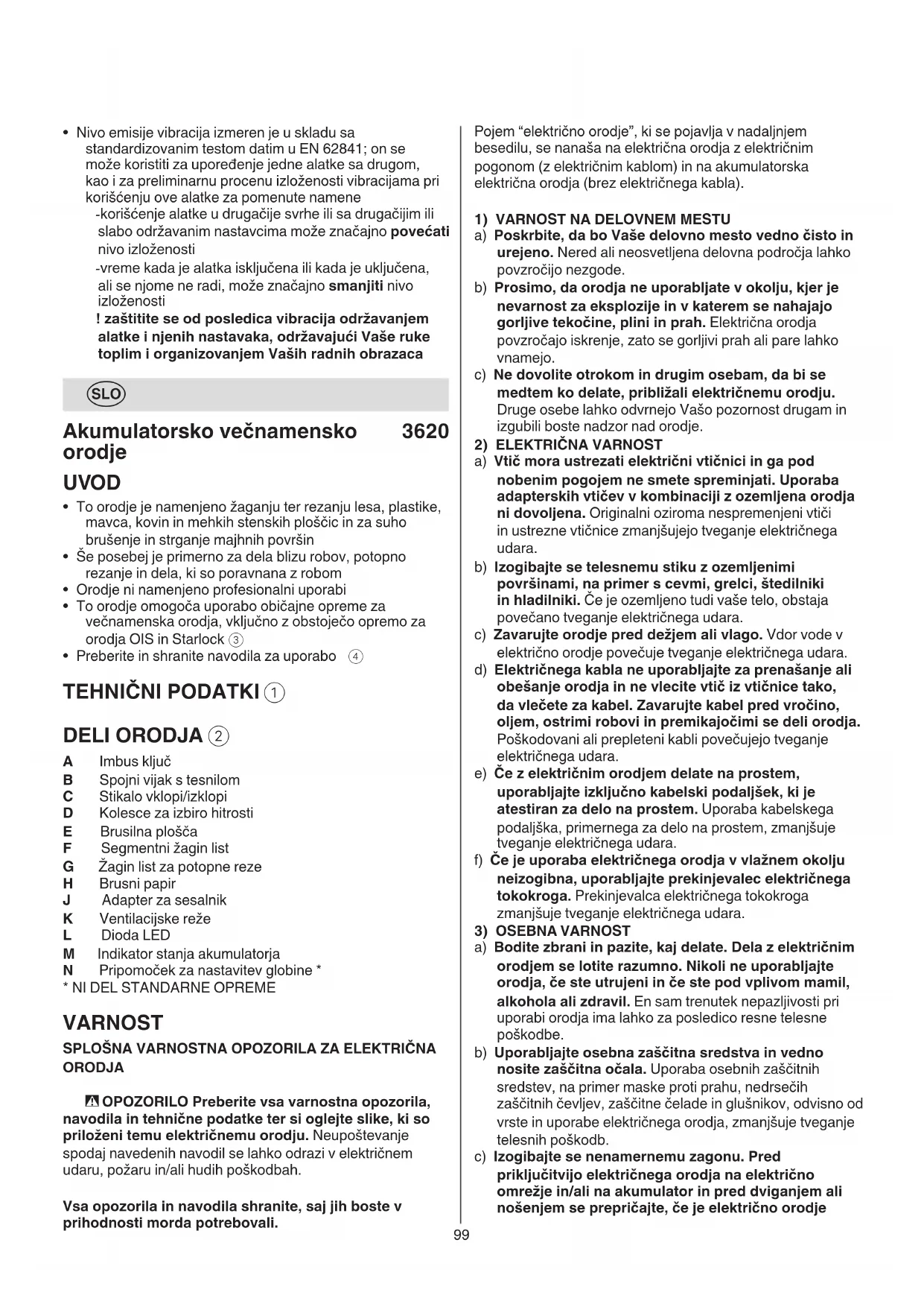 a) Ne preobremenjujte orodja. Za določeno delo uporabljajte električno orodje, ki je predvideno za opravljanje tega dela. Z ustreznim električnim orodjem boste delo opravili bolje in varneje, ker je bilo v ta namen tudi konstruirano. b) Električno orodje, ki ima pokvarjeno stikalo, ne uporabljajte. Električno orodje, ki ga ni možno vklopiti ali izklopiti, je nevarno in ga je potrebno popraviti. c) Izvlecite vtič iz vtičnice in/ali odstranite akumulatorsko baterijo, če jo je mogoče izvzeti, še preden orodje popravljate, menjujete pribor ali ga shranite. Ti preventivni varnostni ukrepi zmanjšajo tveganje za nenamenski zagon orodja. d) Kadar orodja ne uporabljaje ga shranjujte izven dosega otrok. Osebam, ki orodja ne poznajo ali niso prebrale teh navodil, orodja ne dovolite uporabljati. Električna orodja so nevarna, če jih uporabljajo neizkušene osebe. e) Vzdržujte električna orodja in pribor. Preverite, če premikajoči se deli orodja delujejo brezhibno in če se ne zatikajo, oziroma, če kakšen del orodja ni zlomljen ali poškodovan do te mere, da bi oviral njegovo delovanje. Pred nadaljnjo uporabo je potrebno poškodovani del popraviti. Vzrok za številne nezgode so ravno slabo vzdrževana električna orodja. f) Rezalna orodja naj bodo ostra in čista. Skrbno negovana rezalna orodja z ostrimi rezili se manj zatikajo in so bolje vodljiva. g) Električna orodja, pribor, nastavke in podobno uporabljajte v skladu s temi navodili. Pri tem upoštevajte delovne pogoje in vrsto dela, ki ga nameravate opraviti. Zaradi uporabe električnega orodja v druge, nepredvidene namene, lahko nastanejo nevarne situacije. h) Ročaji in površine za prijemanje naj bodo suhe, čiste in brez olja ali maščobe. Gladki ročaji in površine za prijemanje ne omogočajo varne uporabe in nadzora orodja v nepričakovanih situacijah.101